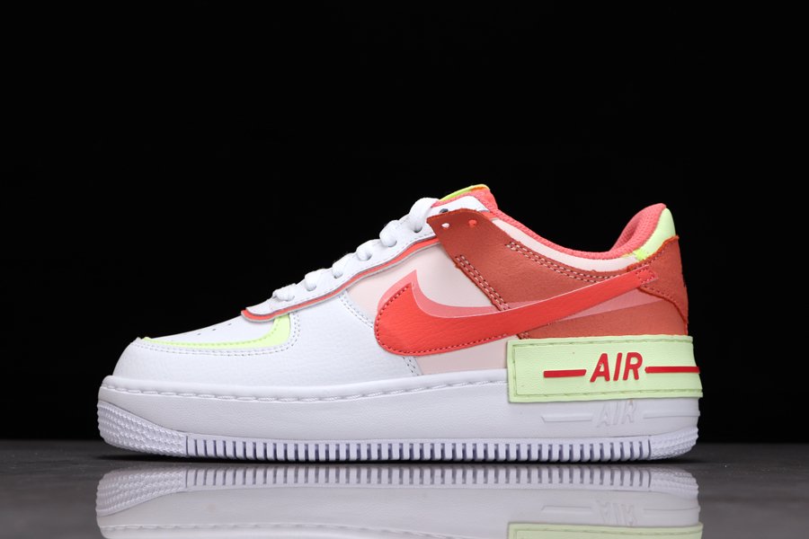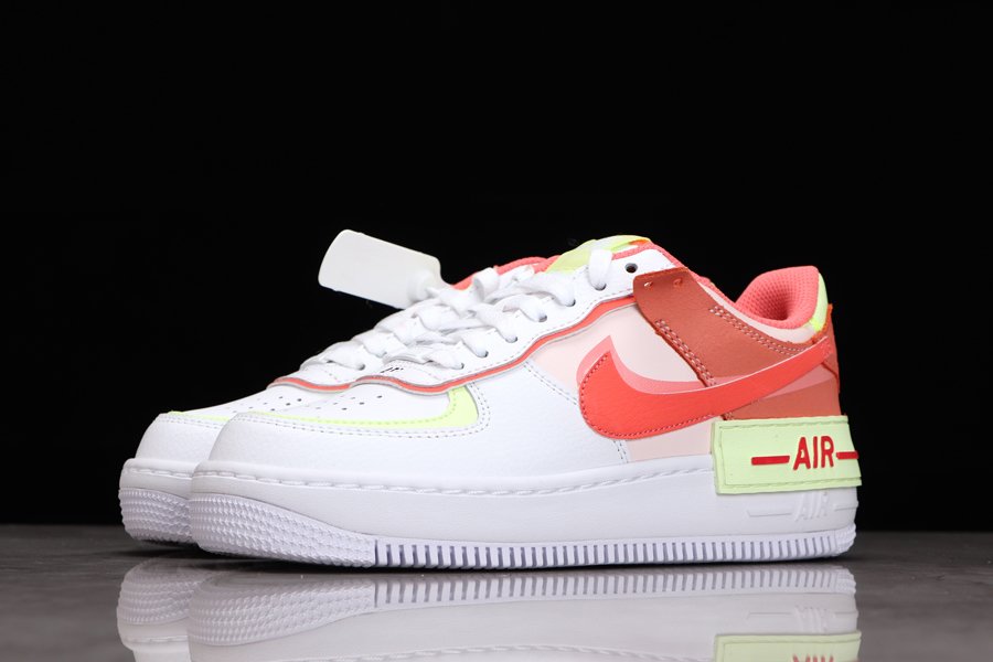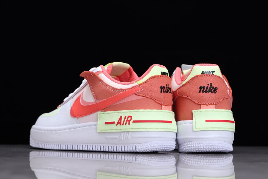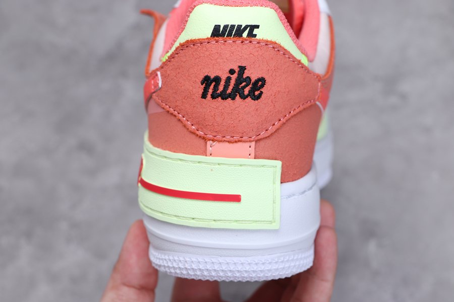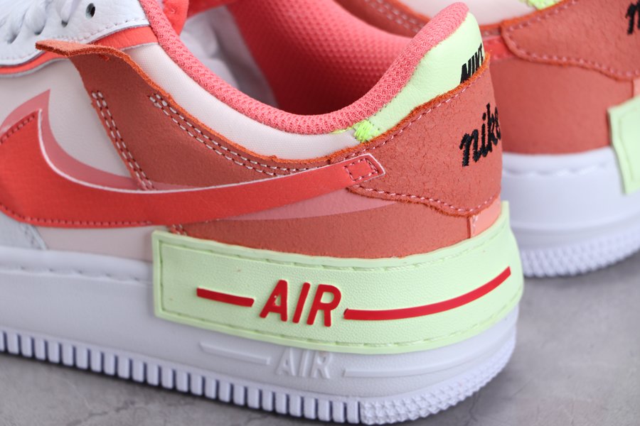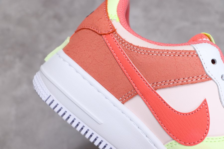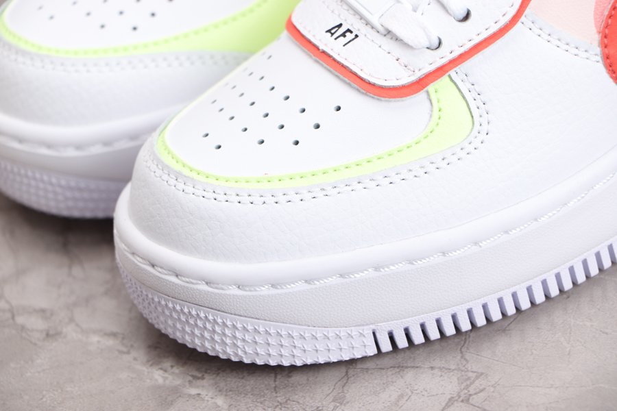 The Nike Air Force 1 Shadow comes crafted in a mixture of colours and textures, with a crisp tumbled leather dressing the front of the sneaker. Boasting a layered look, that doubled-up Nike Swoosh sits pink on both side panels, with further shadowing continuing throughout the upper. Laces come clean in white, while muted lime accents enter the mix via the toe area, tongue and heel. Rounding off the design, further Nike branding can be spotted on the tongue and heel,, with that chunky white midsole sitting beneath the feet for the perfect amount of elevation.