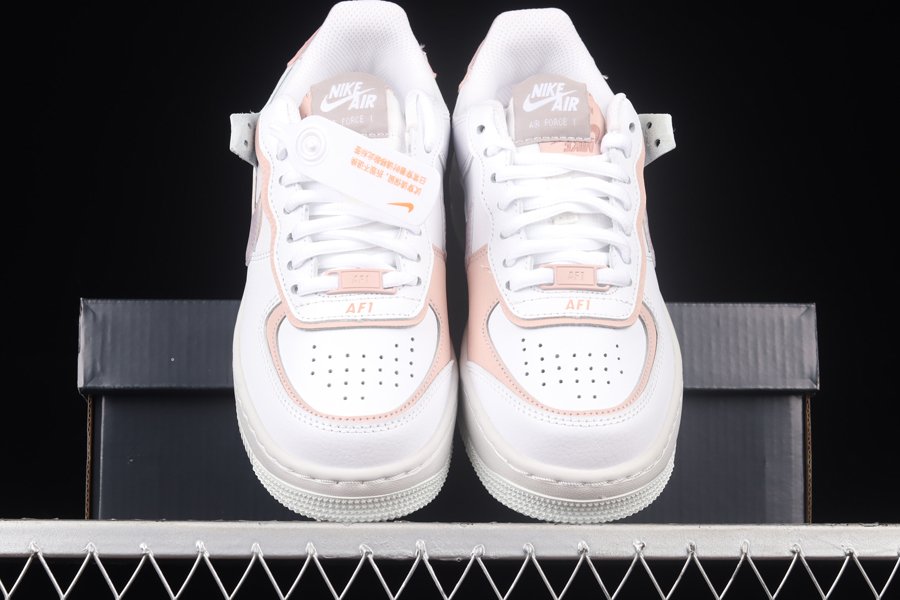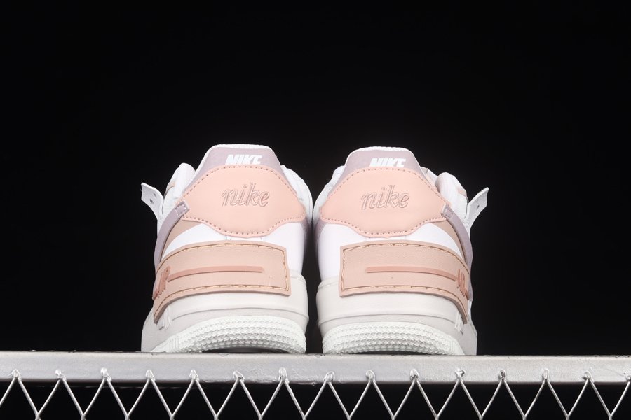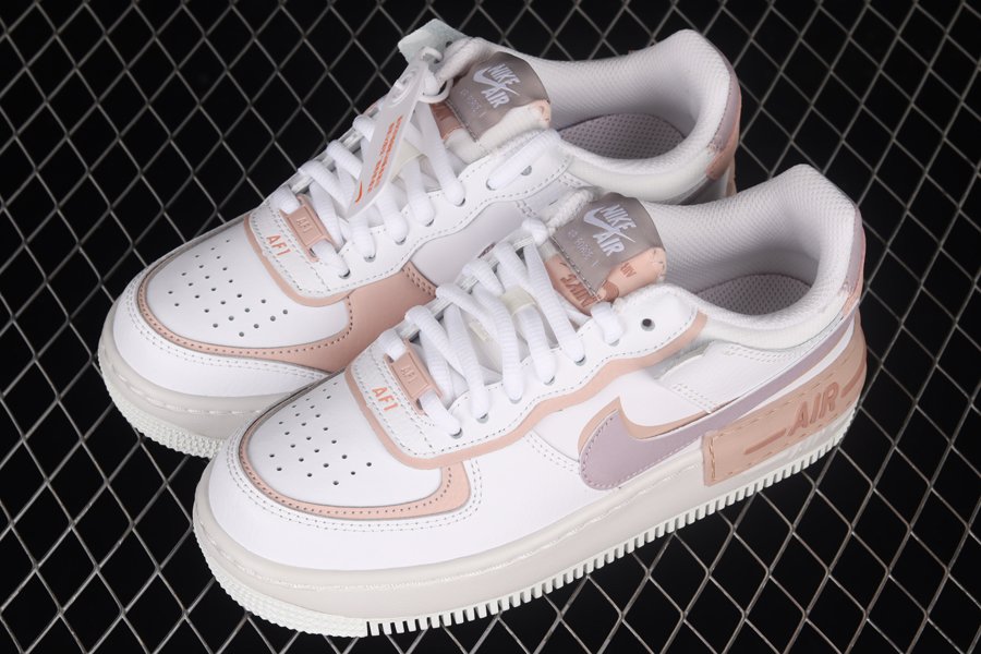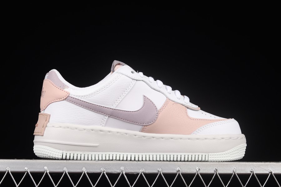 This color option of the Nike WMNS Air Force 1 Shadow starts off by being covered in a White leather all throughout the upper with soft pastel hues of pink and purple placed on all the double layer detailing which appears on the toe, eyestay, Swooshes, tongue, heel and midsole overlay. More white then hits the laces, inner liner, and the entire rubber sole unit to finish things off.