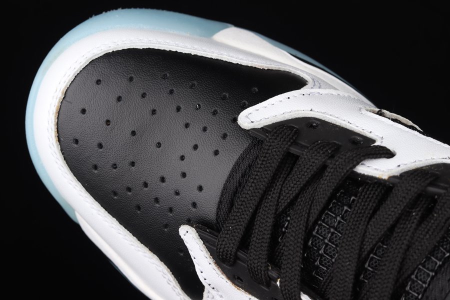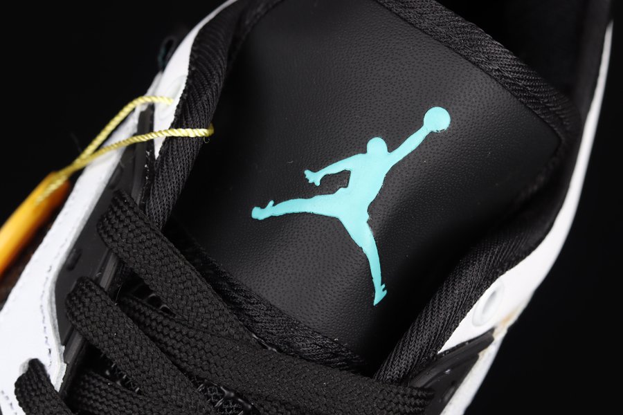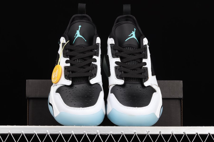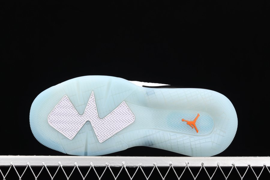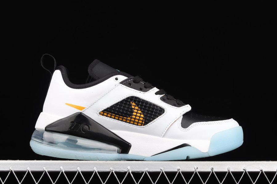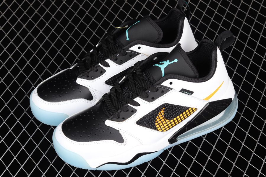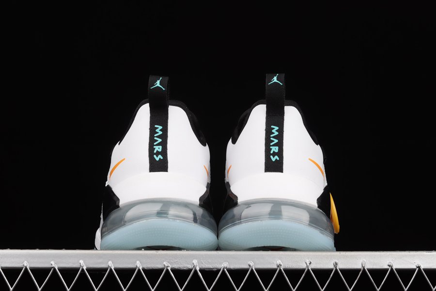 The Jordan Mars 270 Low seen above takes on a neutral upper with bright pops of color. The low top model gets done in a simple black and white leather construction on the upper which is then contrasted by orange Swooshes on the side panels and aqua detailing on the branding that appears on the tongue, insoles, and heels. A white midsole, a blue tinted Air Max 270 bag on the heel, and an icy translucent outsole complete the look on this Jordan Mars 270 Low.
