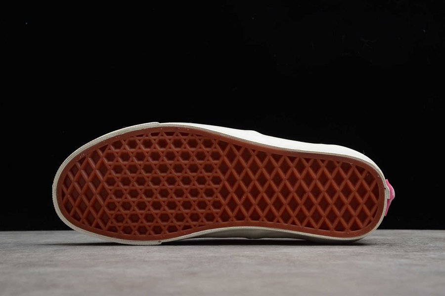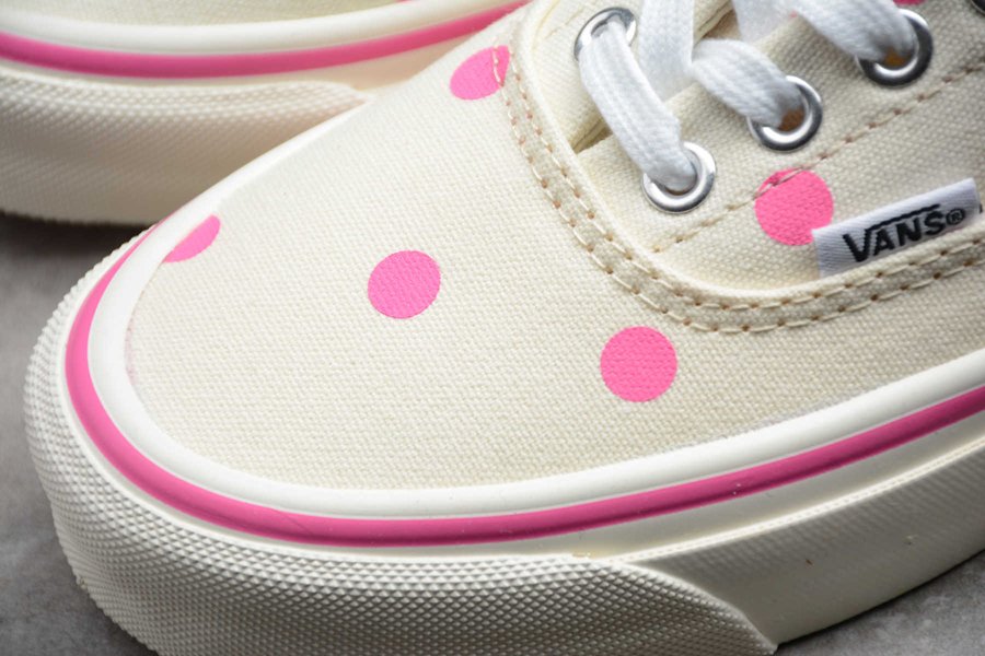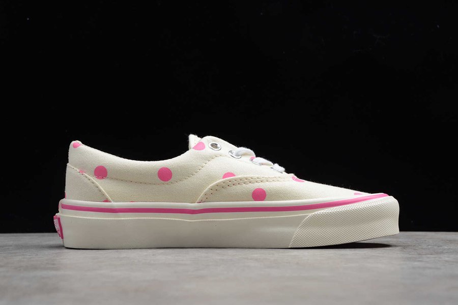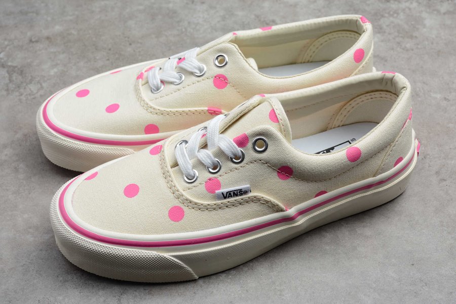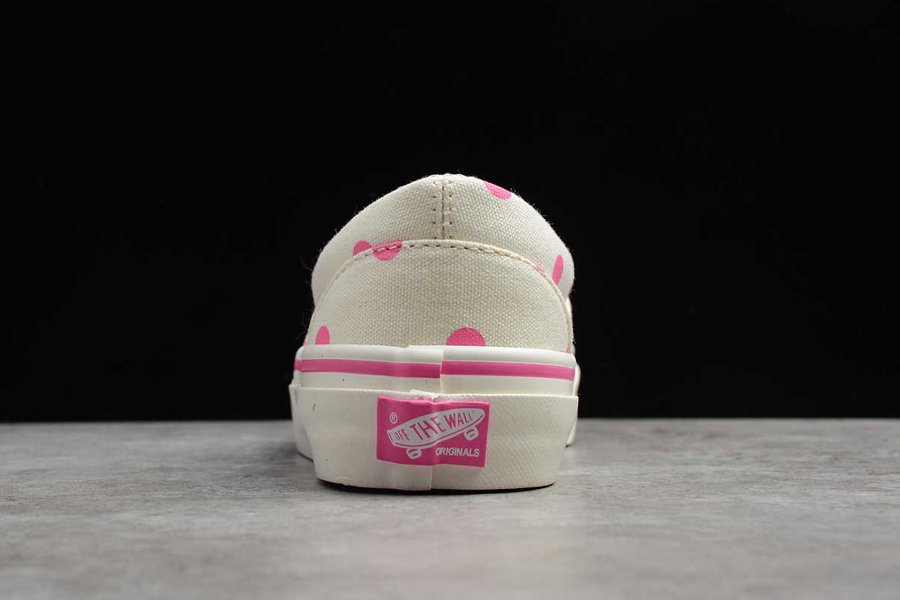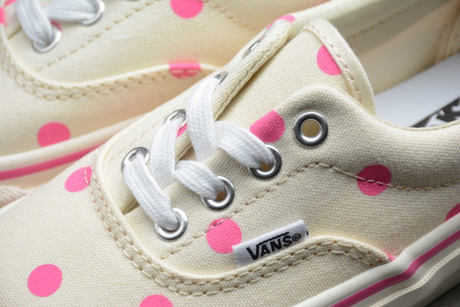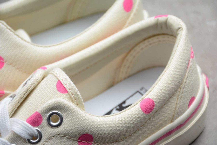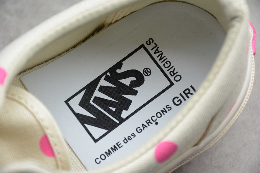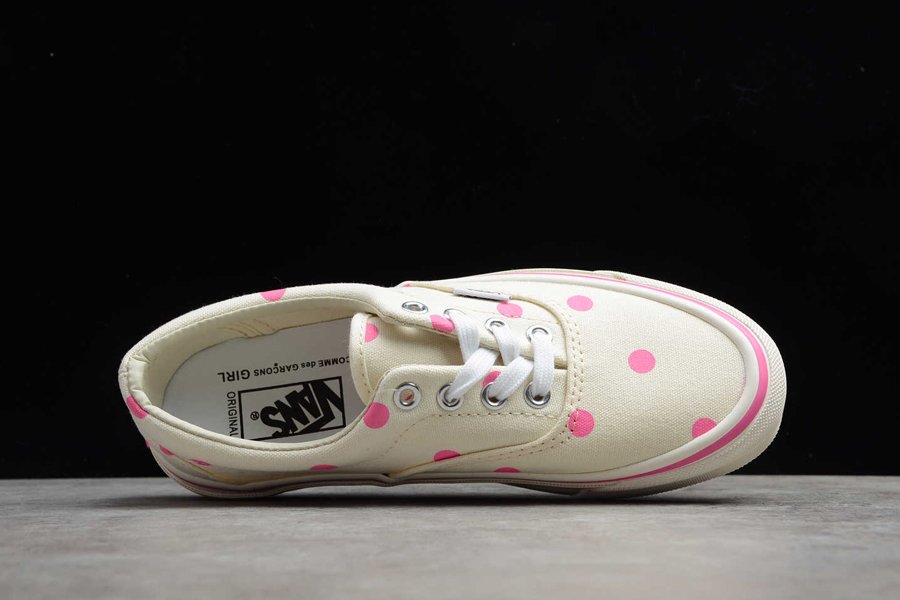 The COMME DES GARÇONS Girl Vans applies small pink polka dots to an off-white base. The midsole remains all-white, save for the same pink Vans logo at the heel.