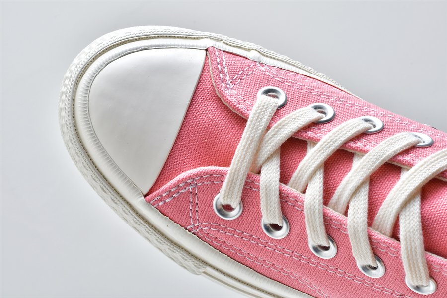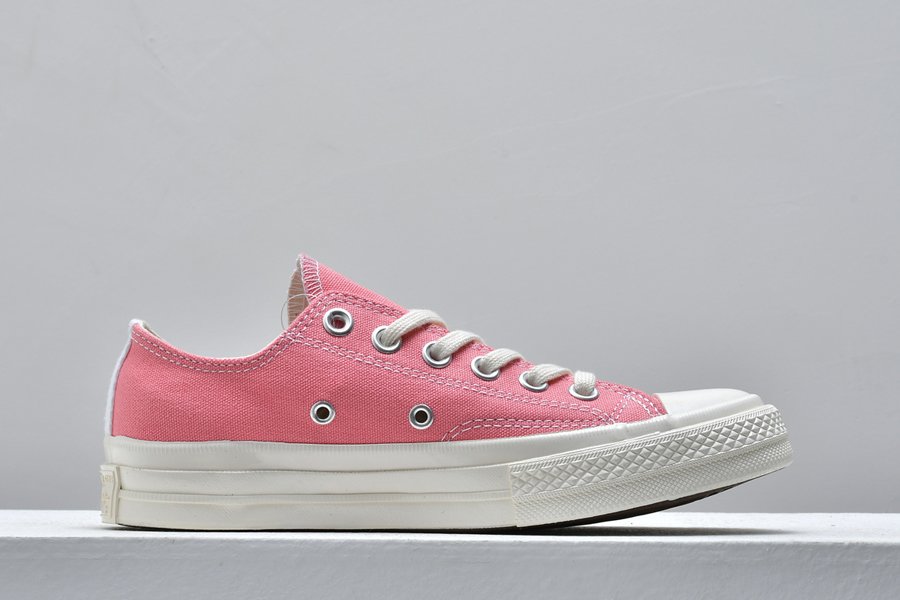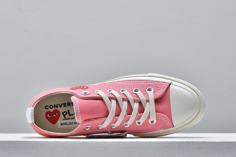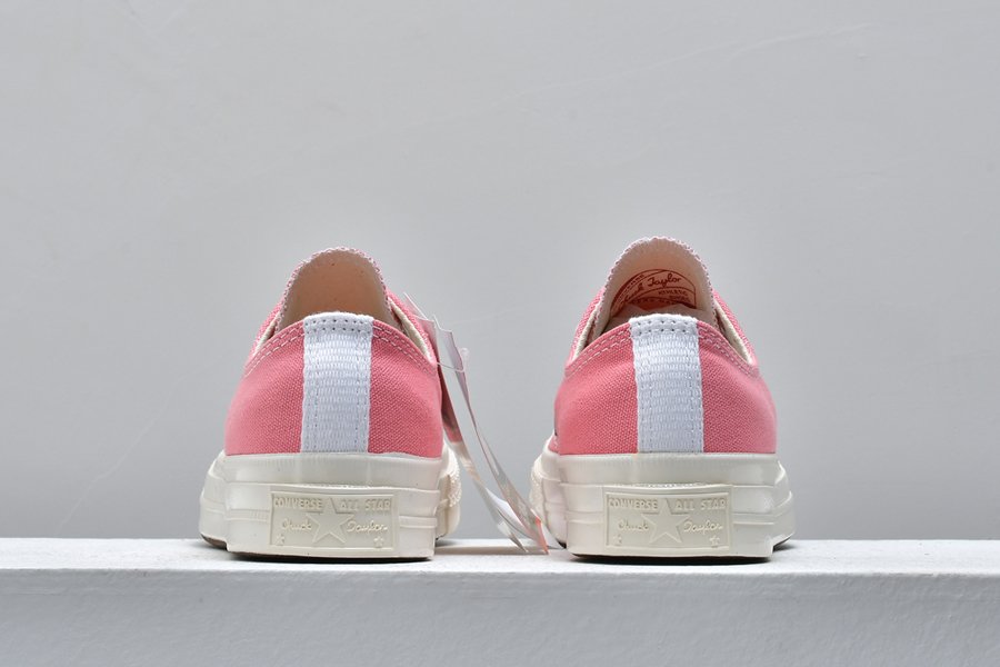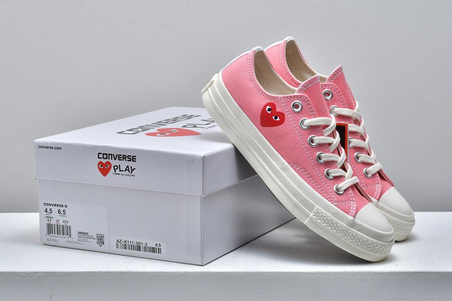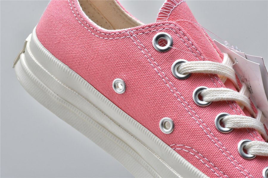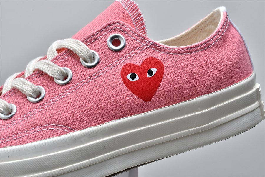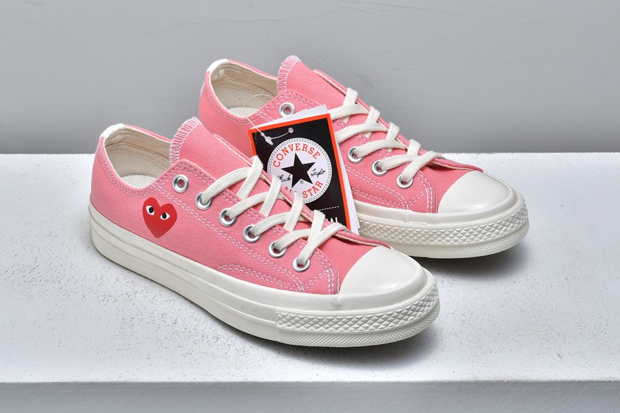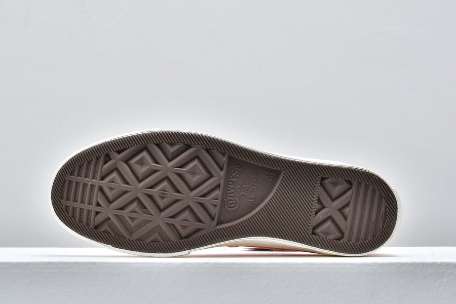 The pastel and soothing spread of pink hues cover the entire canvas upper body thoroughly. As a result, the fashion label, Comme des Garcons signature heart logo pops up brightly and boldly from the sidewall. Salmon pink on the durable construction doesn’t scale down the robustness of the walls. You can jump and stomp as much as you want, these flexible yet strong walls will keep your feet safe and snug. The crisp vanilla white on the laces and the safety toe-cap (vulcanised) join with the traditional Converse Chuck Taylor midsole. Finally, the dual brandings on the insole complete the look.