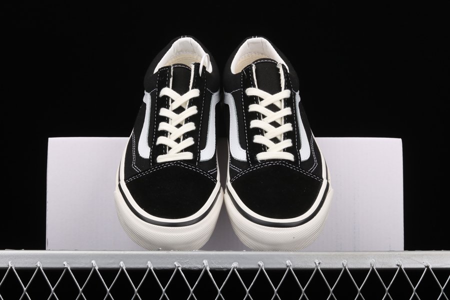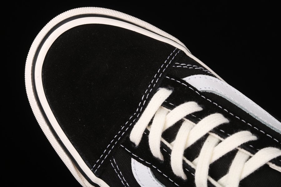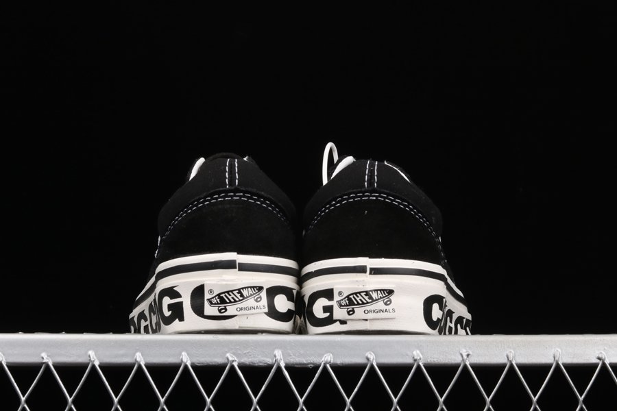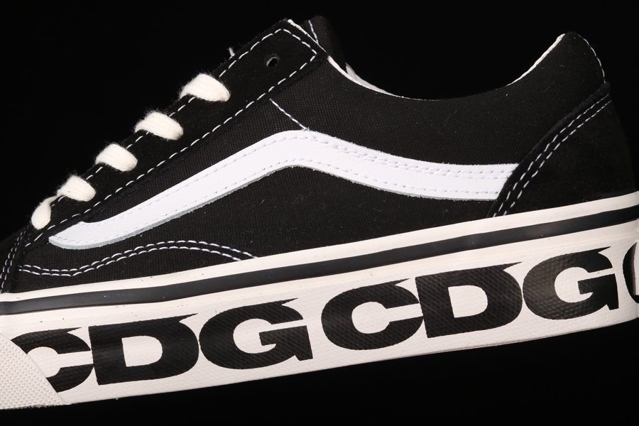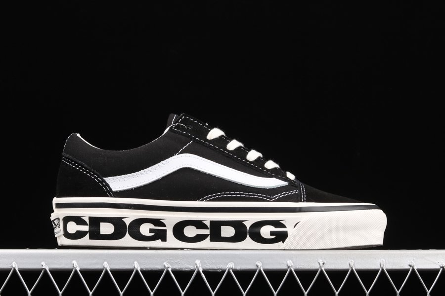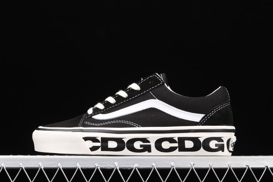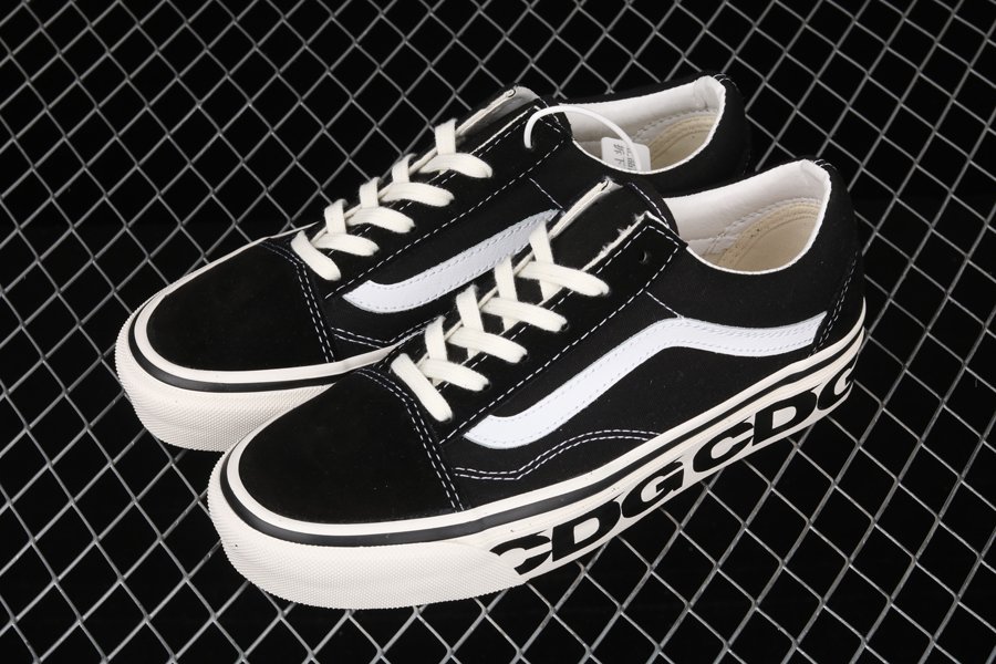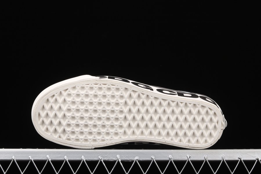 The Comme des Garcons x Vans Old Skool “Sidewall” is a special collaboration between the Japanese high fashion house and the California shoe manufacturer on the legendary Old Skool silhouette. The Old Skool, revered by the skateboarding community and beyond, is a foundational style in Vans’ collection of timeless canvas-and-rubber sneakers. Here, “CDG” keeps the original look of the Old Skool intact by moving forward with the model’s black suede toe and heel and black canvas mid-panel. White contrast stitching outlines each panel on the upper and a white jazzy leather stripe appears on either side of the shoe. Thick white laces are layered over the black nylon tongue. Underfoot, the white rubber vulcanized midsole features repeating Comme des Garcons branding. A gum waffle outsole provides ample grip.