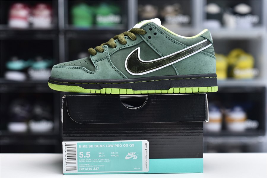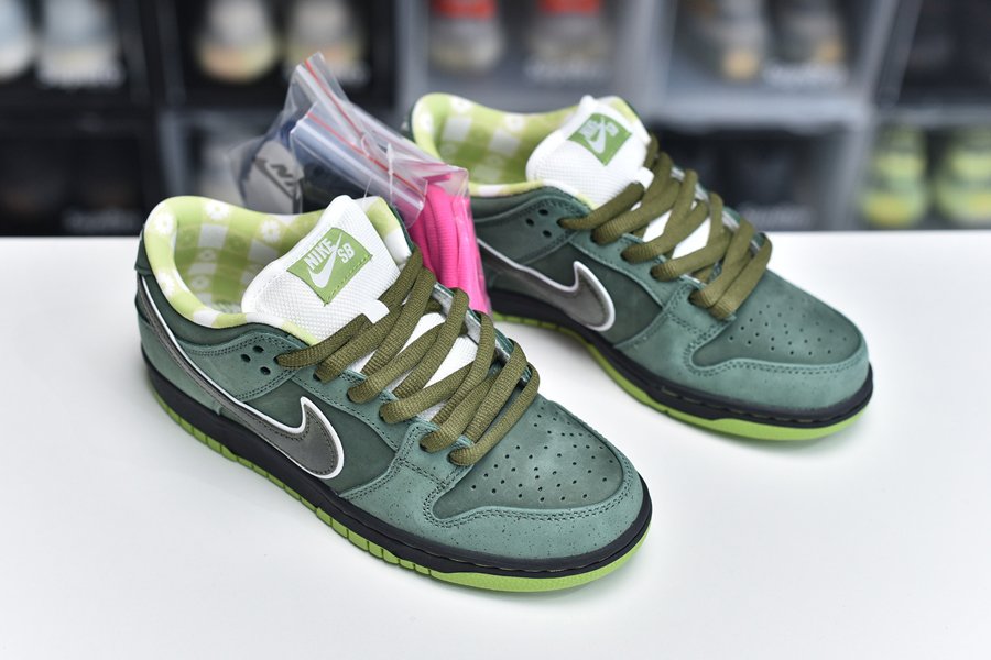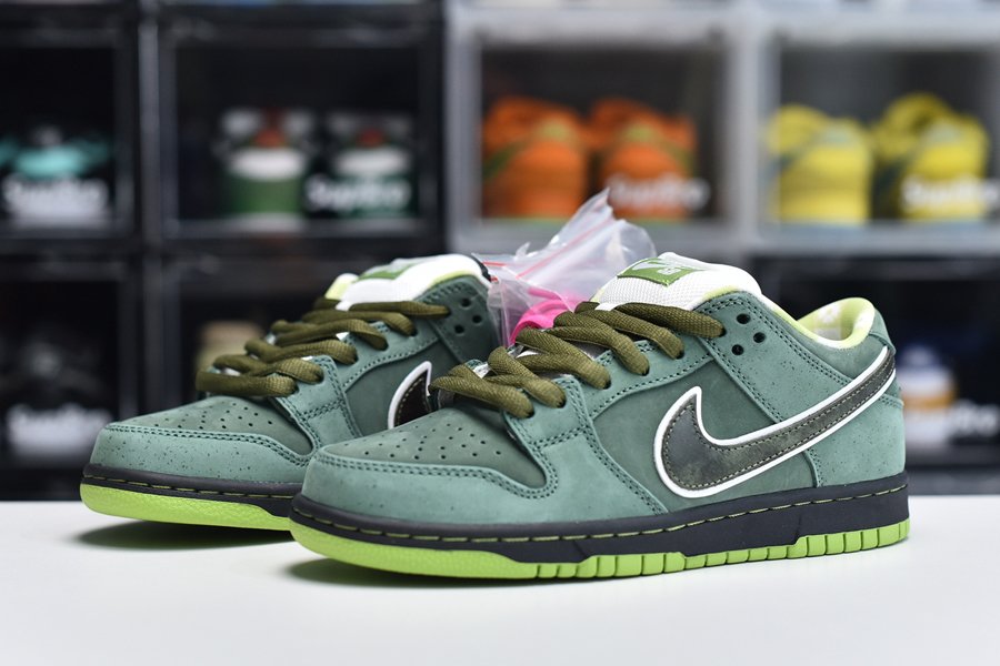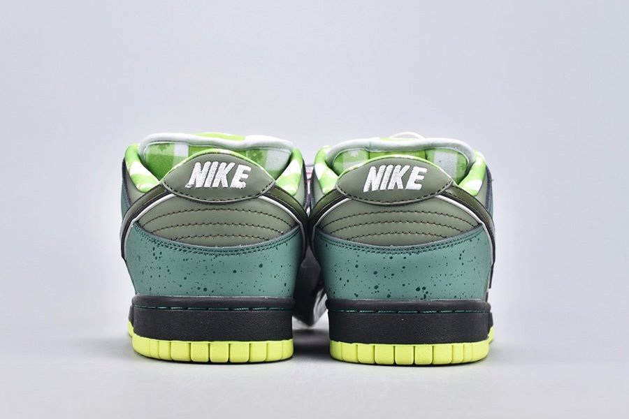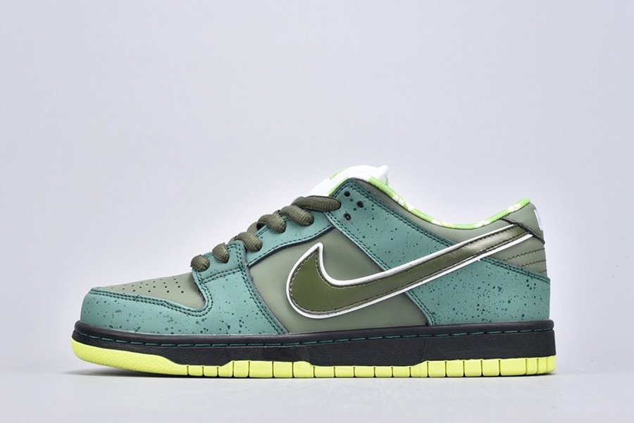 The Concepts x Nike SB Dunk Low Green Lobster features a mixture of green hues across its suede upper with contrasting white lining for the Swooshes and a black midsole. Other details include olive laces, checkerboard lining, white Nike branding on the heel tabs and a lime green rubber outsole to top it all off.