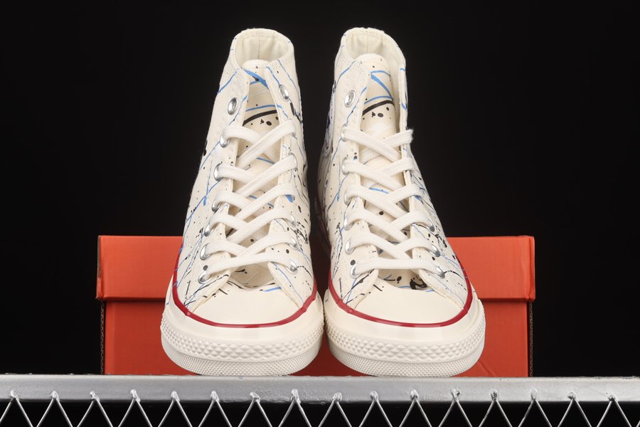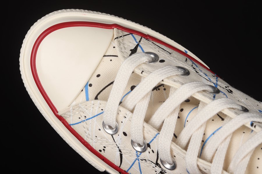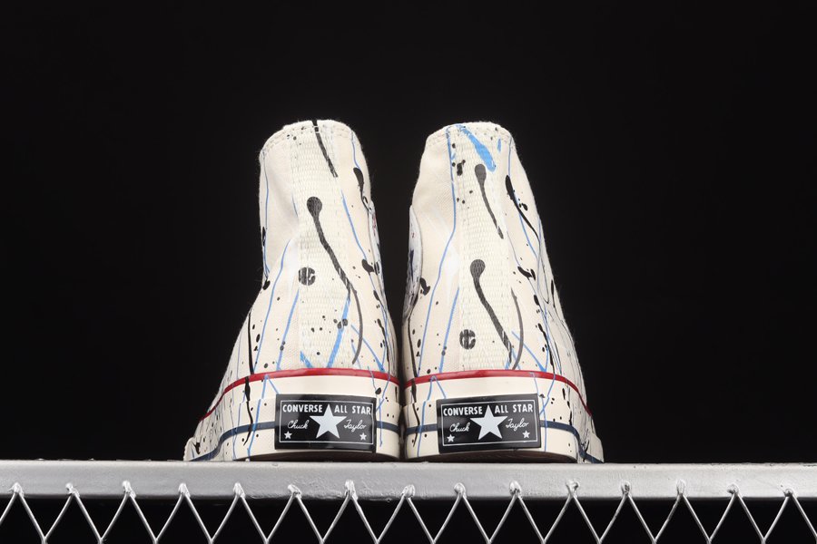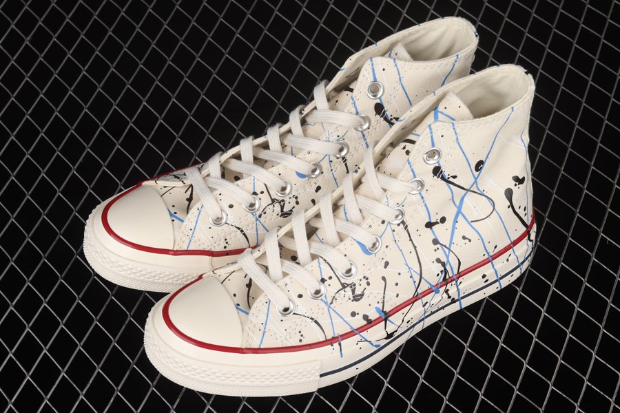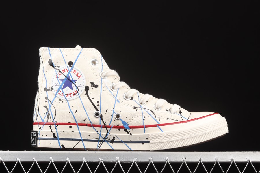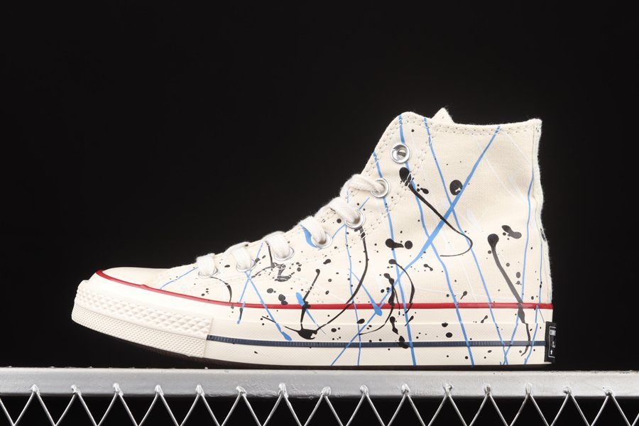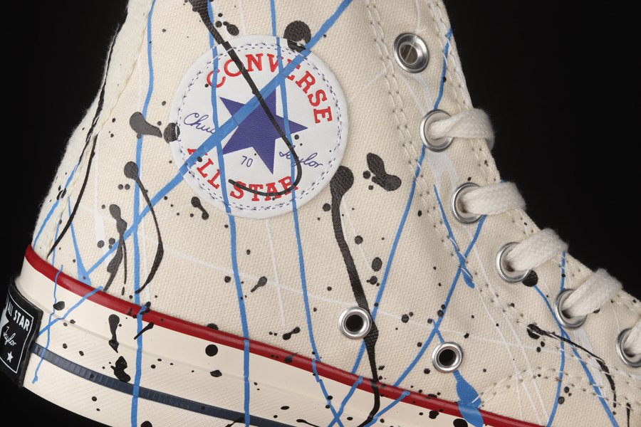 The latest Converse release is the Chuck 70 Hi Natural Paint Splatter sneaker This high-top pair comes with a Jackson Pollock-esque paint splatter graphic, spread across the white canvas. These splashes, dots and lines leave no part of the upper untouched, running from the heel right up to the rubber toe.