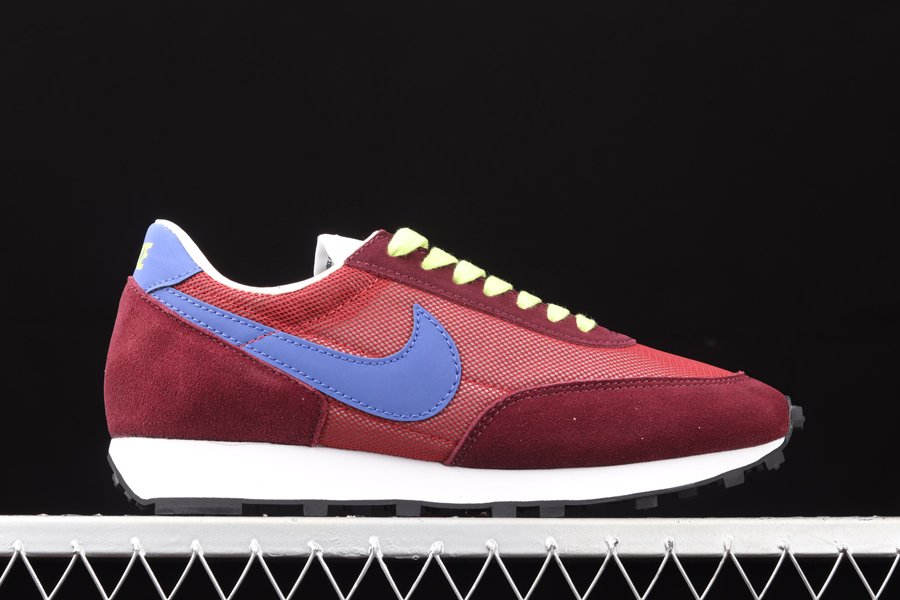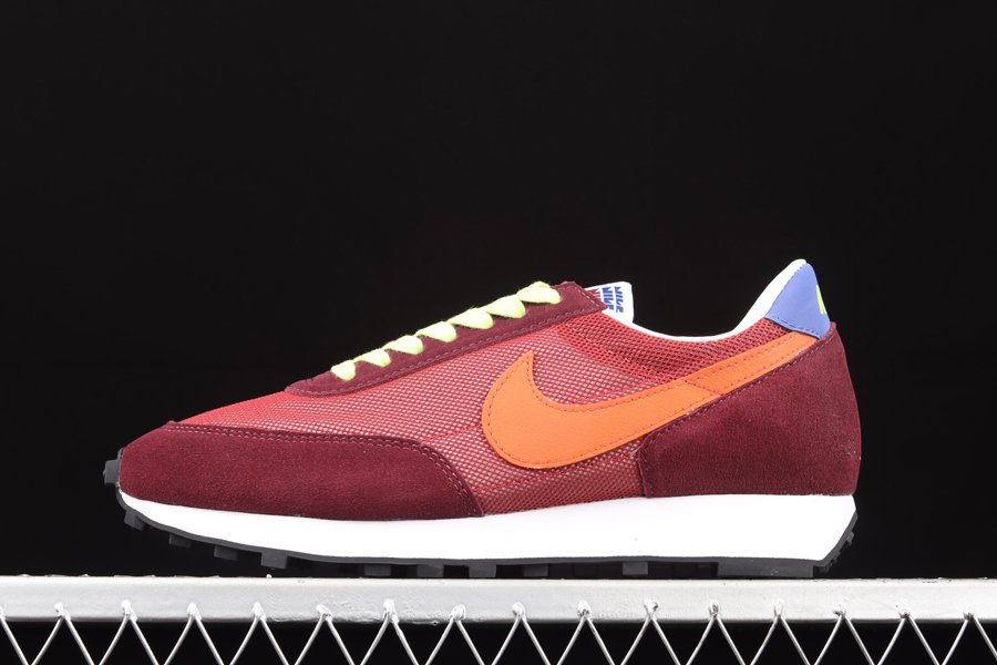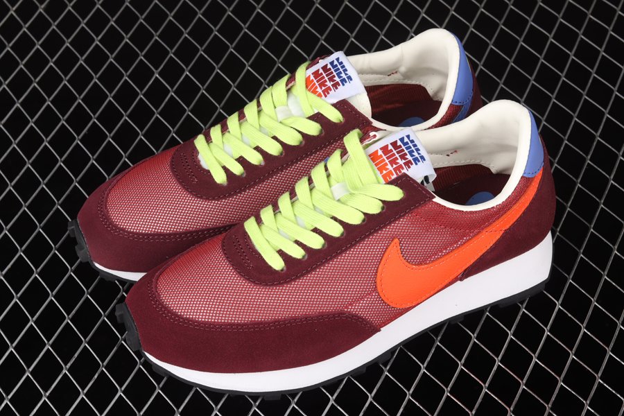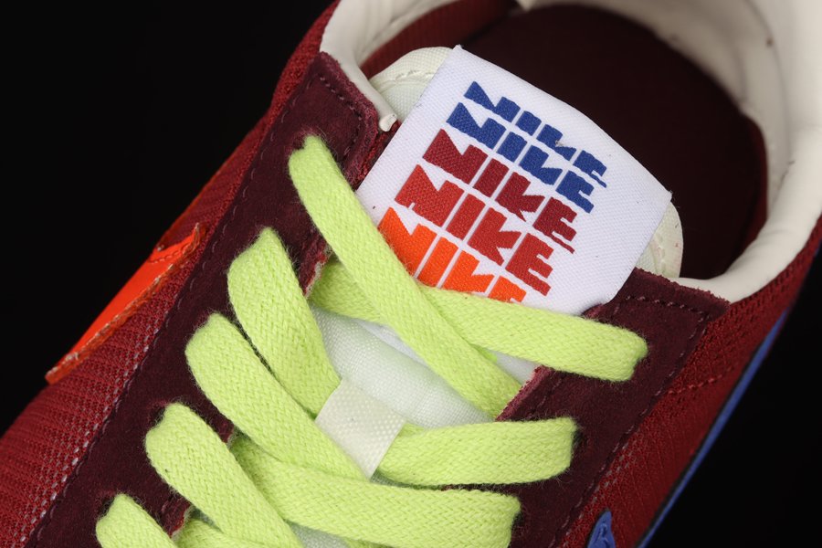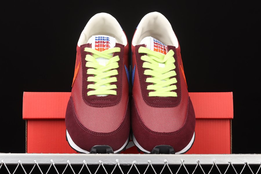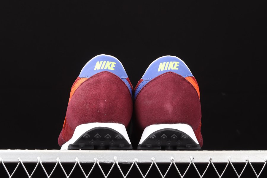 This offering comes dressed in a Cedar, Team Orange, and Night Maroon color scheme. It features a Maroon mesh and suede upper highlighted with Orange leather Swoosh logos on the sides, a Blue heel with Neon text and matching laces.
