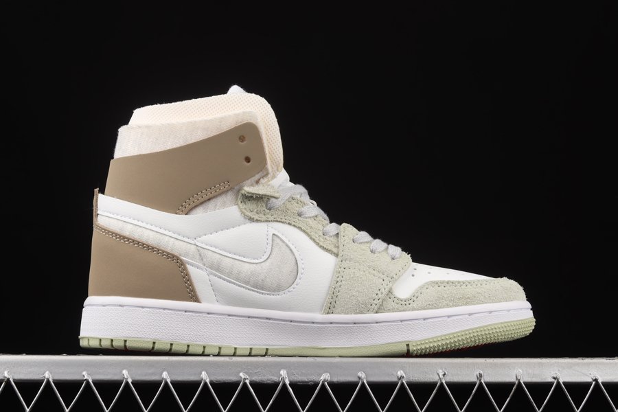 The Air Jordan 1 Zoom CMFT sports a smooth white leather base accented with nubuck leather and shaggy suede overlays swathed in the titular hue, along with a complementing “Khaki” tone. Featured on the medial and lateral walls are signature cut-out Swoosh insignias, while a padded tongue and ankle color help to add the finishing touches. Down below is a white midsole and two-tone rubber outsole.