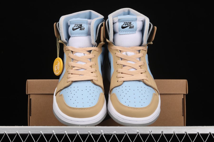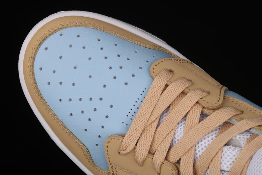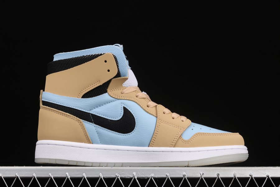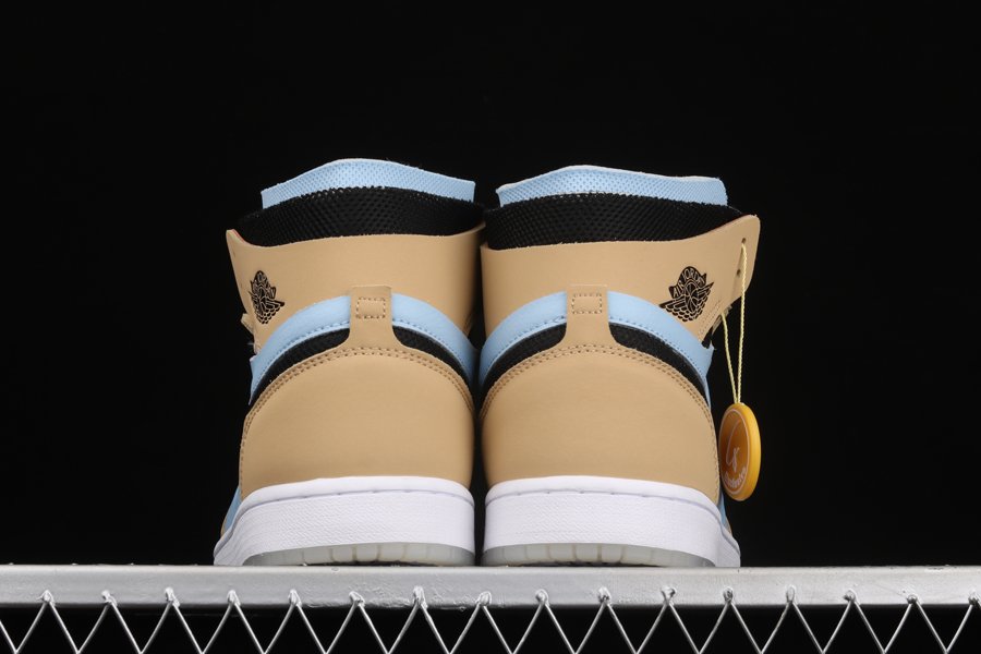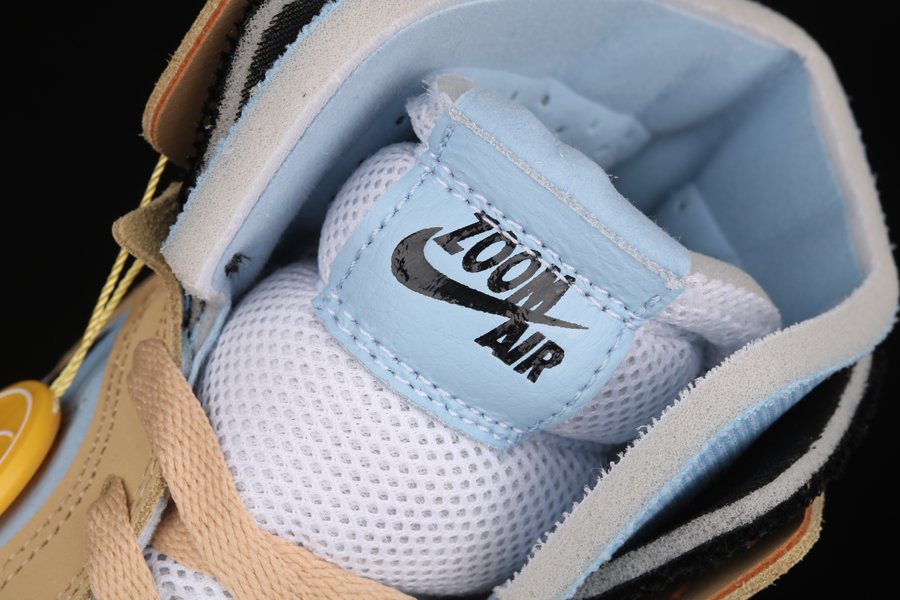 This rendition is primarily arranged in three striking colourways, Psychic Blue which flaunts a soft blue shade seen on the tumbled leather toe boxes and quarters, a sandy beige hue dressing the panels around the toes, eyestays, collar, and heel, and black seen through the cutout Swoosh logos.