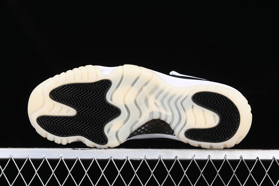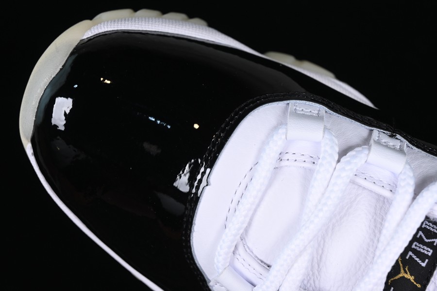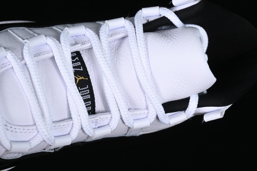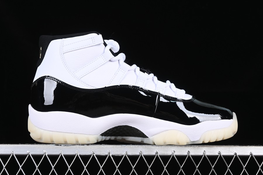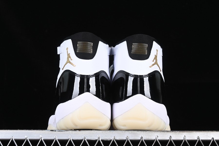 The Air Jordan 11 “DMP” in this edition boasts a color scheme featuring White, Black, and Metallic Gold. Its upper is crafted from white leather, complemented by black patent leather accents that encircle the shoes. Notably, the Metallic Gold branding adds a striking touch. In the 2023 release, this version introduces a high-cut patent leather, a first for this particular colorway, and replaces the mesh upper with leather. Additional features include a white midsole and a clear, icy rubber outsole. Essentially, these sneakers pay homage to the classic ‘Concord’ Air Jordan 11 but incorporate Metallic Gold details for a unique twist.