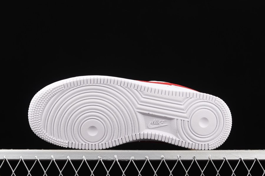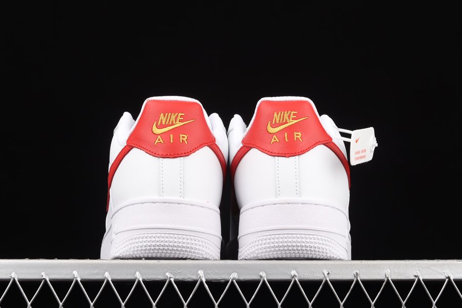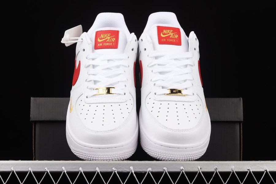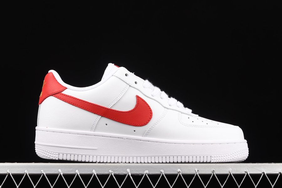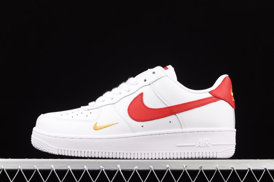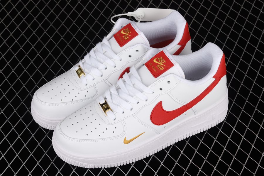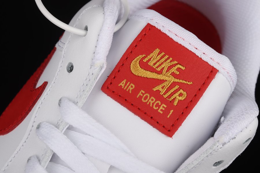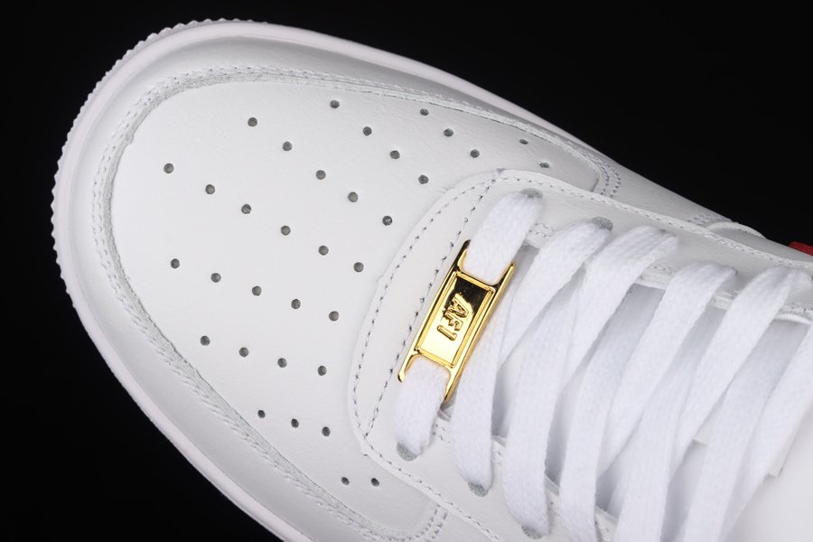 This offering for the Nike Air Force 1 features a White leather upper paired with Gym Red leather Swooshes, heels, tongue labels and insoles. Highlighting the shoe are Gold branding and lace dubraes completed with a solid White AF1 rubber sole.