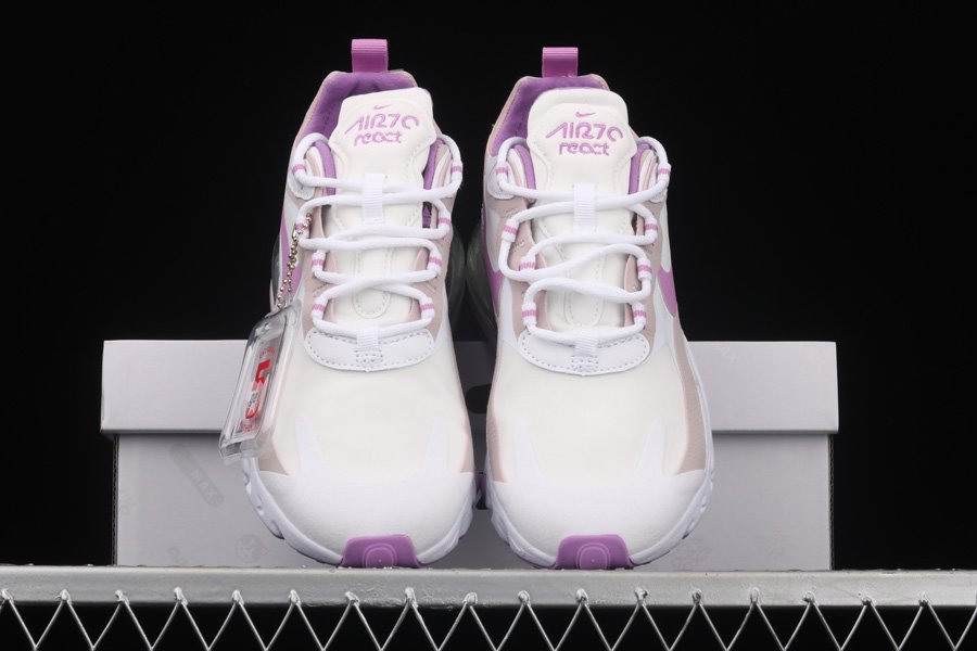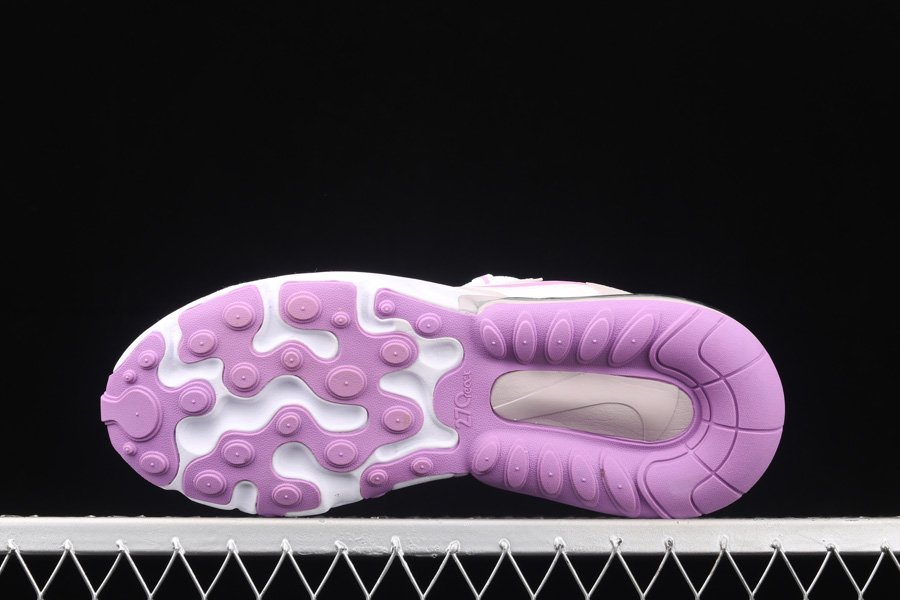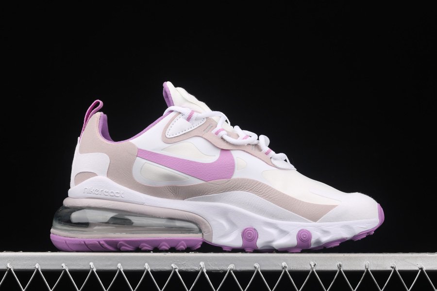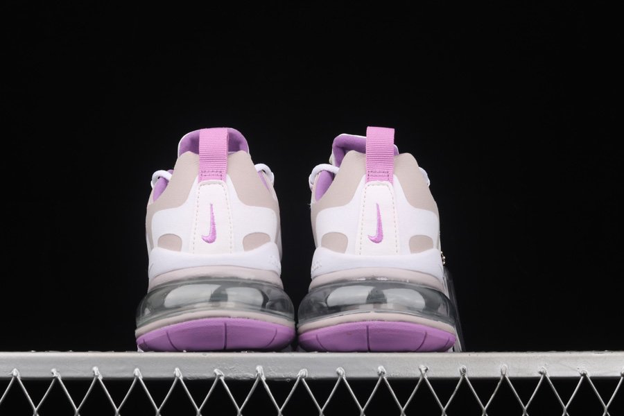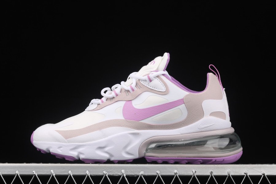 This edition of the Nike Air Max 270 features a predominantly White base with suede overlays along the eyestays, mudguard and heel area. Highlighting the shoe are Pink contrasting accents on the tongues, lace loops, inner lining, heel pull tab, Swooshes, and rubber outsole completed with its signature White React cushioned midsole.