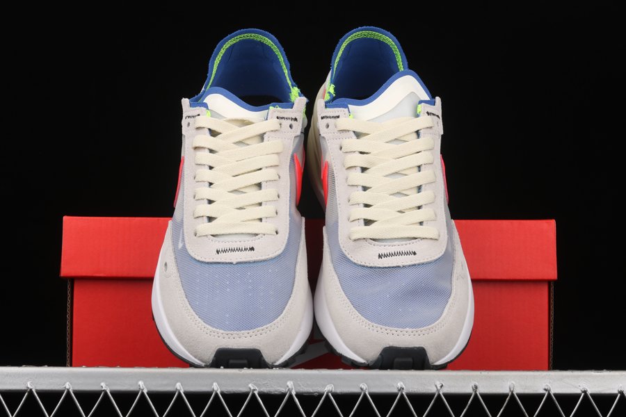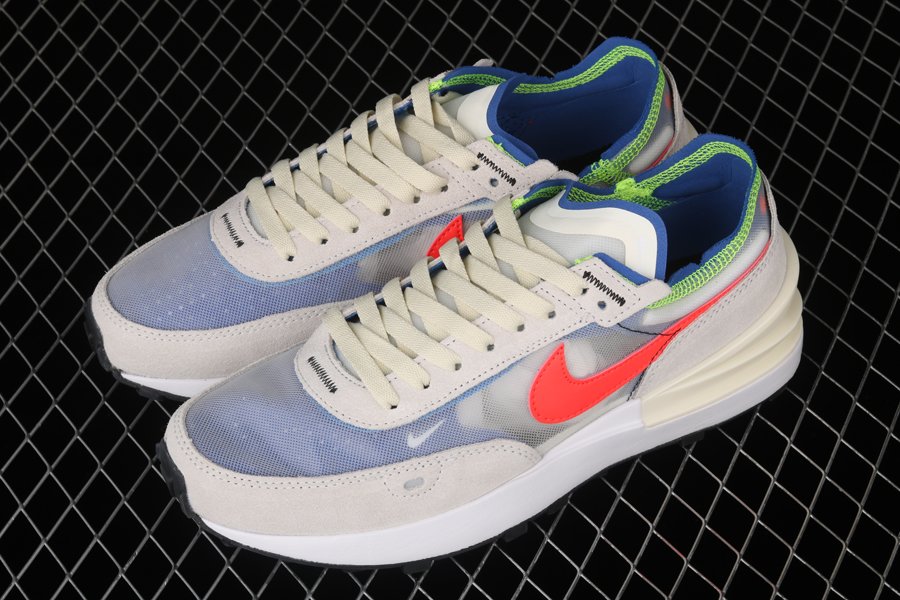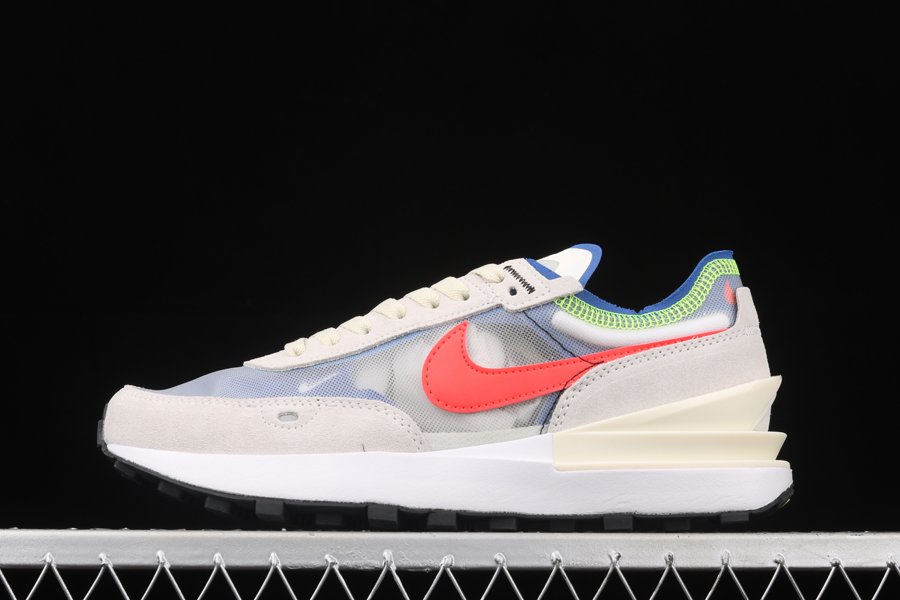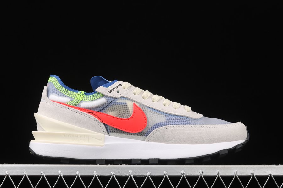Dressed in a Coconut Milk, Hyper Crimson, and Hyper Royal color scheme. This Nike Waffle One comes constructed with a transparent mesh upper, suede overlays along with leather used on the Swooshes. A White midsole atop a Black waffle rubber outsole completes the design.