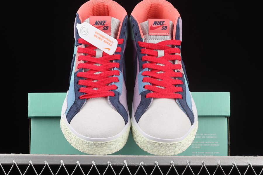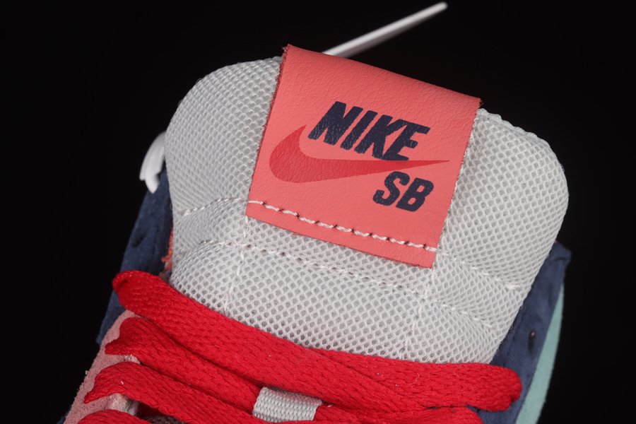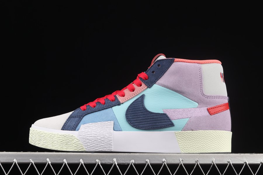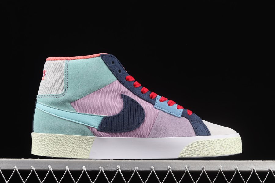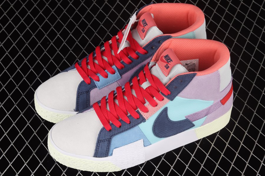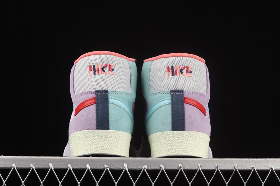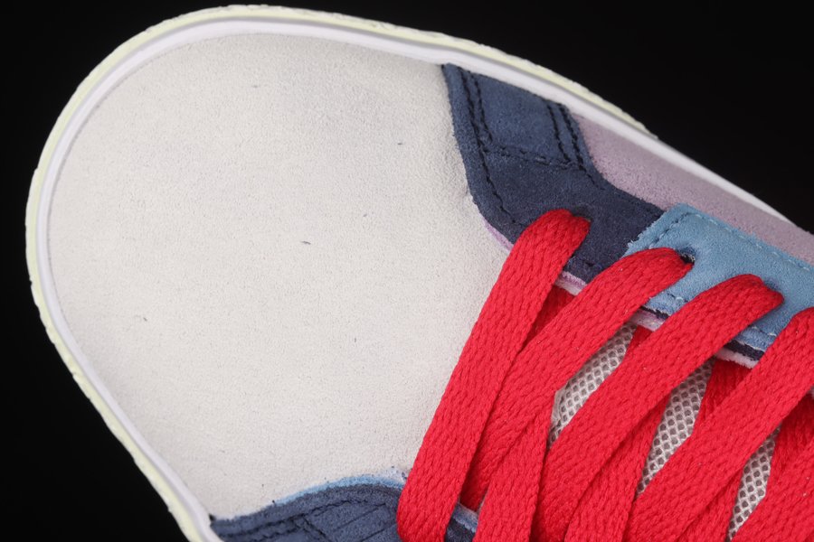 There’s definitely no shortage of color to be had here: everything from purple to clay red to bright red, navy and gray appear across the upper. Notable pieces include purple and red heel detailing that calls to mind images of the Dunk Low “Plum,” plus two-tone Swooshes. Materials used range from soft suedes to textured corduroy and supple leather, while an interesting visual effect is provided by discordant Swoosh and eyestay pieces that jut out farther than their counterparts. Even the midsole gets in on the action with multiple white and gray tones of its own, though when facing off with the upper’s wild style it seems calm by comparison.
