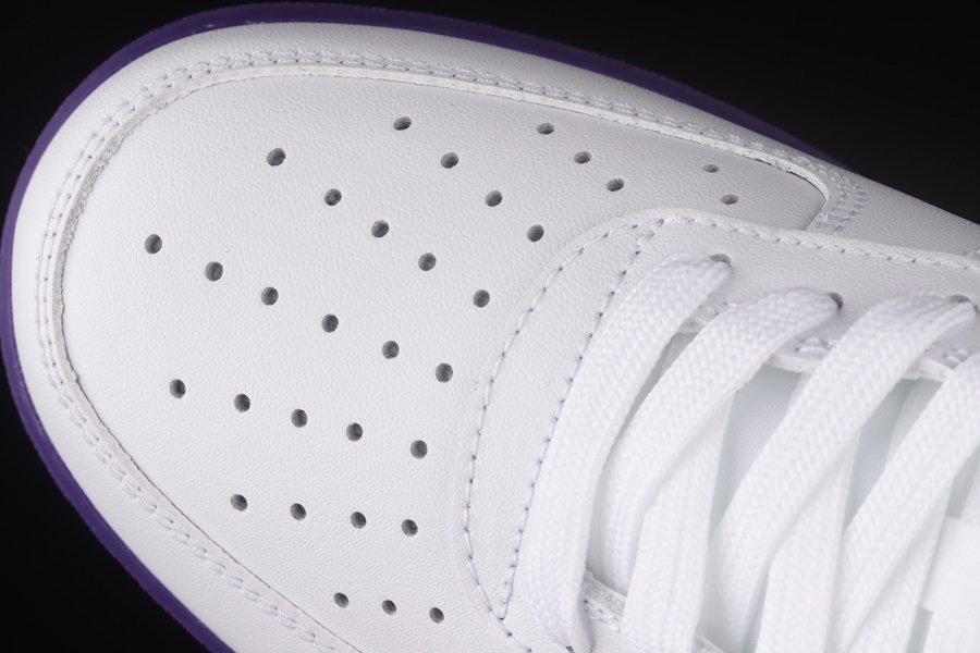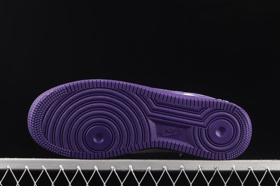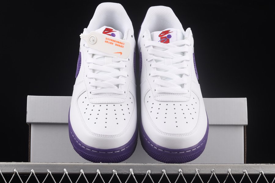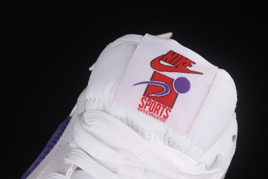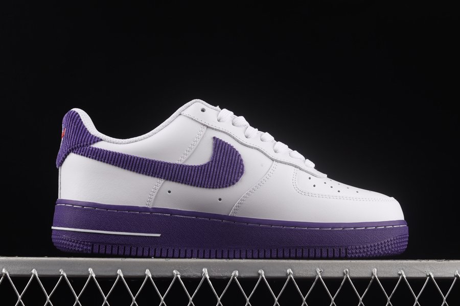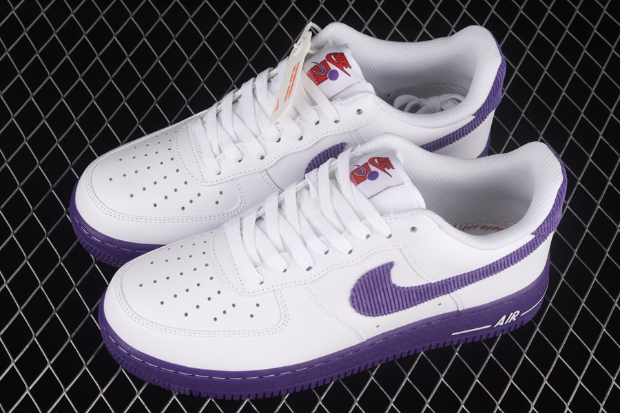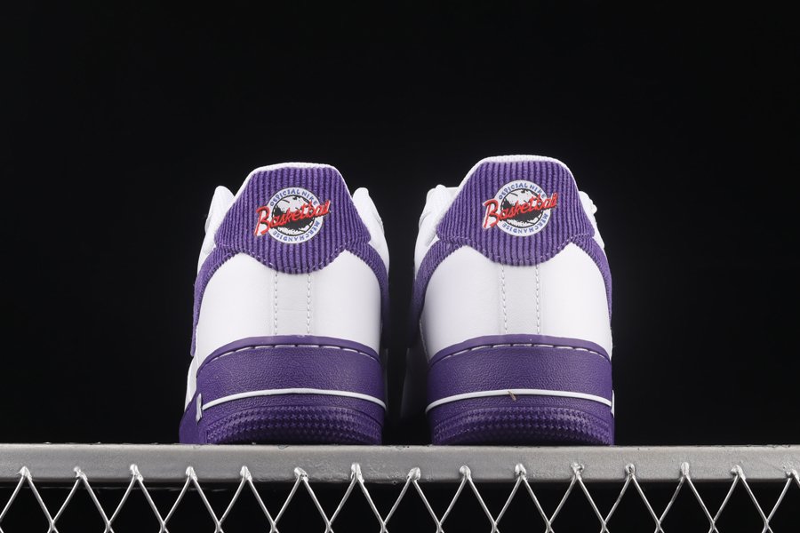 This Nike Air Force 1 features White leather on the upper while a Purple corduroy Swoosh lands on the panel, and the same shade and material covers the heel. Next, we have a patch on the heel that reads ‘Official Nike Basketball Merchandize,’ and the tongue label features the Sports Specialties logo with Nike branding. Other highlights include a graphic on the insole that reads ‘One Size Fits Most’ and a Purple rubber outsole.