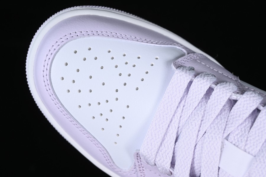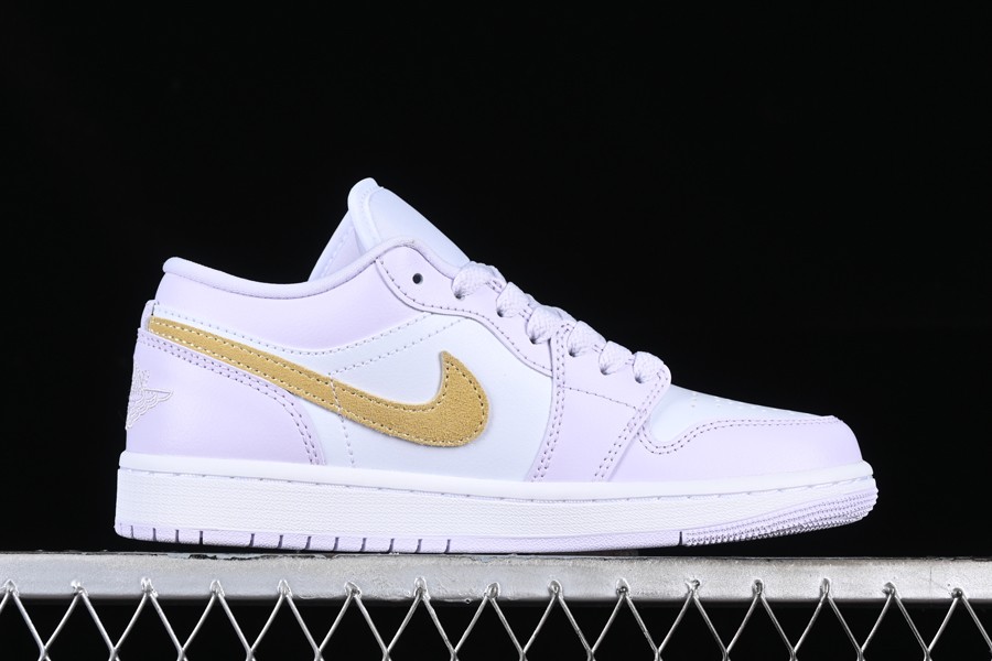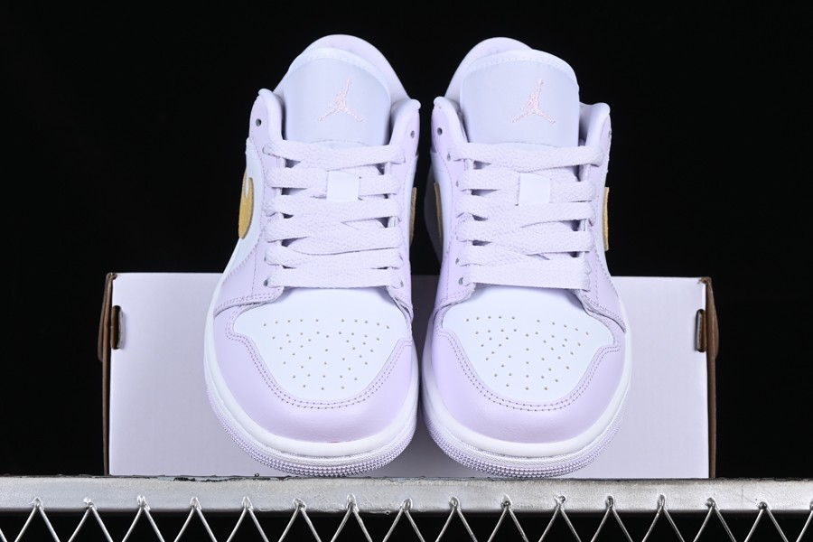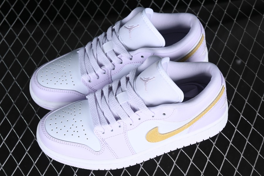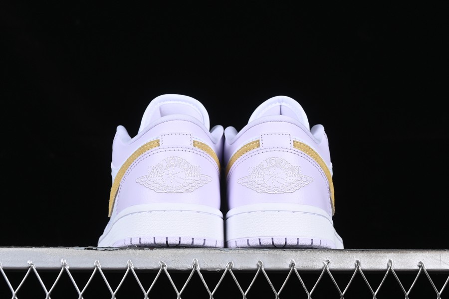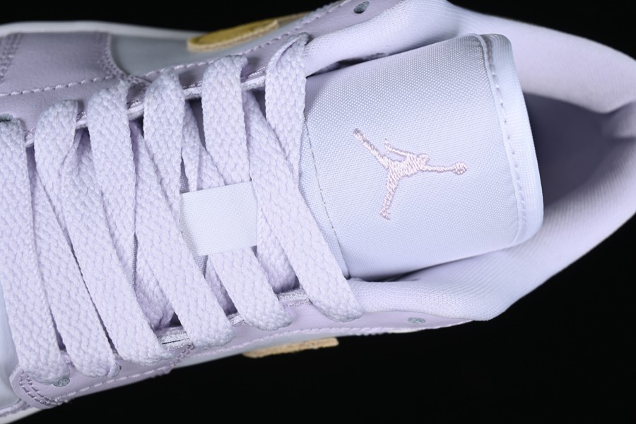 In this fresh rendition of the Air Jordan 1 Low tailored for women, the color palette features Barely Grape, Lemon Wash, and White. The shoe begins with a foundation of pristine White leather, accentuated by overlays and laces in the captivating hue of Barely Grape. Additional elements to note are the mesh tongues and lining, suede Swoosh logos adorning the side panels, and a two-tone rubber sole for a complete look.