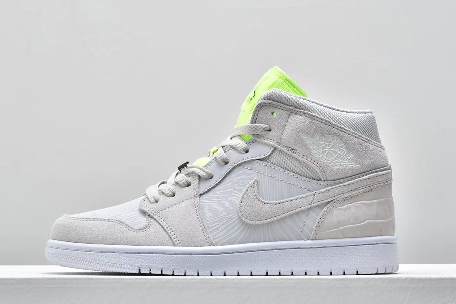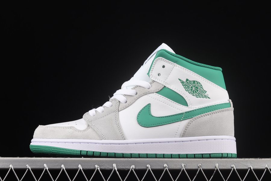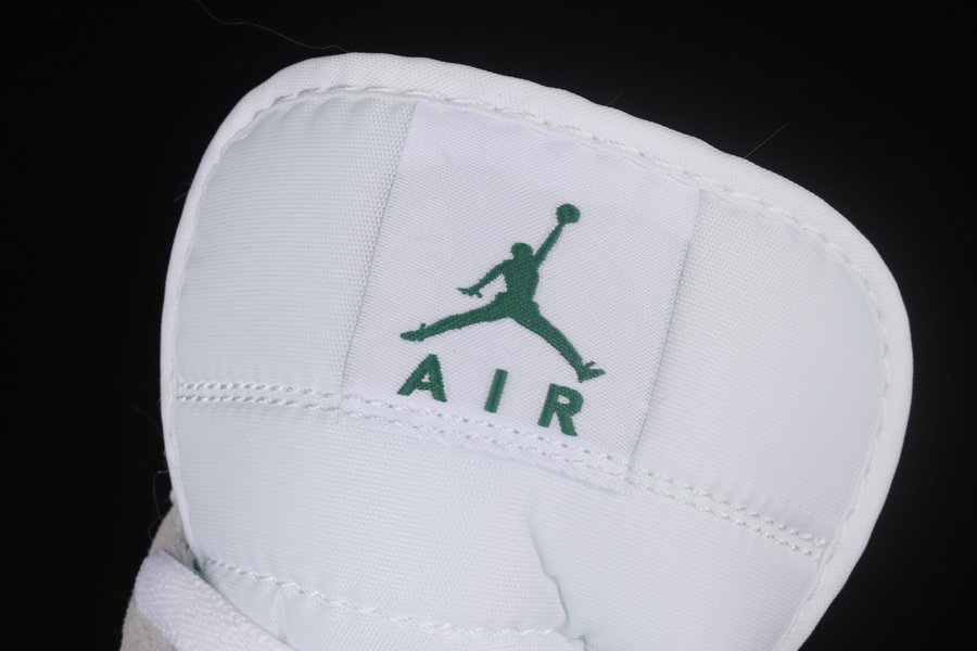 This offering of the mid-top Air Jordan 1 features white leather uppers and midsole with grey suede overlays. Green Swooshes, collar panels, and Wings motifs on the lateral ankle flap, Jumpman logos and rubber outsoles top off this silhouette.