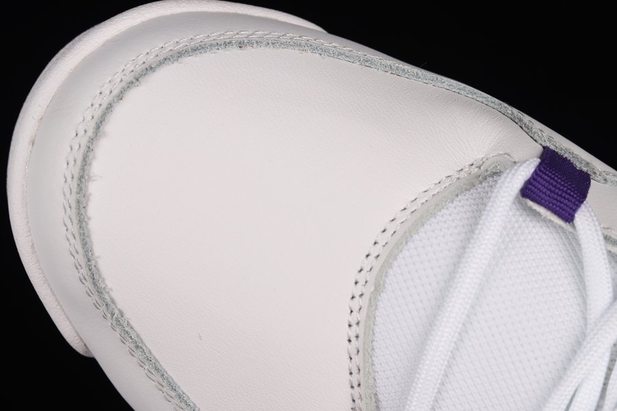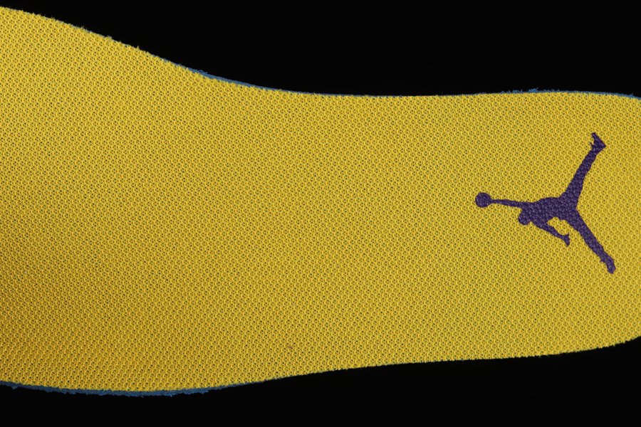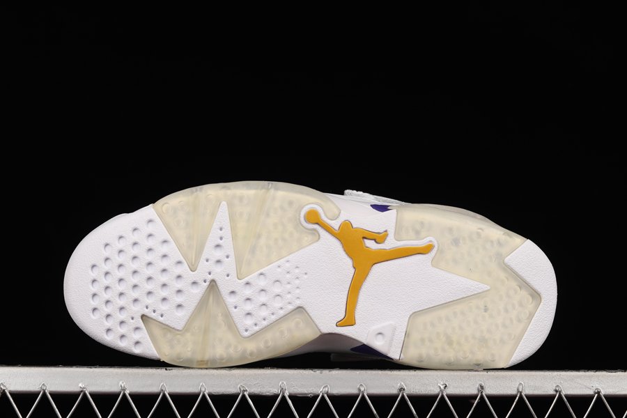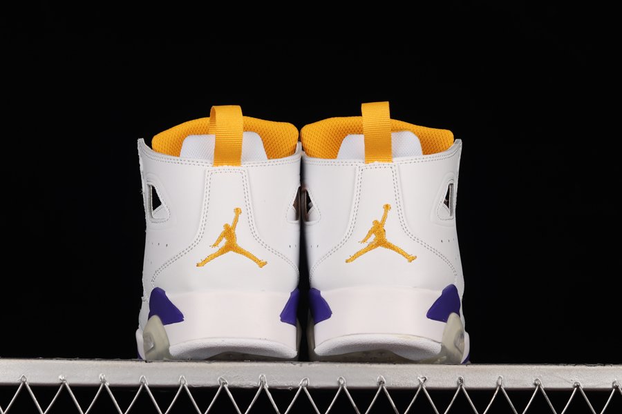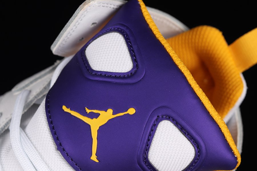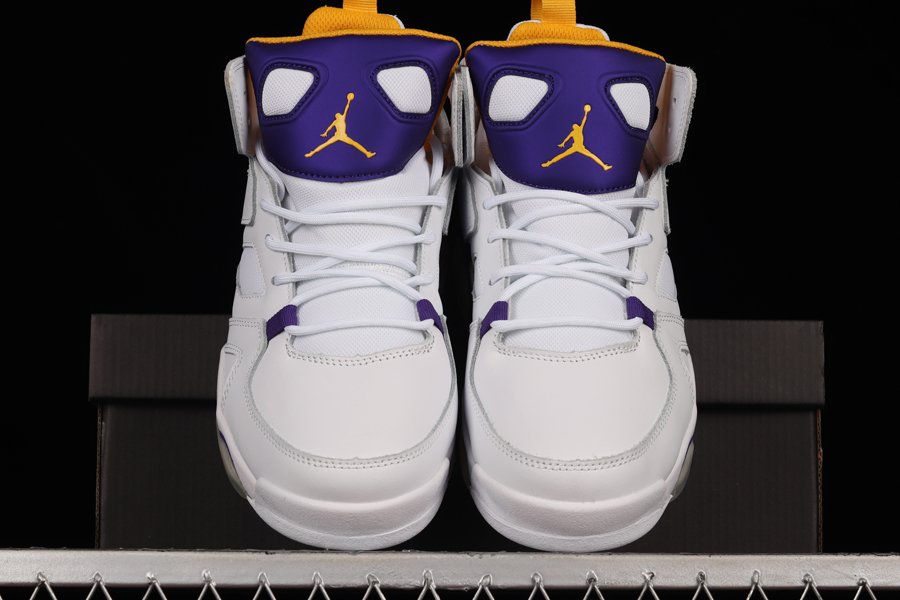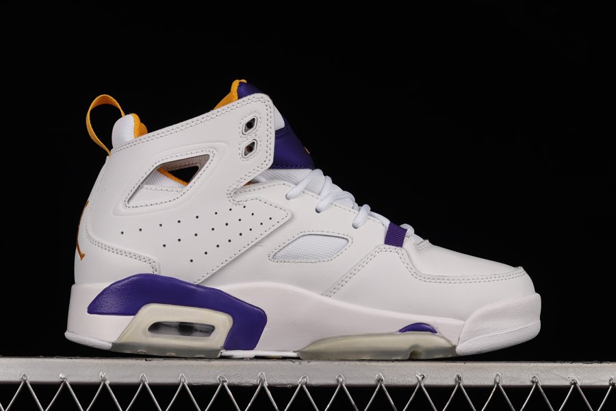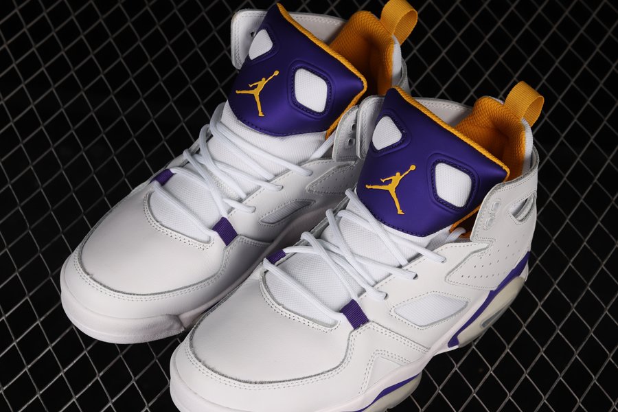The Jordan Flight Club 91 Lakers comes dressed in a White, Court Purple, and University Gold color scheme. The White upper is constructed in a mix of genuine and synthetic leather paired up with the model’s signature inner bootie. The White upper is then offset by the Court Purple and University Gold hits noted throughout, including the heel pull tab, parts of the midsole, tongue and branding.