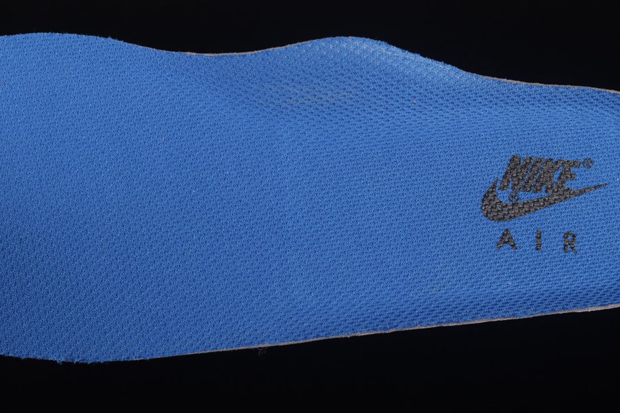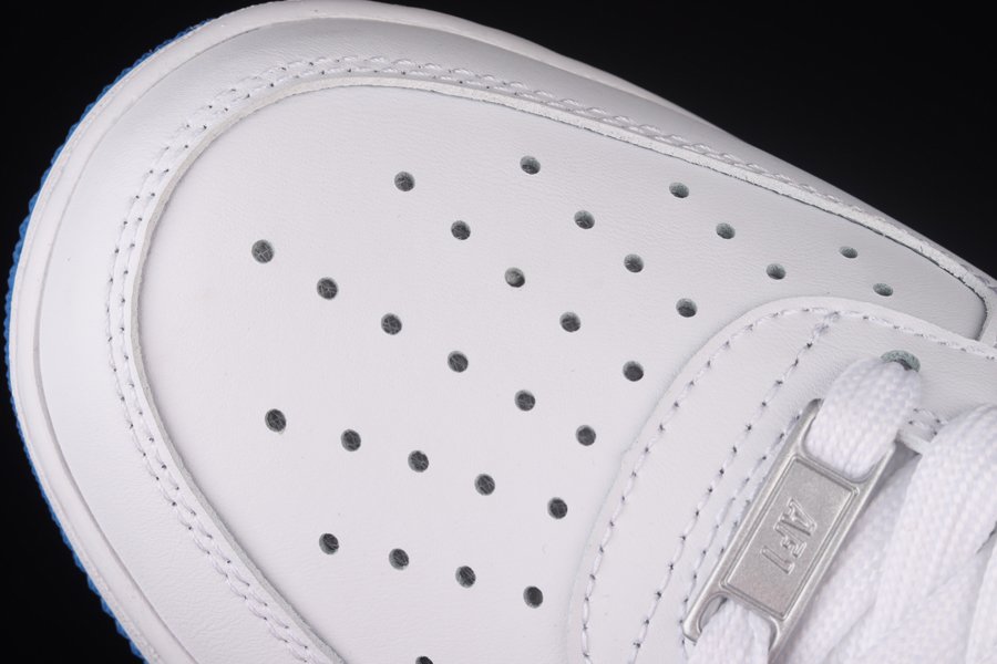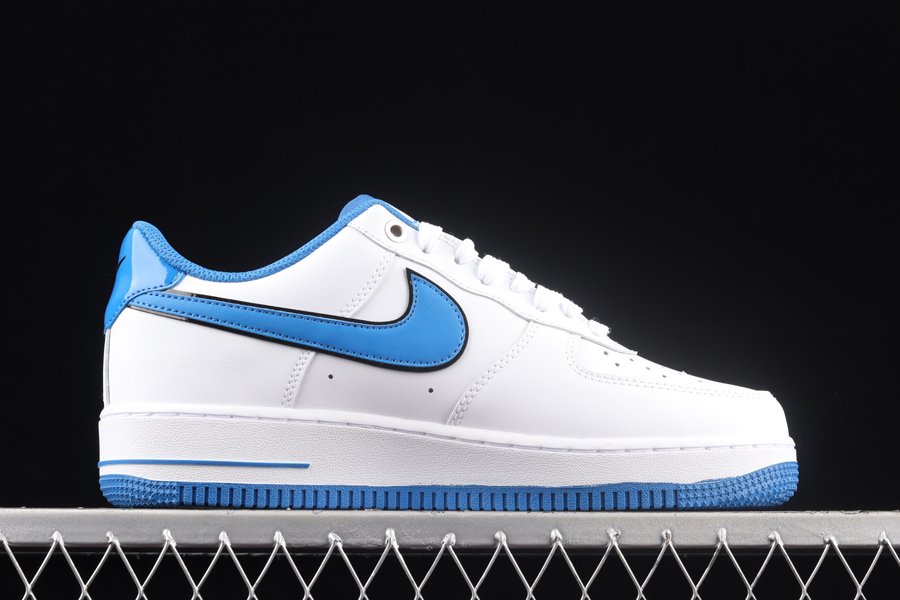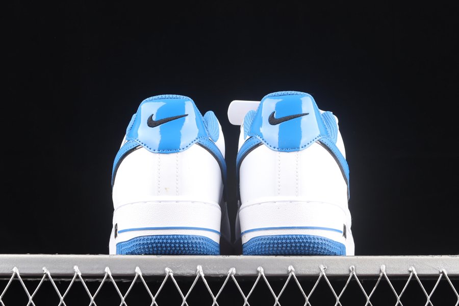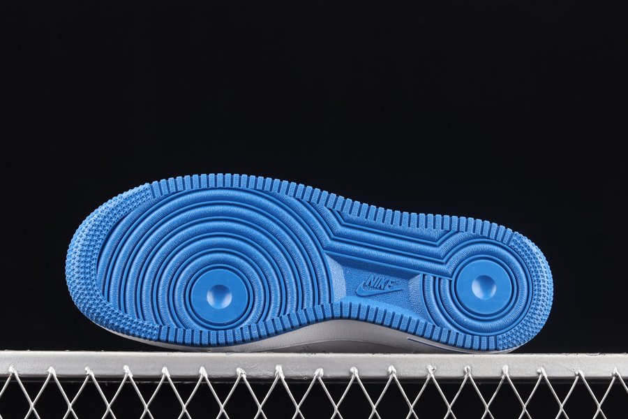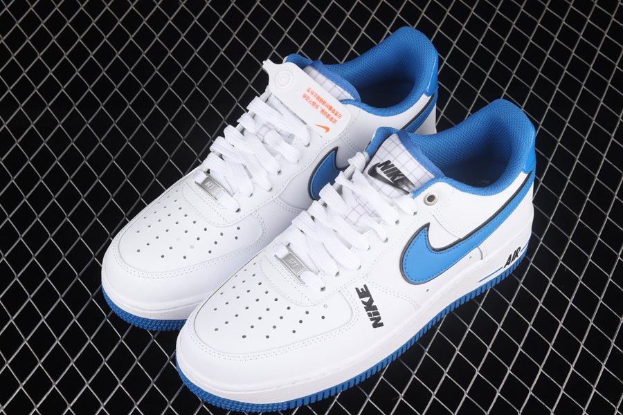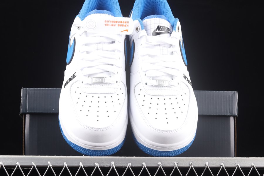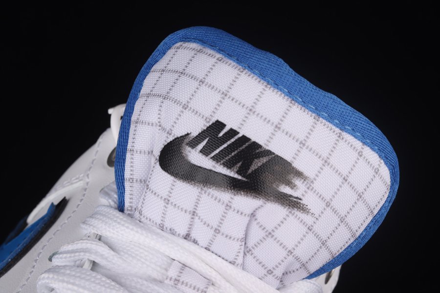 This rendition of the Air Force 1 Low has the classic all-white upper made of leather. Royal Blue elements appear on the sole, Swoosh, lining, and patent leather heel tab. The material on the tongue features a printed grid pattern and has the Nike logo in a blurred motion font. The most notable feature on the shoe is the Nike branding that appears embroidered on the side of the shoe vertically.