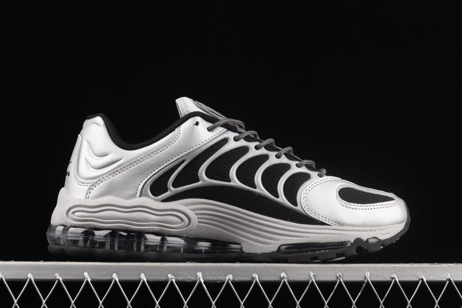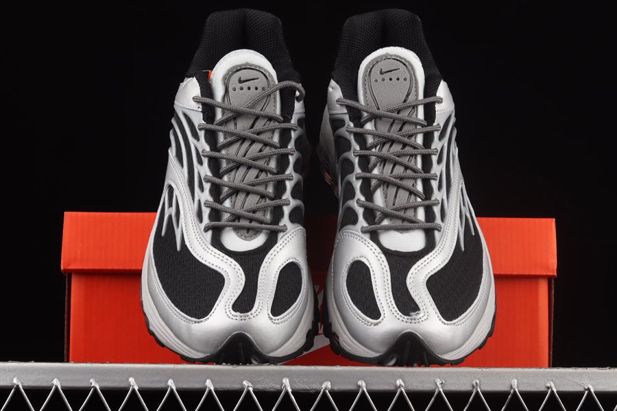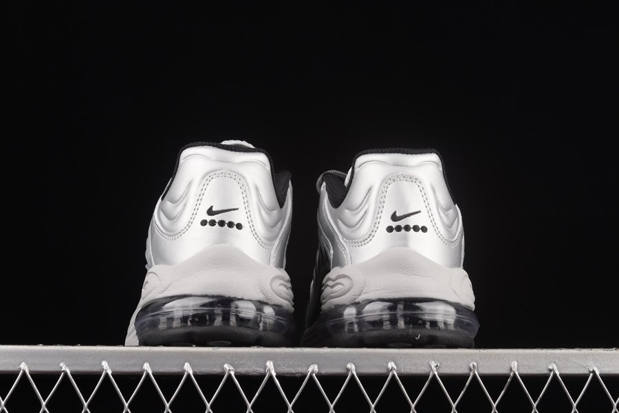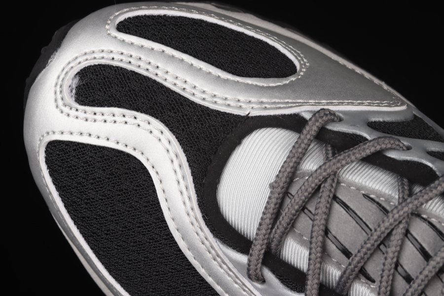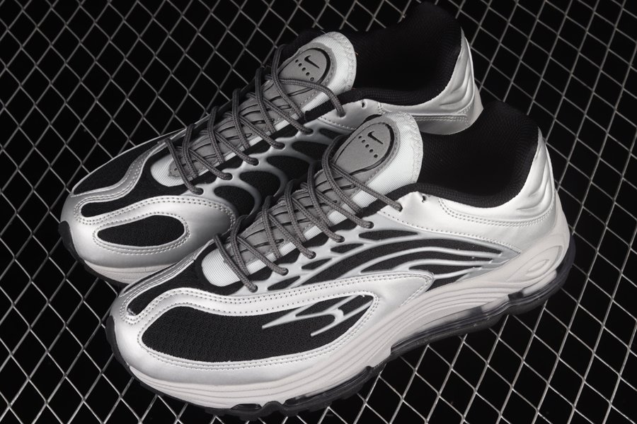 Here, uppers of black mesh are met in hue at only the laces, liners, and outsoles, with greys and silvers making up the remaining portions. Light grey midsoles work with darker grey caging and tongues to enable the striking metallic silver overlays to truly pop. Visible Air supports follow the latter lead, while collars are equipped with a 3M reflective finish to cap off the design.