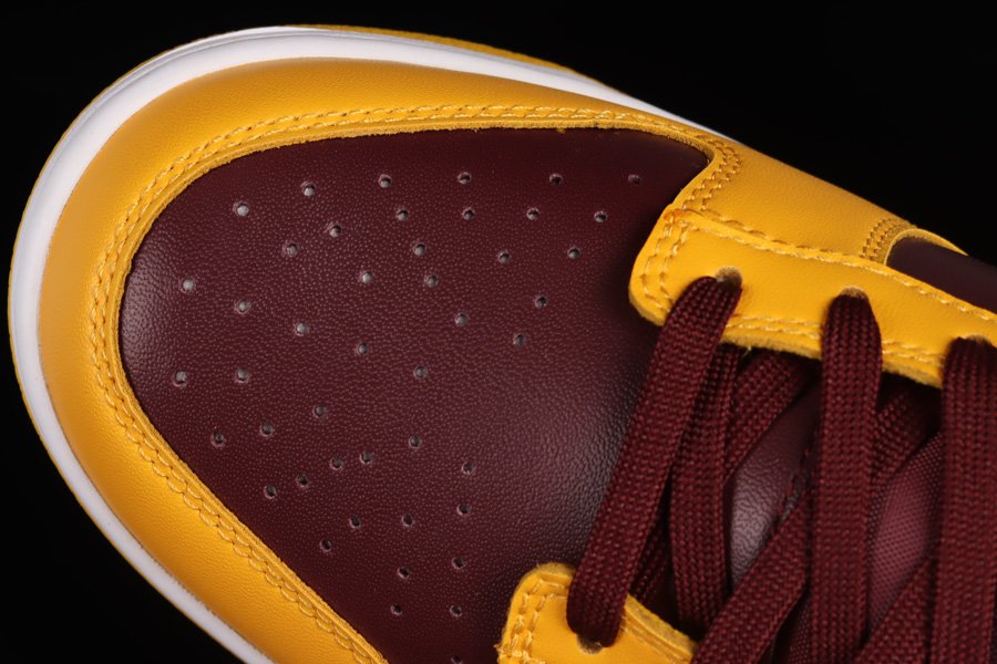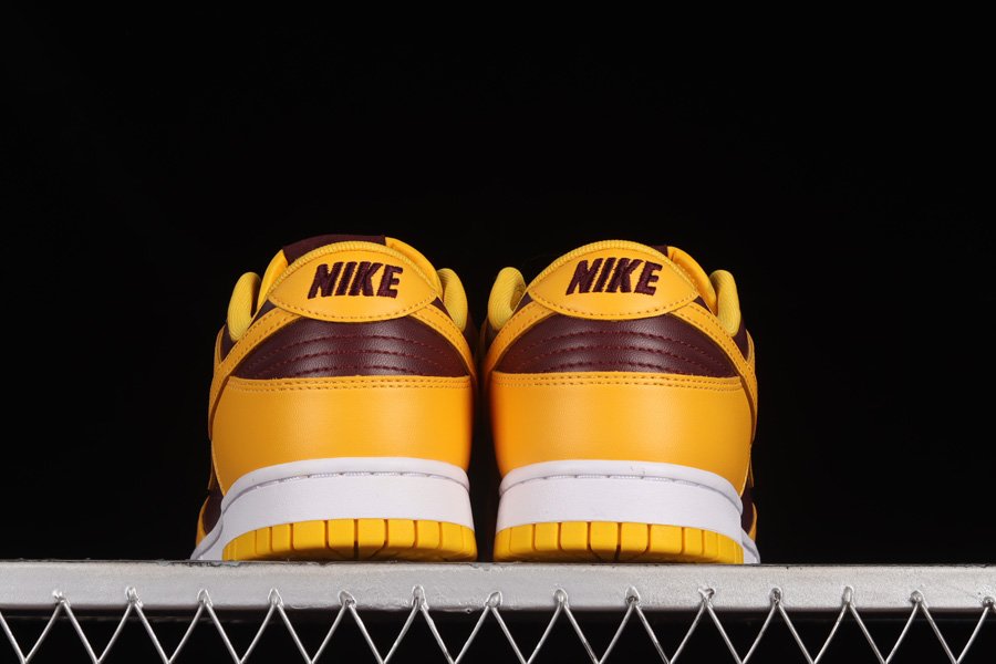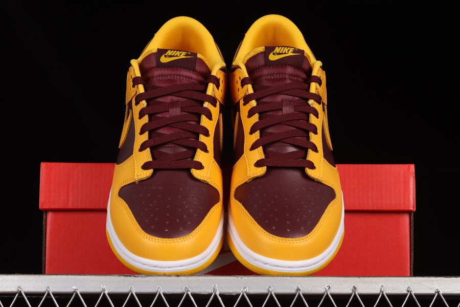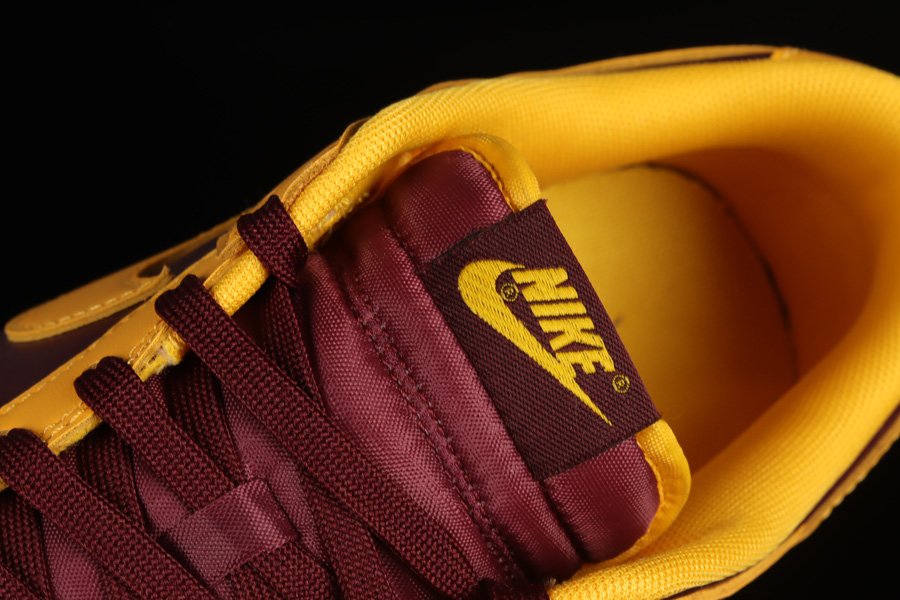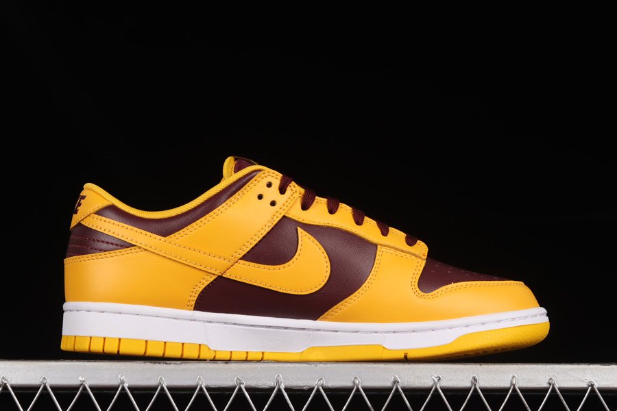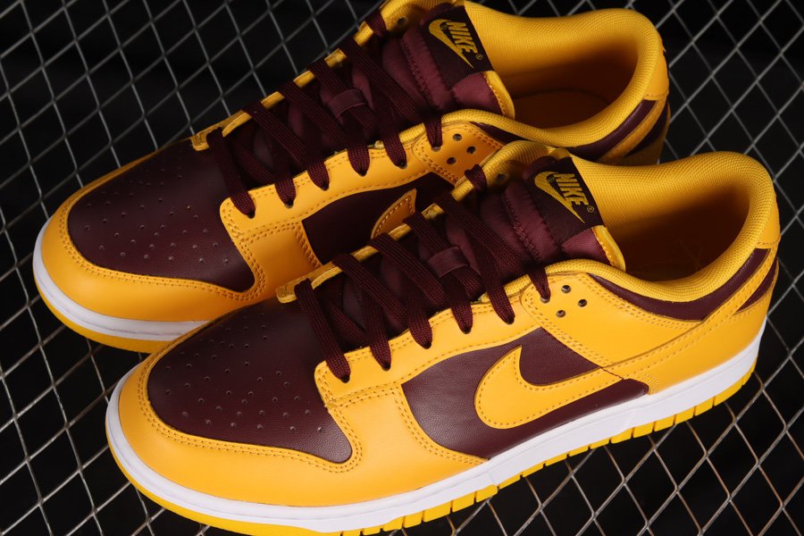 The pair introduces a low-top profile crafted with smooth leather panels forming the entire upper, including the perforated toe boxes and Swoosh logos on the lateral and medial sides. The base sees a dark burgundy tone contrasted against bold yellow overlays, paying homage to the colour theme of Arizona State University. Completing the classic look of the Nike Dunks are branded tongues, insoles, and heels, as well as a full-length midsole unit underfoot in white.