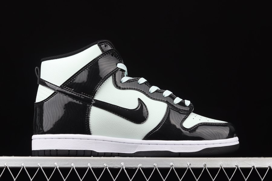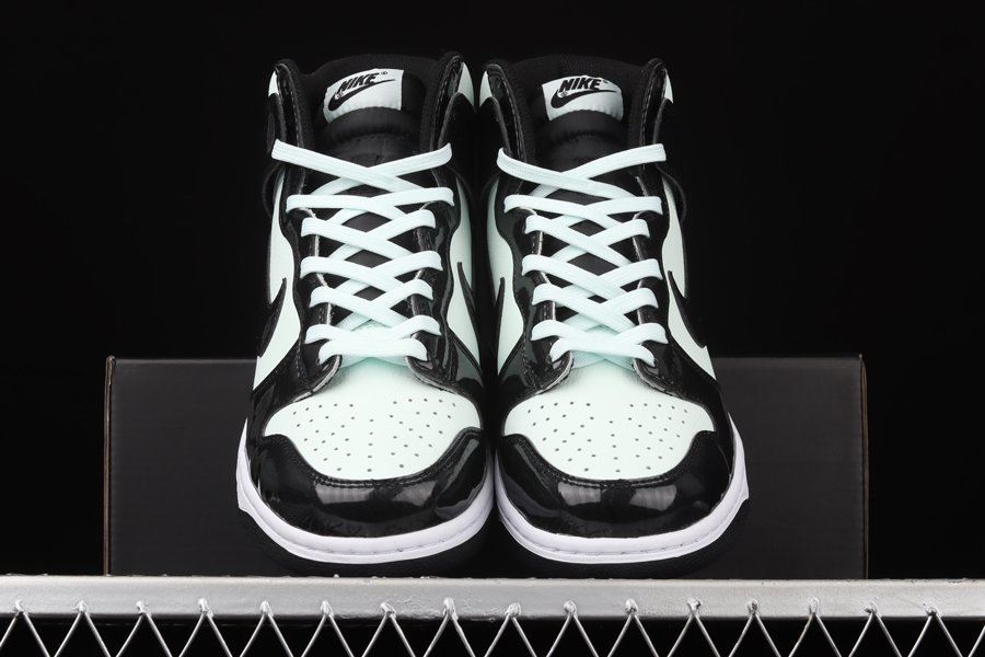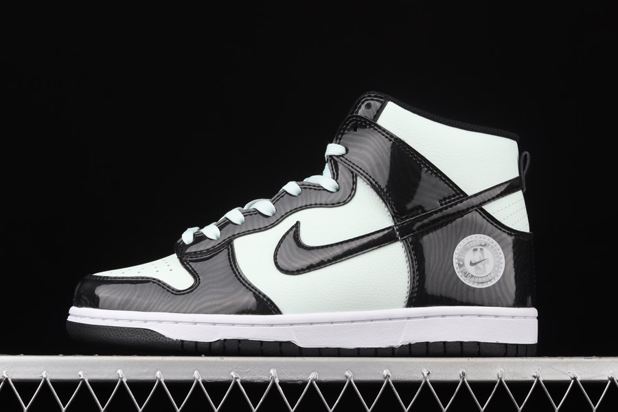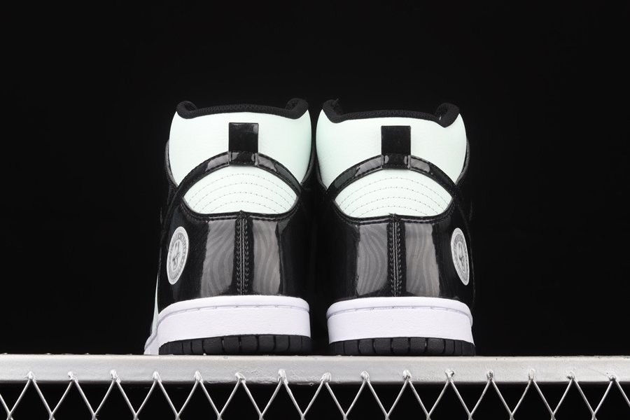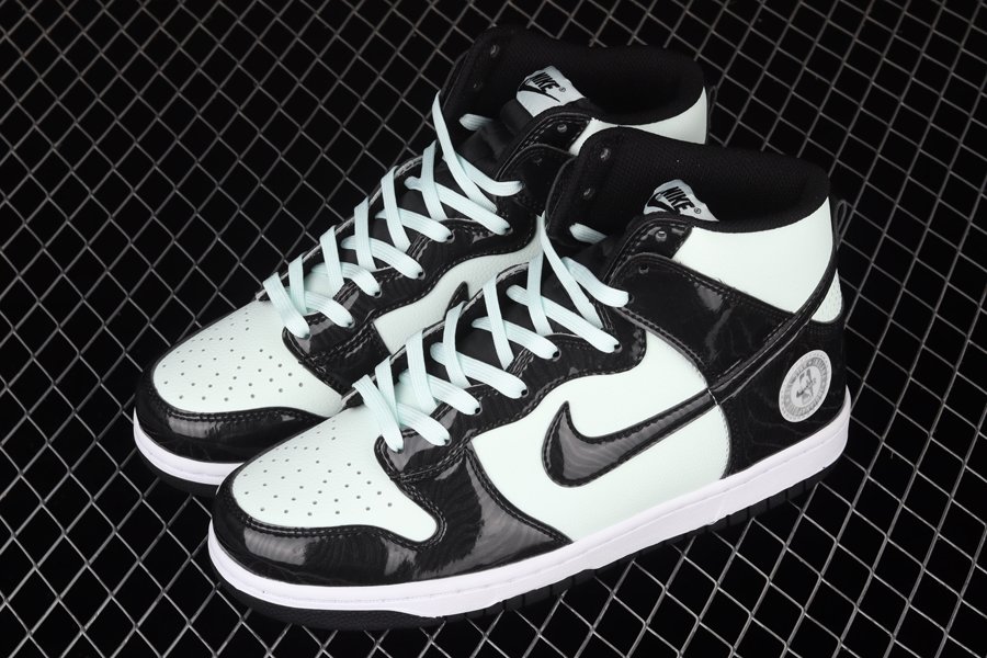 This high-profile installment leans on glossy overlays and minty color-blocking to guide its overall design. The former is shown off via the black patent leathers overlapped across the base layer which also come treated with tonal psychedelic patterns throughout. Swooshes atop the lateral and medial walls are also given the same aesthetic. From there, it’s the “Barely Green” hue that takes over and spills onto the tumbled leather toe boxes, quarters and ankle collars, as well as on the laces and NBA All-Star Indianapolis badges attached to the lower lateral heel.