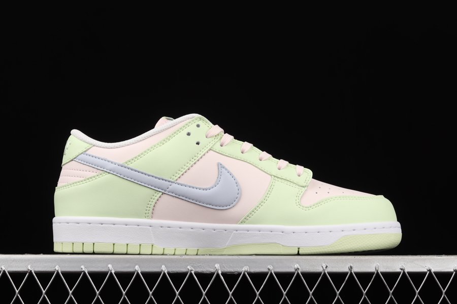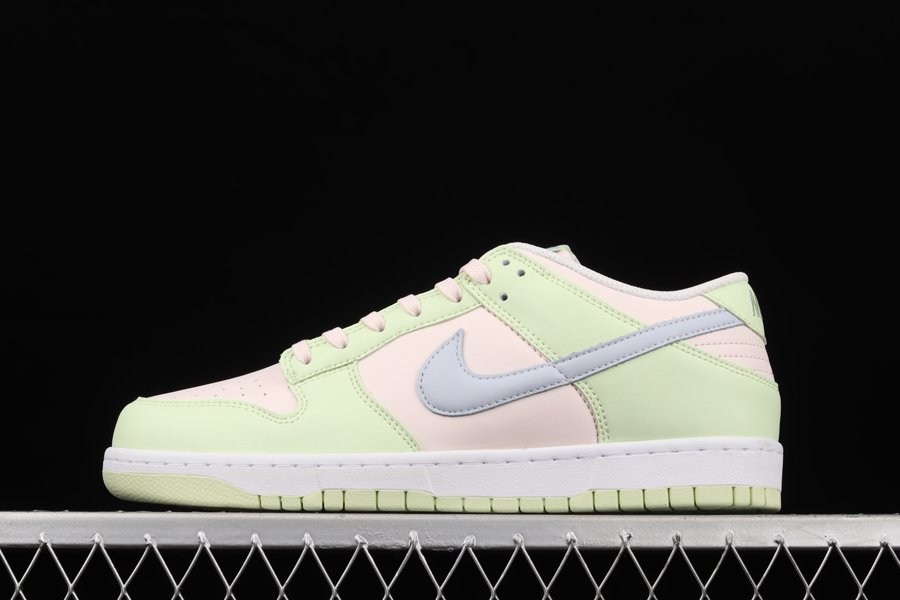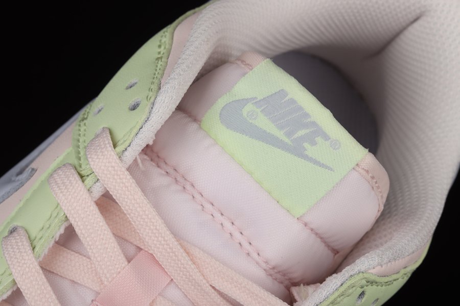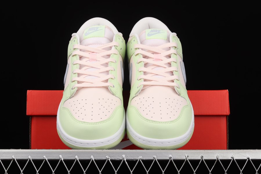This Nike Dunk Low features a Light Soft Pink, Ghost, Lime Ice, and White color combination. As you can see, we have Soft Pink on the toe box, panels, tongue, laces, and collar while Lime appears on the overlays and rubber outsole. Next, Ghost which resembles Grey lands on the Swoosh, tongue branding, and insoles. Finishing the look is a White midsole.