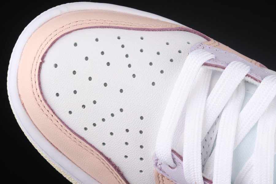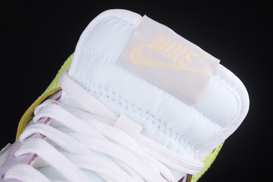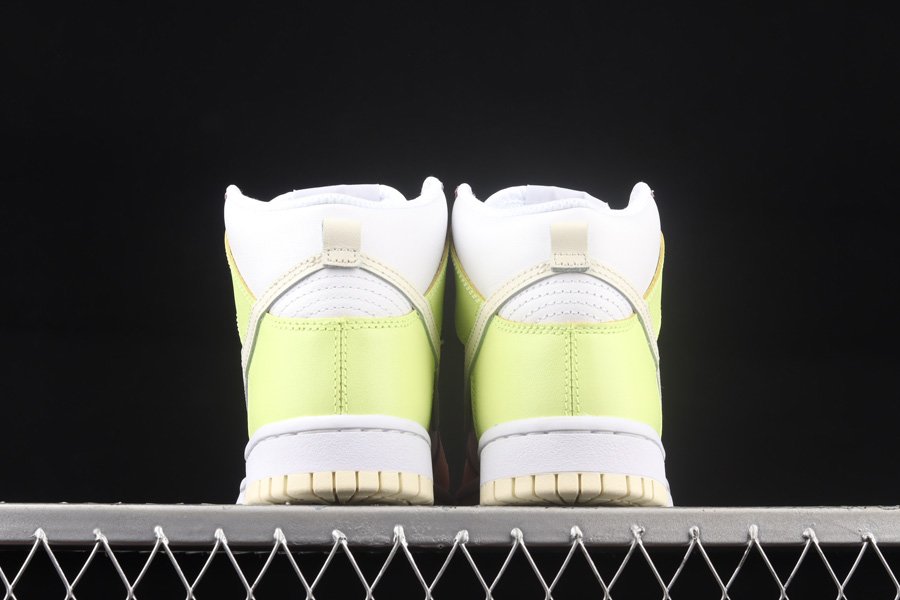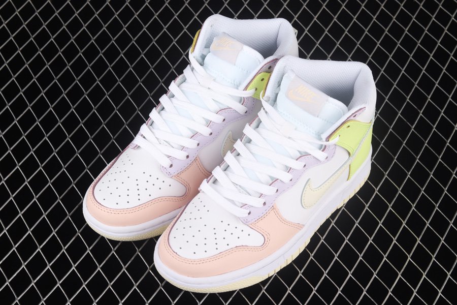 Going over this Nike Dunk High, it comes dressed in a White, Cashmere, and Lemon Twist color combination. Utilizing White leather across the panels, toe, and ankle, while pastel shades hit the Swoosh, overlays, and rubber outsole. Lastly, we have more White on the midsole, laces, tongue, and liner to finish the look.