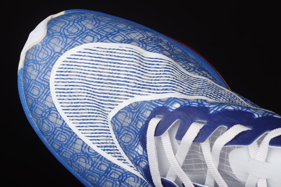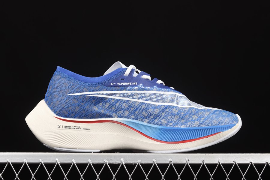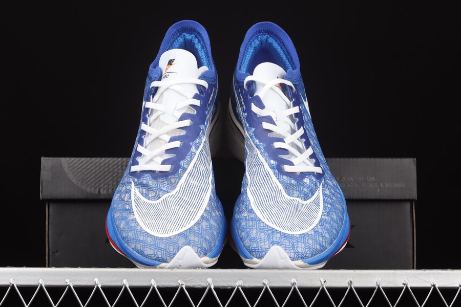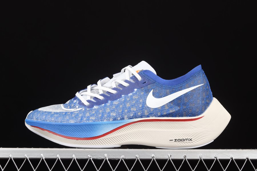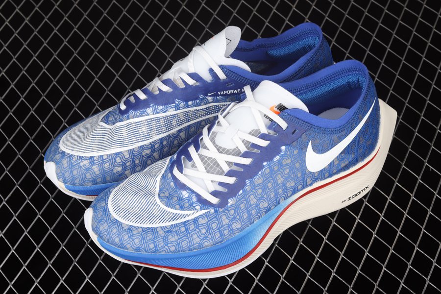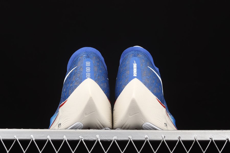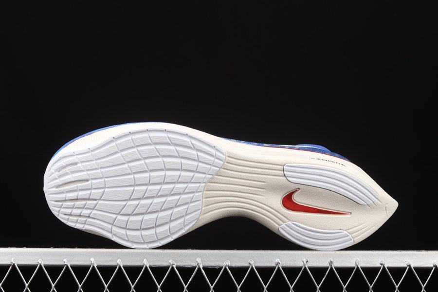 Working your way down the shoe, you’ll find a blue-to-white gradient midsole section that leads to a red stripe cutting in between this gradient and the off white sole unit. Inside this sole unit comes a host of running aids, such as a foam layer and a full-length carbon fiber plate that’s paired with Nike’s proprietary ZoomX cushioning. Together, this trio of tech works to add cushioning, comfort, support, but most importantly, a sense of propulsion for a rapid boost when you run.