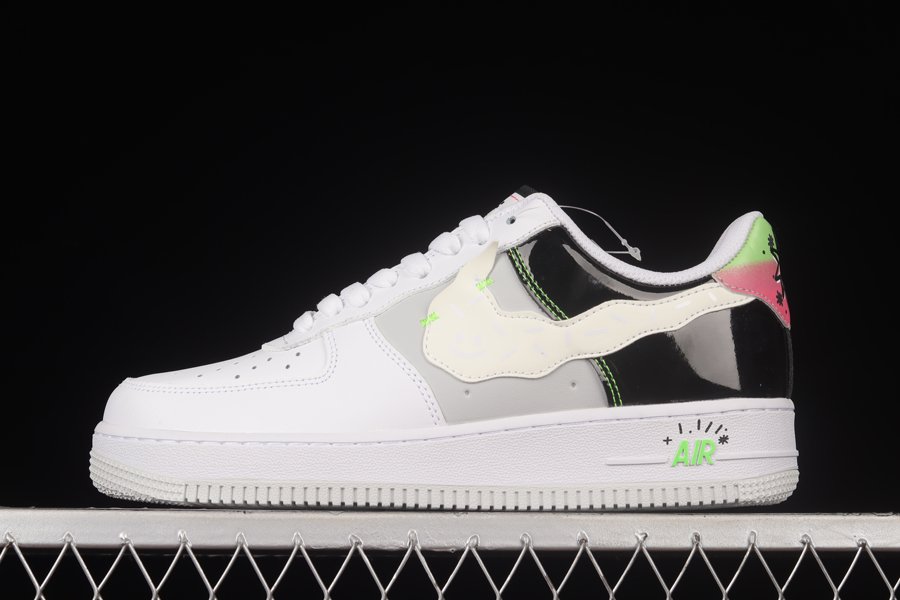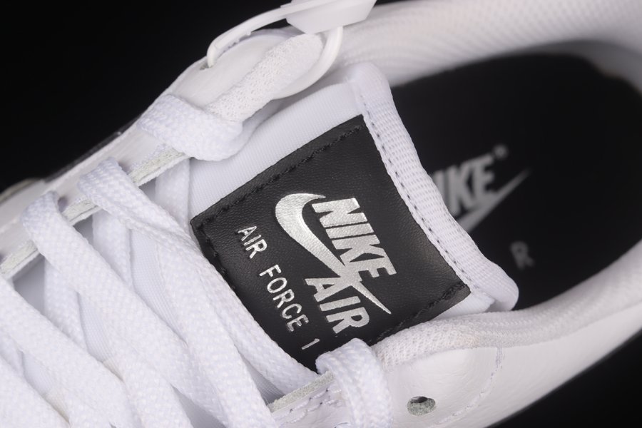 This offering of the Nike Air Force 1 features a White leather base with matching mesh tongues, laces, sockliner, heel branding, and AF1 rubber sole. Black Swooshes, tongue labels, insoles, and heels completes the design.