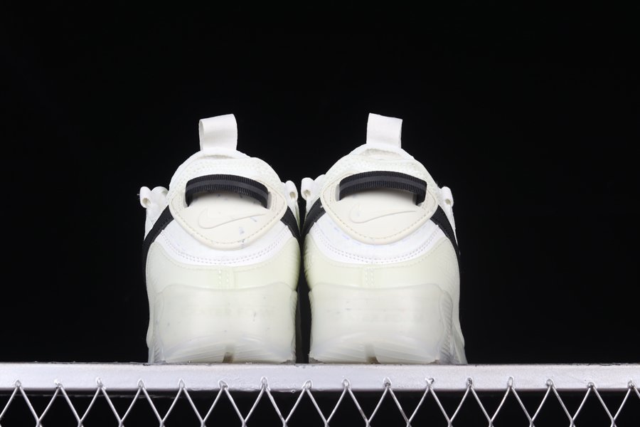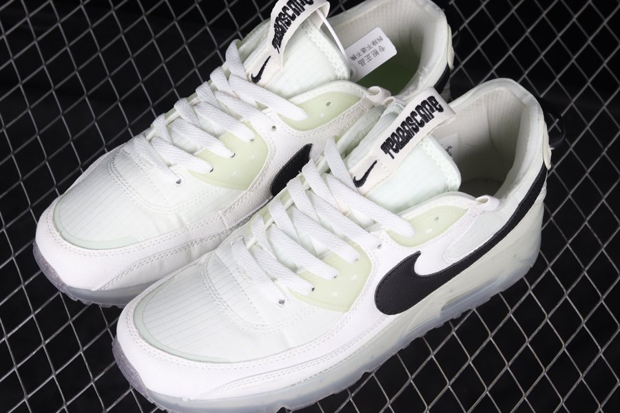 The Air Max 90 Terrascape is an outdoor-inspired iteration of the model that’s constructed with recycled fabrics and materials. Done in a Sail/Black-Sea Glass color scheme, details include a Sail base contrasted by the Black Swoosh, additional branding and heel pull tabs, which happen to be part of the Swoosh hits on the side panels. A finishing detail is the semi-translucent midsole and Crater Foam speckled outsole.