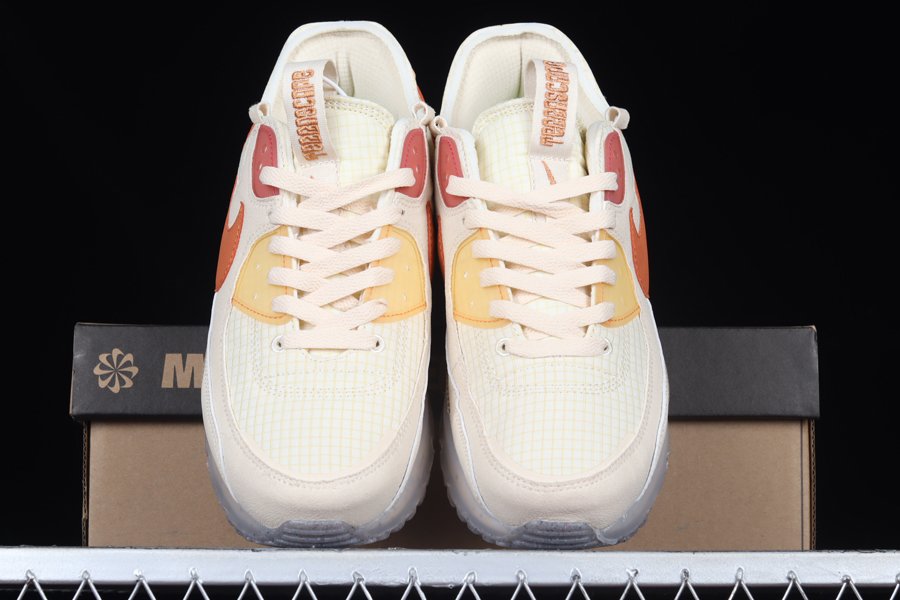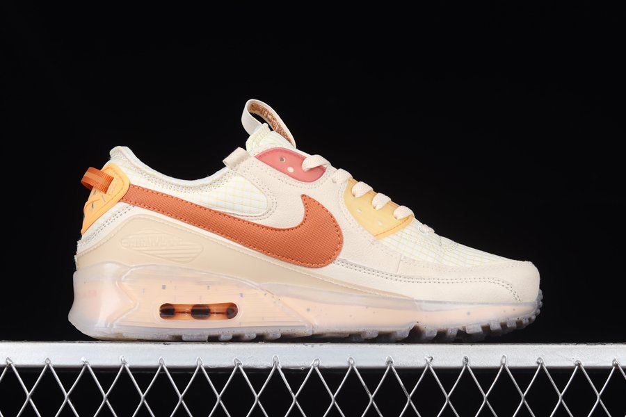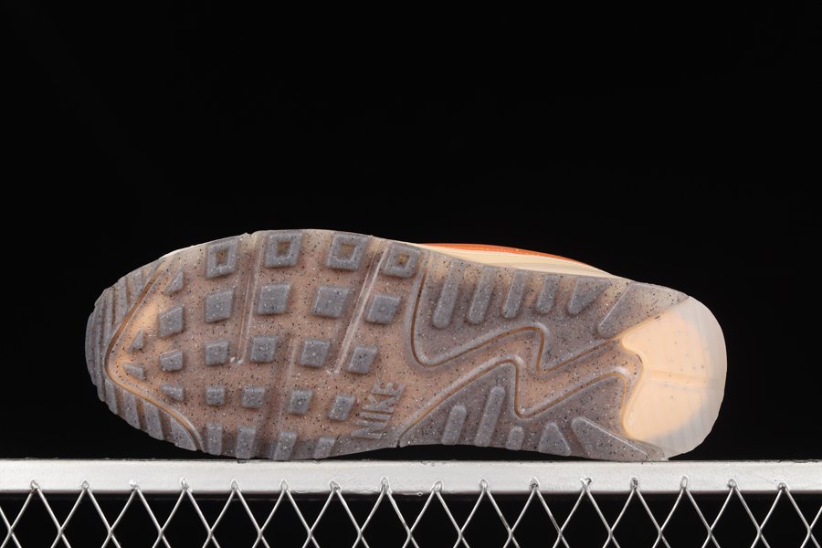 Taking on a Pearl White/HotCurry-Fuel Orange color makeup, this Nike Air Max 90 is highlighted by recycled materials/fabrics throughout including a grid-like mesh base, suede-like overlays, and textured Swooshes. Finishing details include “Terrascape” branding on the tongue pull tabs and insoles, translucent eyelets, and a semi-translucent midsole attached to a Crater Foam speckled outsole.