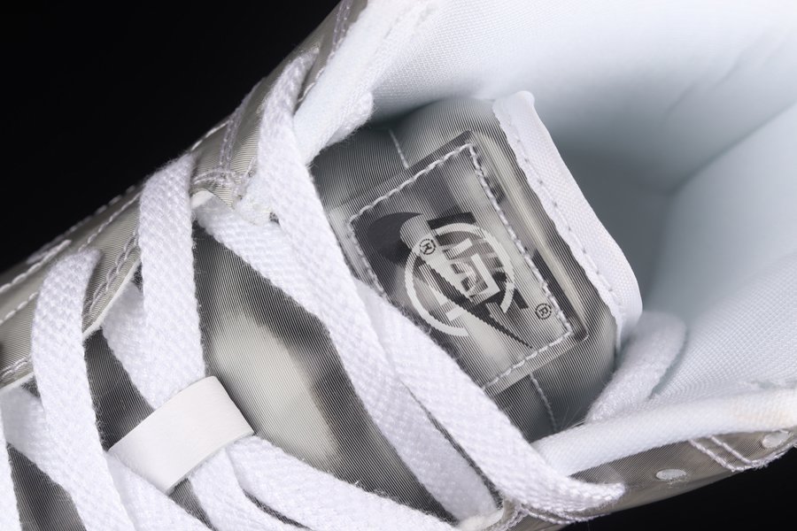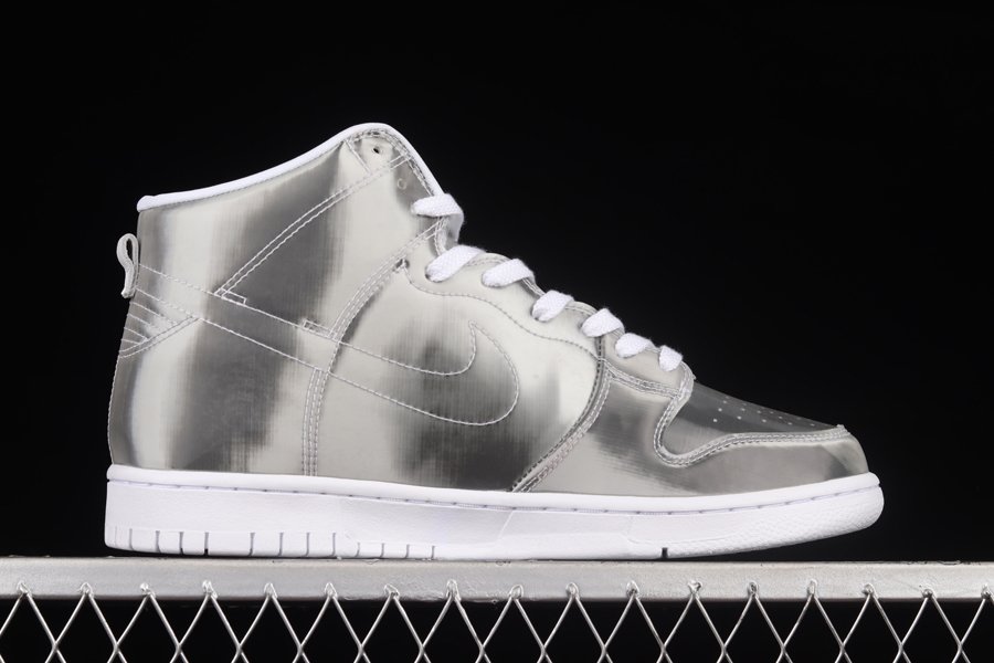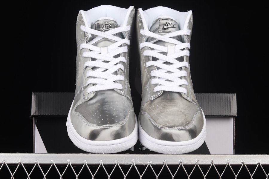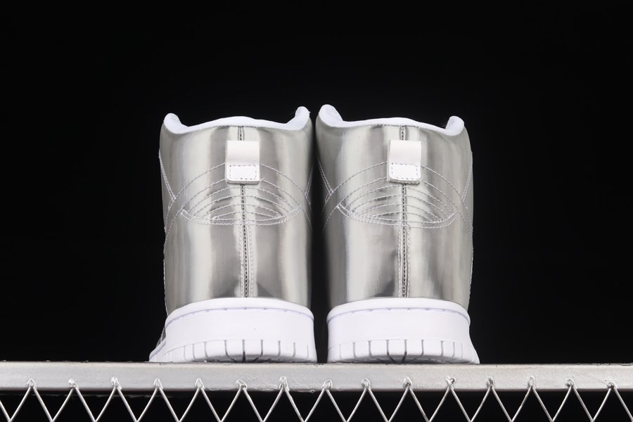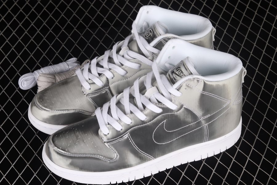 This flashy Nike Dunk High utilizes Metallic Silver on the upper with a glossy finish. Next, Grey satin appears on the liner, exposed stitching runs throughout, and perforations land on the toe box. Other details include Clot and Nike branding on the tongue labels and insoles, while White appears on the midsole and rubber outsole.