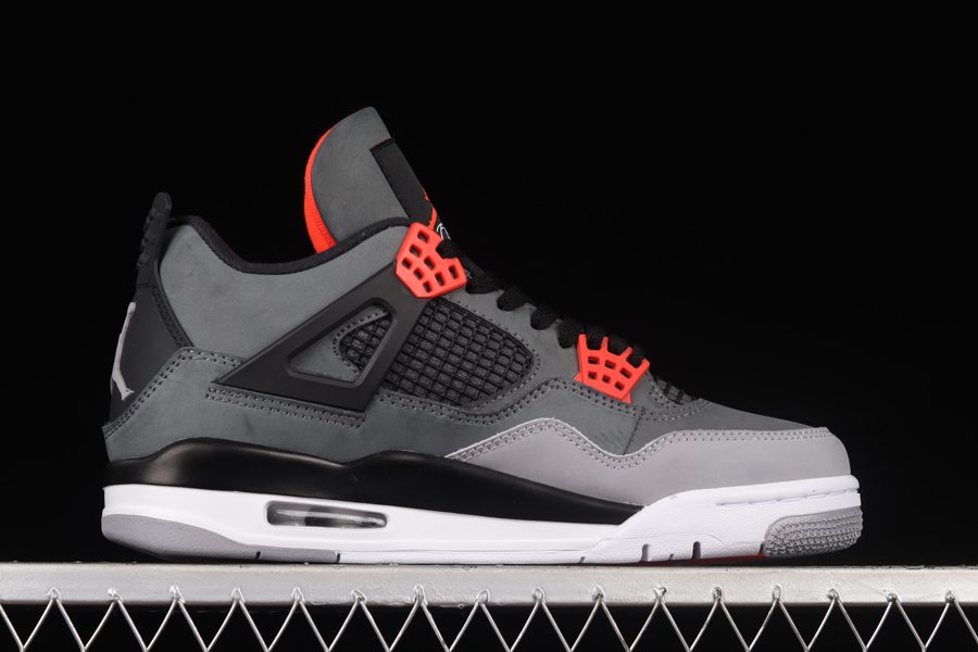 Done in a Dark Grey, Infrared 23, Black, and Cement Grey color scheme, this new colorway of the Air Jordan 4 features an upper done on two different shades of Grey throughout the nubuck upper. The Grey motif is then contrasted by the Black accents that take care of the side panel netting, plastic wings, laces and molded heel tab highlighted. Setting the design off are the Infrared hits found on the top and bottom eyelets, tongue lining and Jumpman branding on the tongue tag.