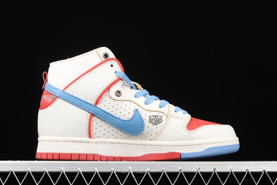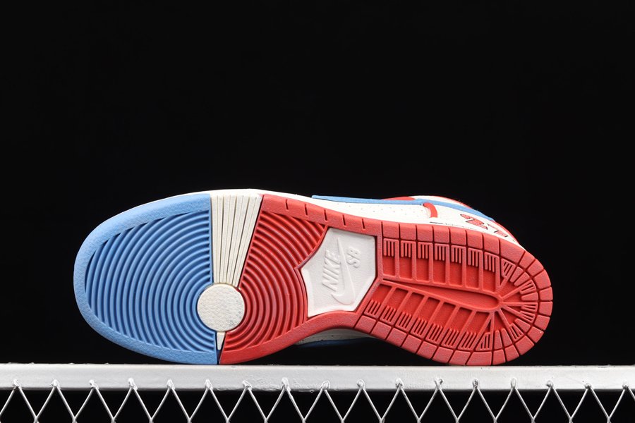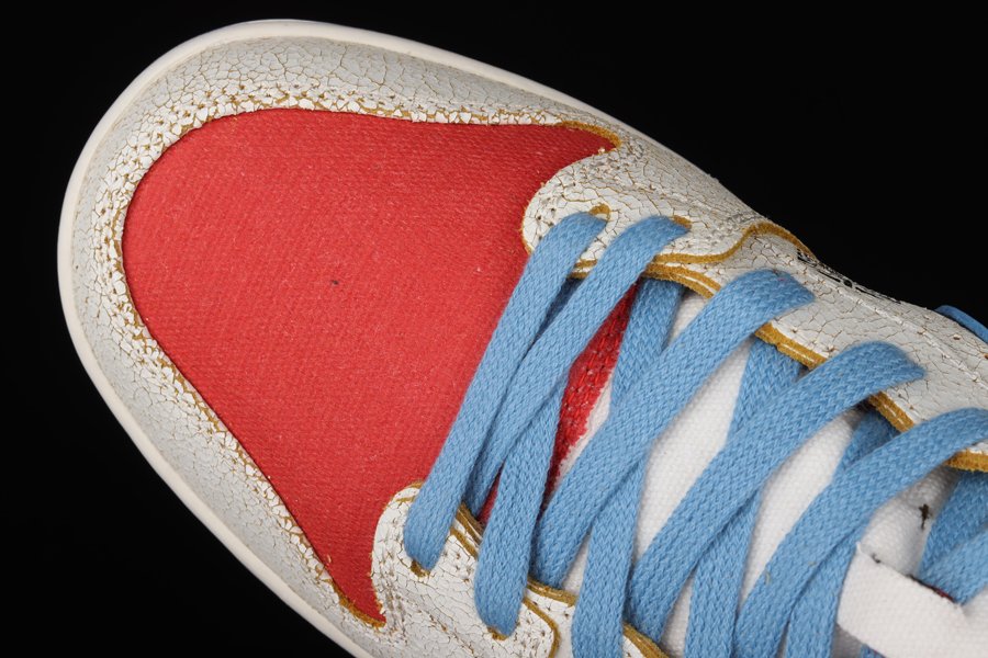 The nods to Walker’s car are all over the sneaker, which uses a grey wear-away upper that turns gold. Urban Outlaw decals are seen on the quarter panels and “277” printed on the heel. A red canvas toebox and piping on the ankle flaps and heel counter with a sky blue suede Swoosh overlaid on top. A deconstructed ankle collar and tongue are utilized and the Urban Outlaw logo is seen again on the back of the tongue. A Union Jack flag is stitched on the heel with “Ishod x Magnus” on the tongue tag alongside the Nike SB logo.