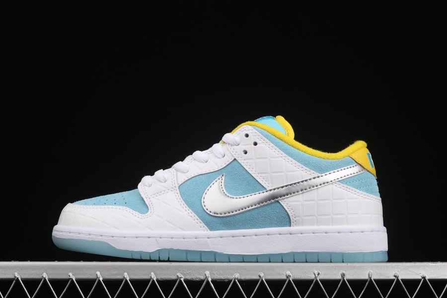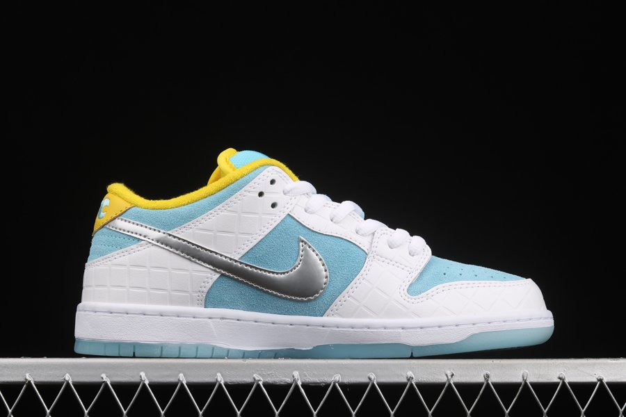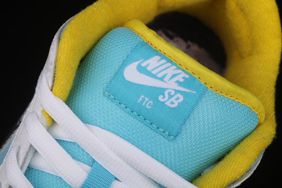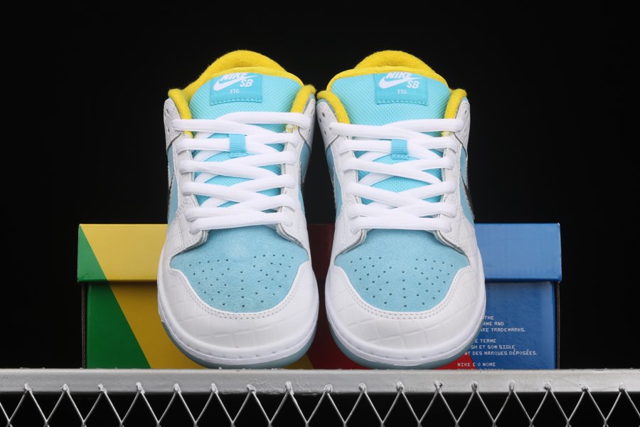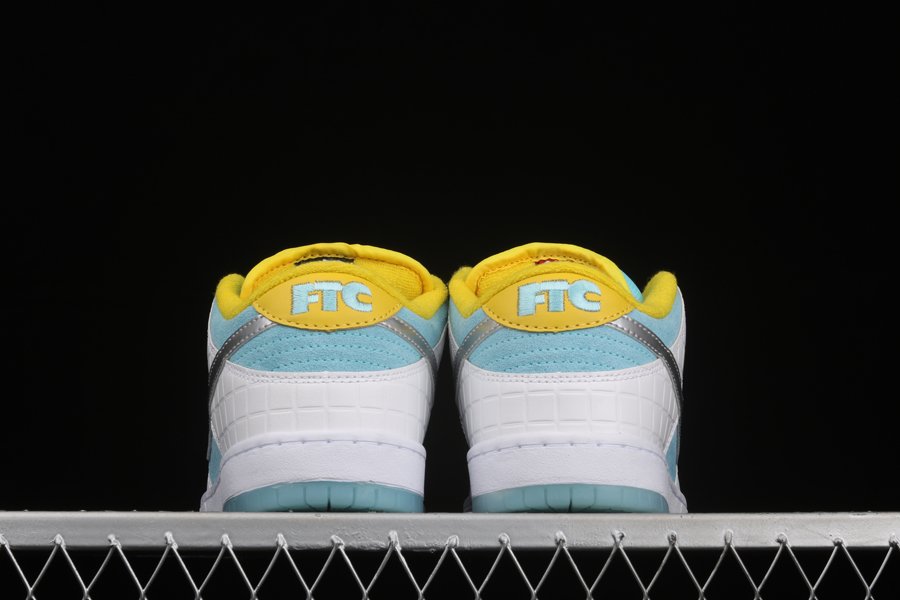 This Nike SB Dunk Low comes highlighted with Light Blue suede across the base, ankle, and toe box while the same shade appears on the mesh tongue. Next, White leather adorns the overlays with a debossed diamond grid. Metallic Silver hits the Swoosh for added flash, with Yellow covering the liner and outlines the tongue and heel overlay. Speaking of the heel, FTC branding is embroidered in Light Blue. Finally, a White midsole and a Blue translucent outsole finish the look.