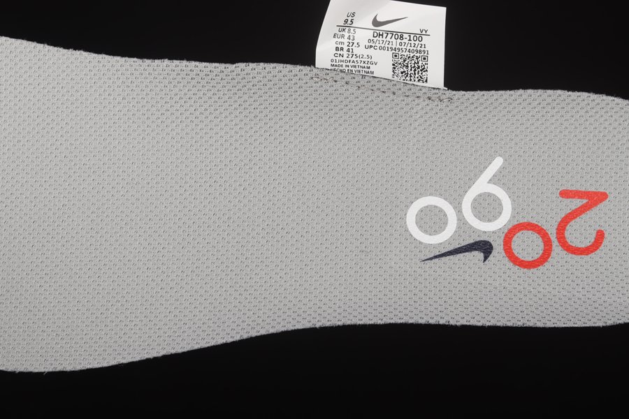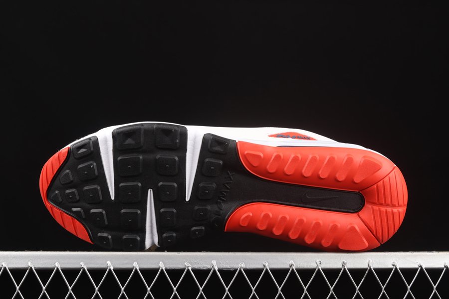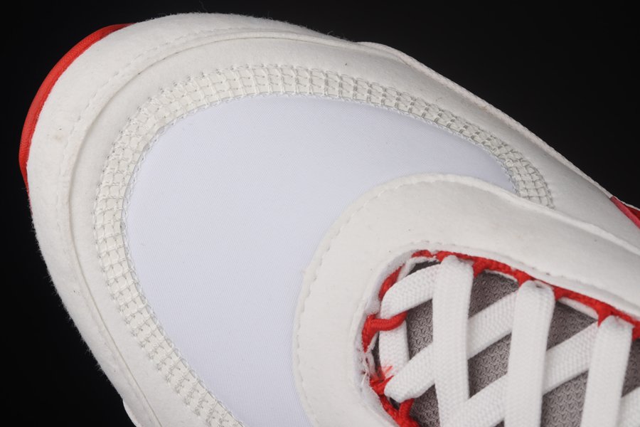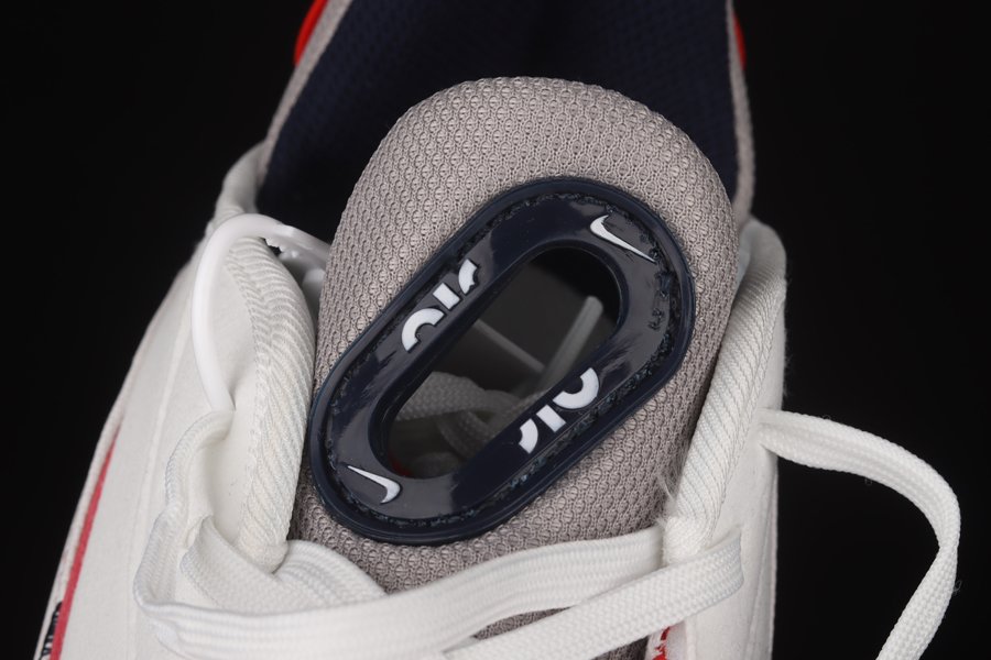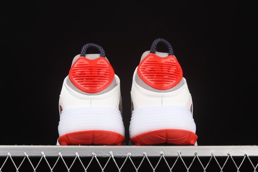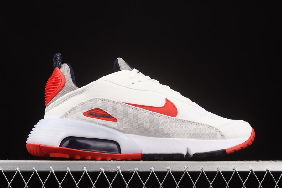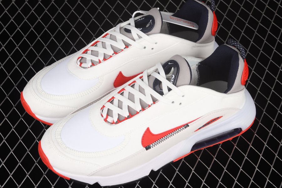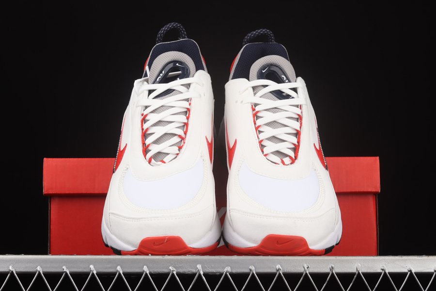The Nike Air Max 2090 features a White base constructed with mesh on the toe, fleece covering majority of the upper and textile leather mudguards. Red leather Swooshes, Grey mesh tongues and heels paired with Navy detailing throughout completes the design.