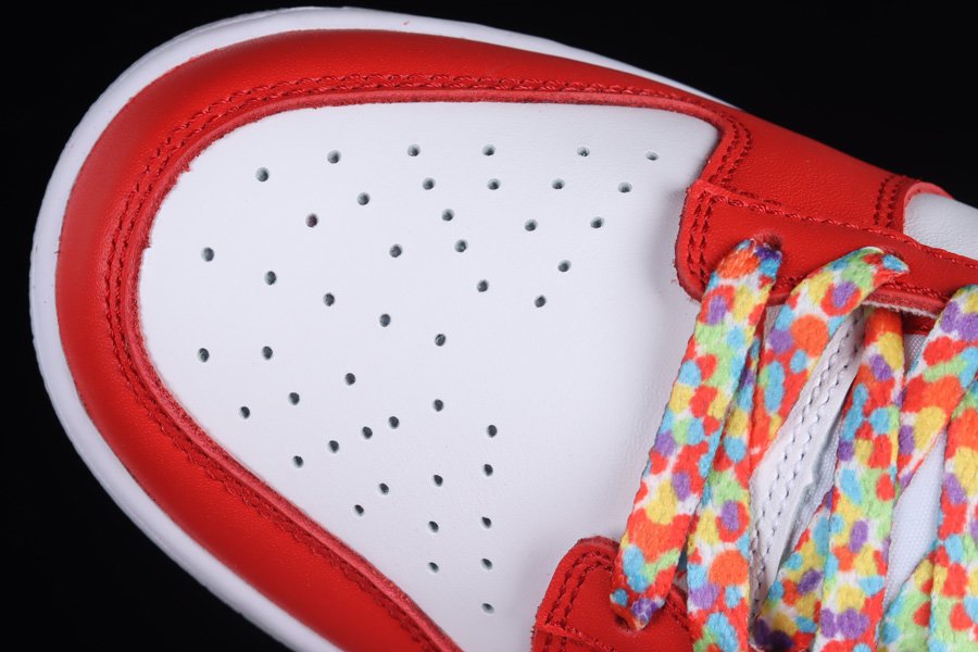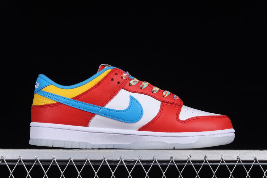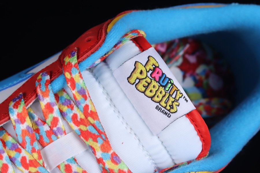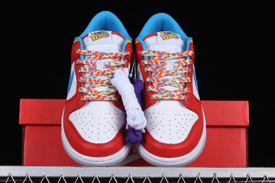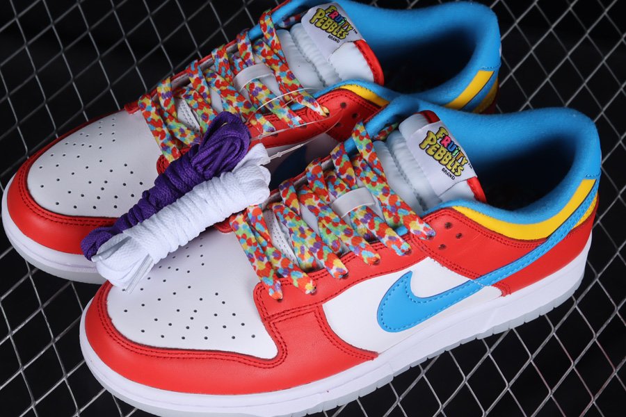 Overall, this rendition of the Dunk flaunts a vibrant color scheme with red overlays covering its white leather base, followed by contrasting blue Swooshes, inner lining, and bright yellow on the collar area. Additionally, the highlight Fruity Pebbles graphic is prominent on the laces, insoles, and tongue tag while extra laces round out the offering.