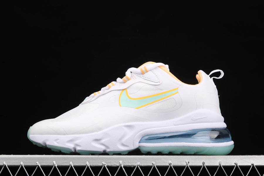A summery bright white base is met by beach hues of sand yellow and crystal blues which mimic tropical waters one longs to touch. The accents arrive at the liner, eyets and Swooshw, with the rest of the upper fixed in tonal whites. REACT cushioning also sports a staple white hue, while Air supports and outsoles once again indulge in island water washes of blue and blue-green respectively.