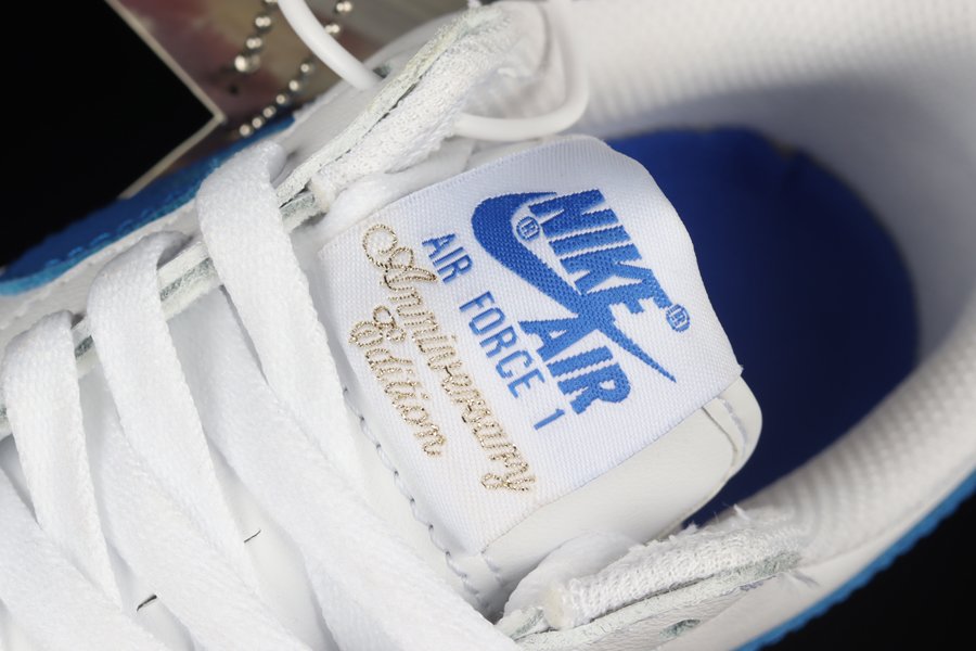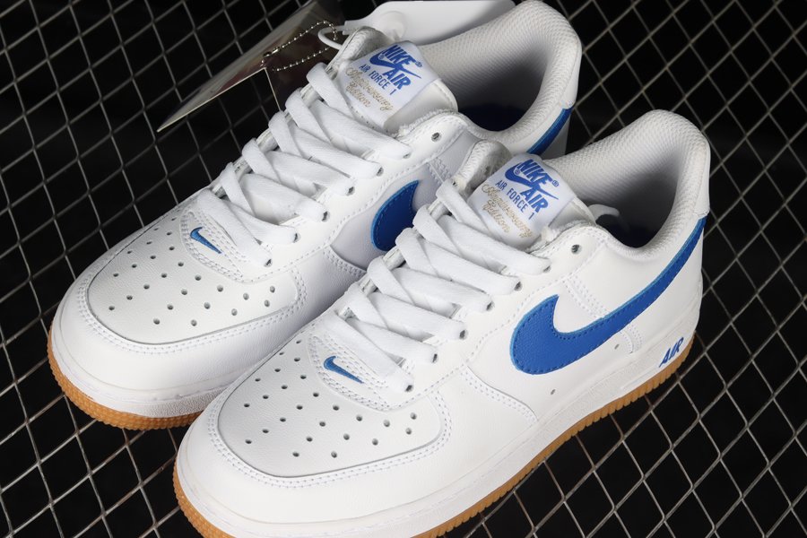 Opting for a simple two-tone appearance, this Nike Air Force 1 Low gets hit with a White smooth leather construction all throughout the upper with Varsity Royal hitting the Swooshes on the side panels, the Nike branding on the tongues and heels, insoles, and the “AIR” on the midsole. Unique characteristic on this Air Force 1 include “Anniversary Edition” written in silver on the tongues as well as a Nike toothbrush hangtag as a nod to the days when sneakerheads carried a toothbrush with them to clean their kicks on the go whenever they got dirty. A white rubber midsole and gum rubber outsole finish off the look on this Nike Air Force 1 Low.