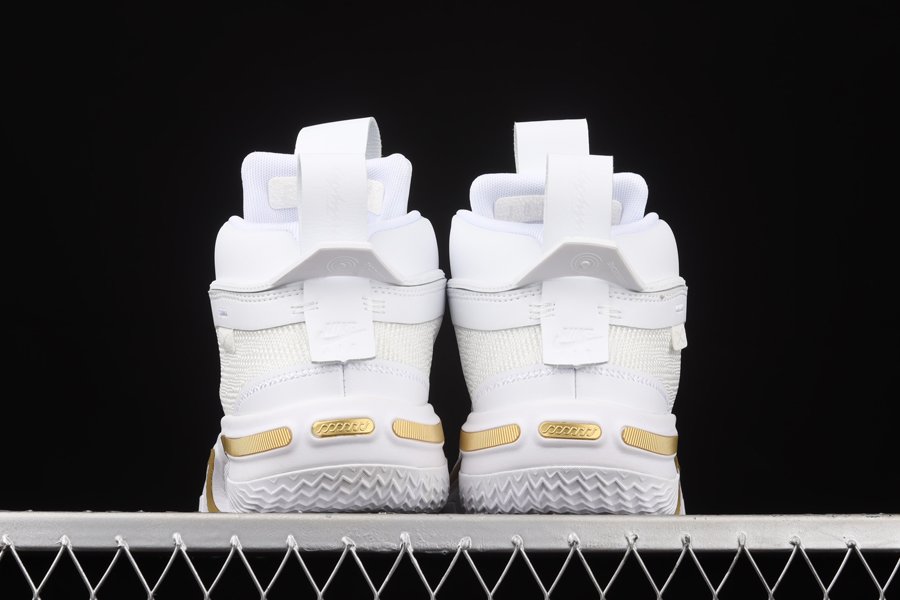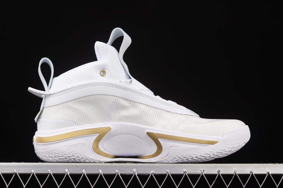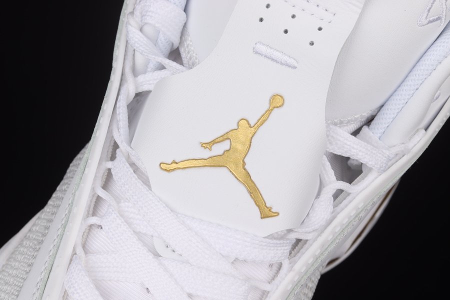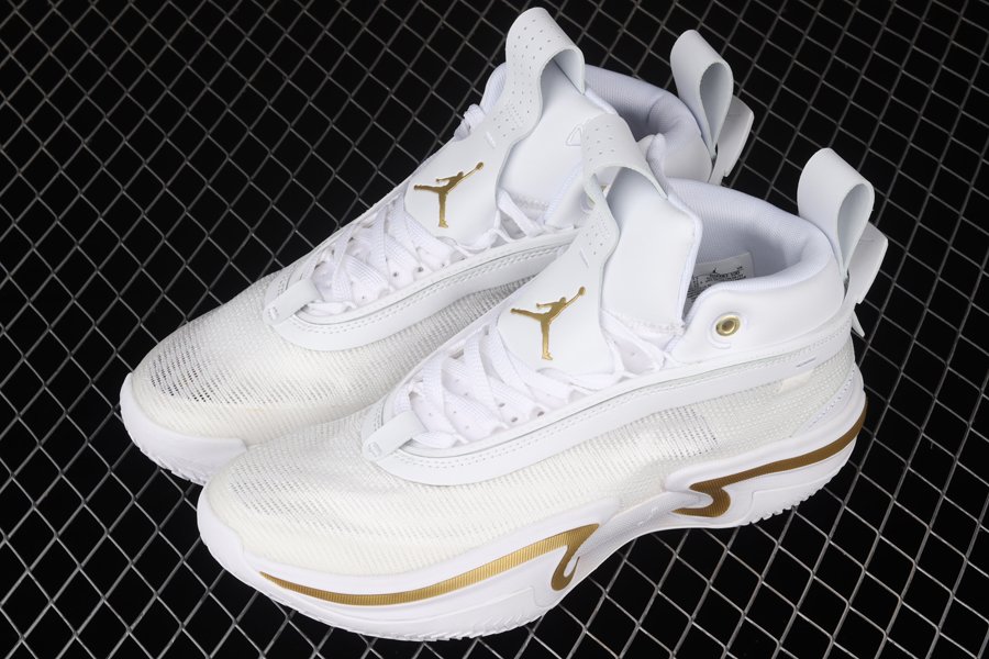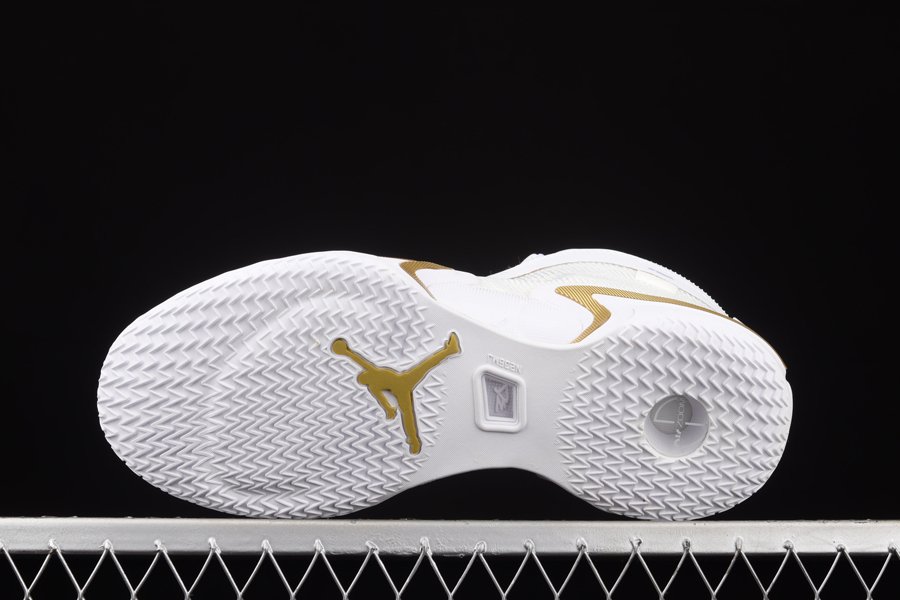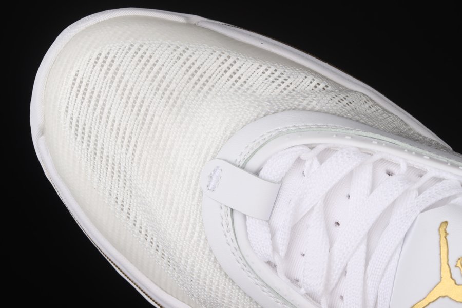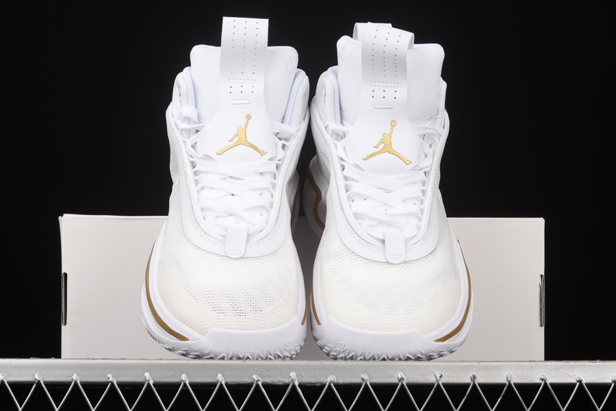 First seen on the feet of Utah Jazz guard and Jordan Brand athlete Mike Conley during the NBA Playoffs, the “White Gold” colorway takes a simple but elegant approach to the newest Air Jordan. White makes up the whole upper, with metallic gold accenting seen on the top eyestay, the Jumpman, and the midsole. The white midsole features an Eclipse Plate, also in white, which stabilizes and brings rigidity to the sneaker while using Unlocked Zoom Air in the heel and forefoot.