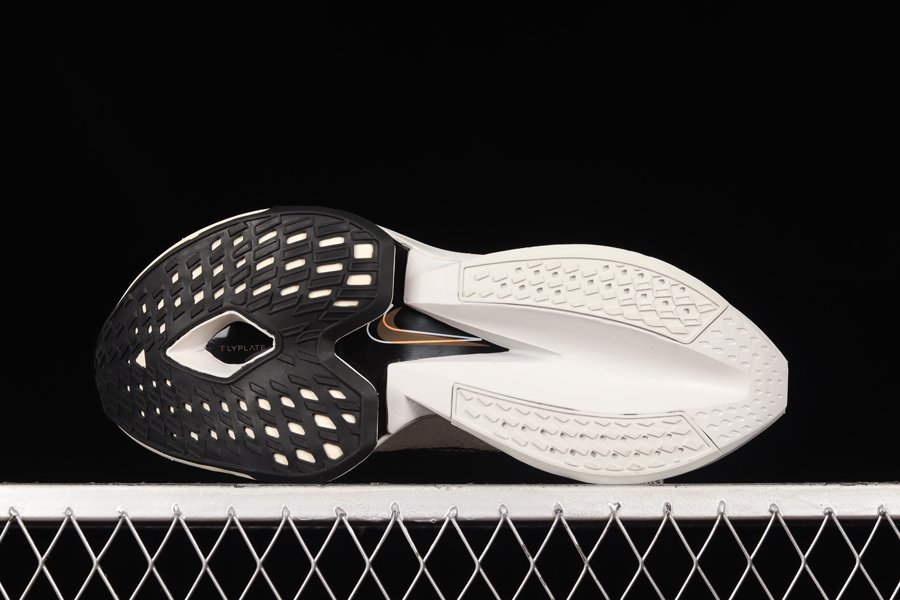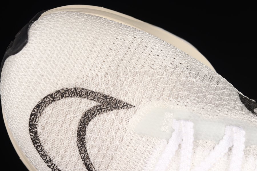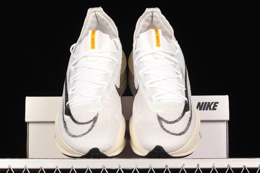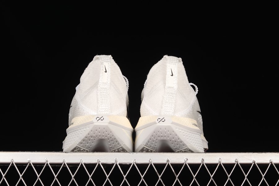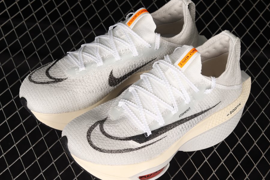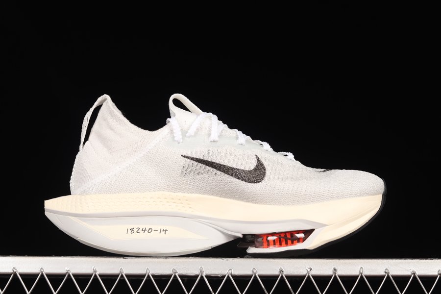 The launch colorway of the Air Zoom Alphafly NEXT% 2 is dubbed the “Prototype” and consists of a white upper with hits of orange on the tongue and outsole and red Zoom Air pod units. The “18240-14″ written on the medial midfoot is common notation in sneaker prototype testing.