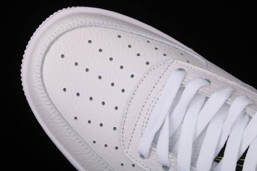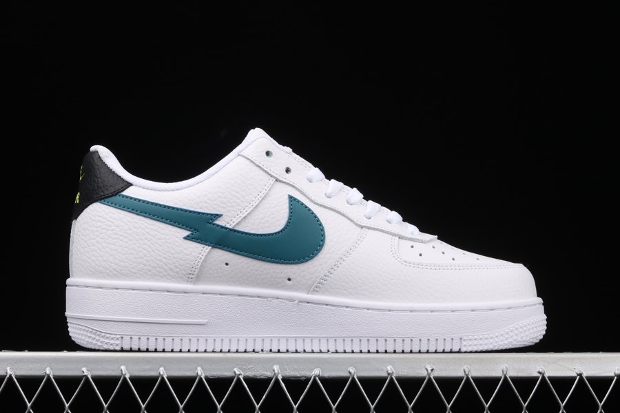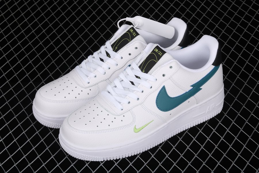 Dressed in a White, Aquamarine, Lime Glow, and Off Noir color scheme. This Nike Air Force 1 Low features a White tumbled leather upper with Aqua lightning bolt-shaped Swooshes on the sides highlighted with Lime Glow branding. The White mesh tongues are stamped with “20/21” with Black leather in the rear atop a White AF1 rubber sole completes the design.