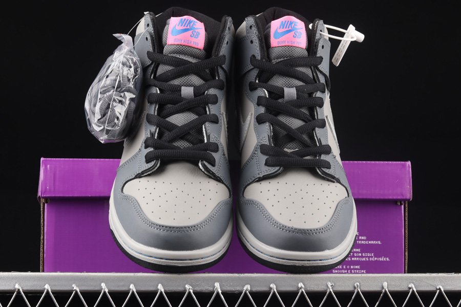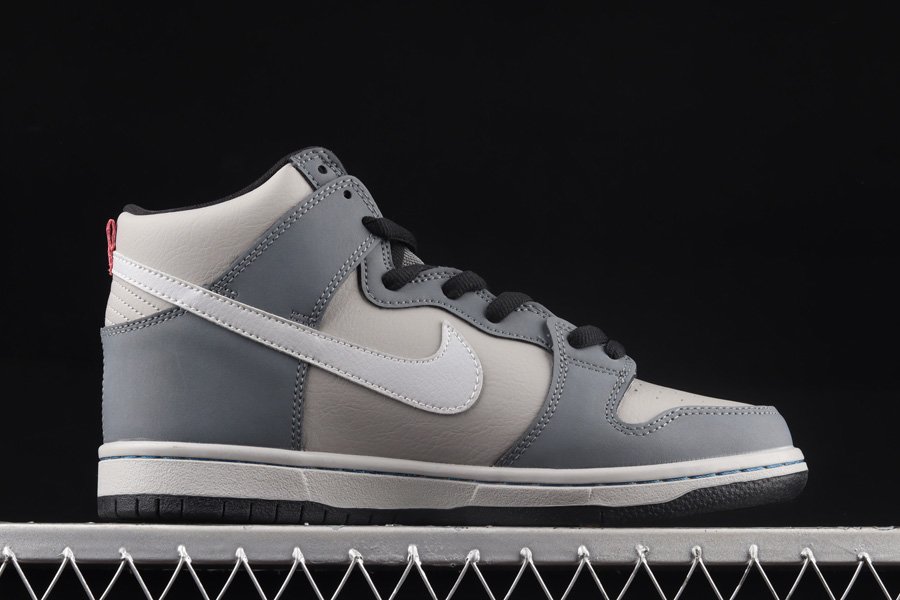 Flaunting a versatile neutral color scheme overall, the high-top boasts a light grey leather base that is complemented with darker grey suede overlays and mesh tongues. Contrasting white leather Swooshes provide a nice touch, while pops of pink on the tongue tags, heel tabs, and insoles add some vibrancy. Finally, a white midsole with blue stitching and black rubber outsole tops off the design.
