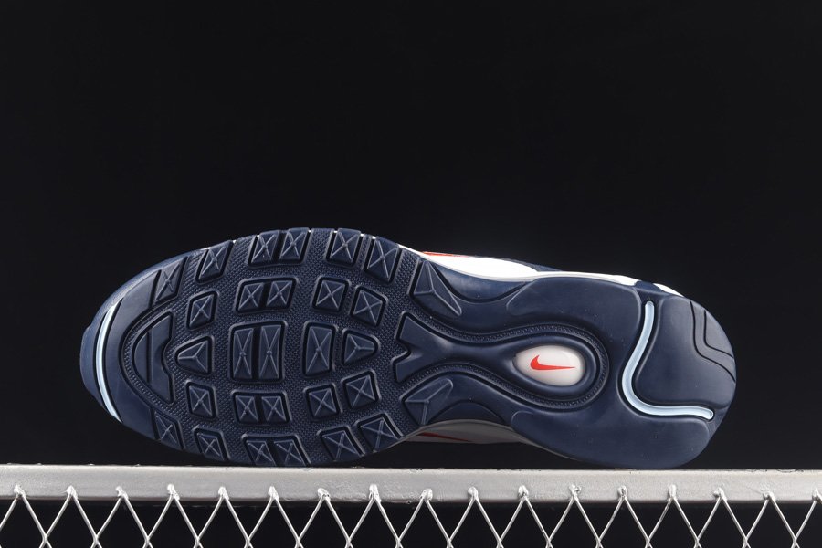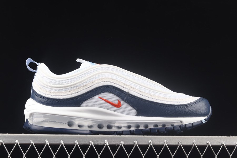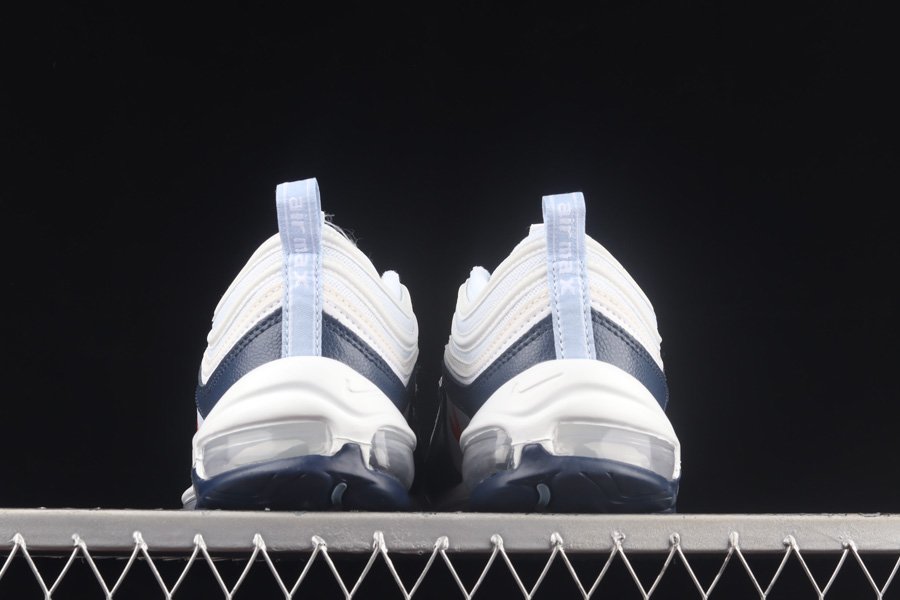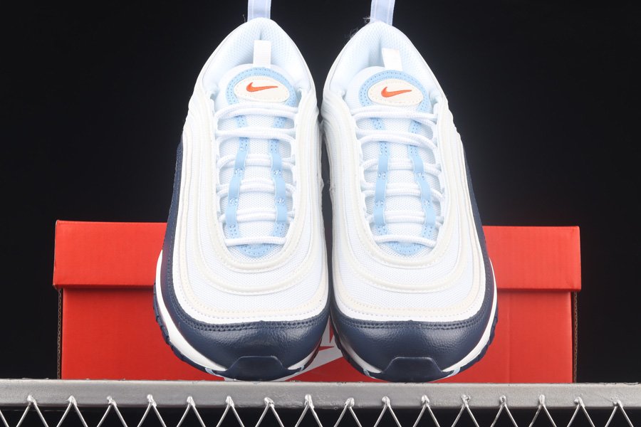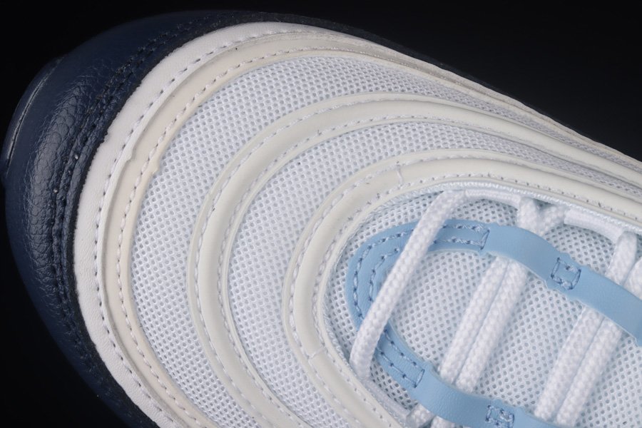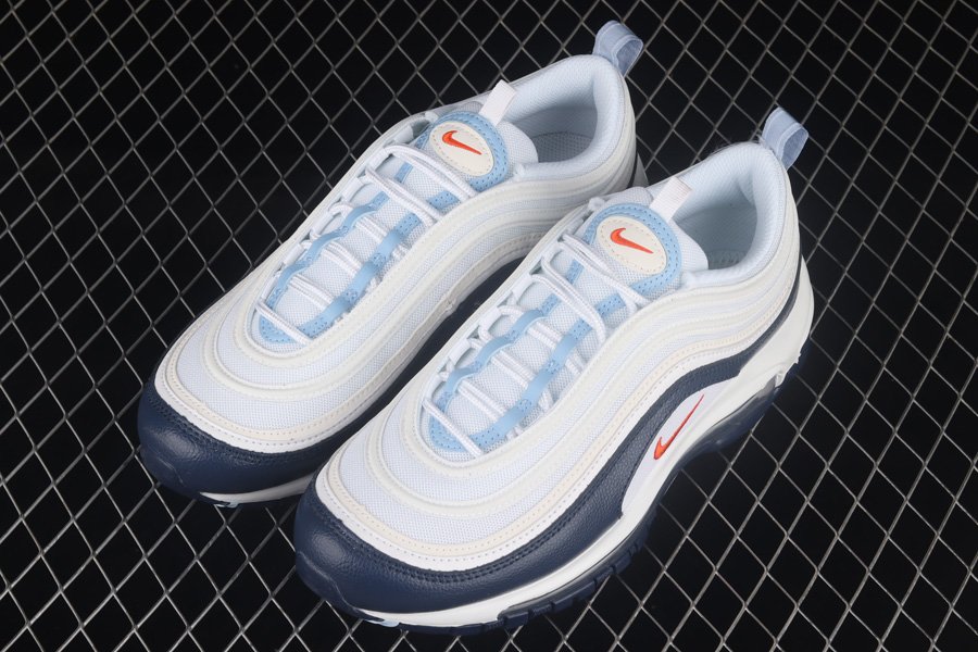Taking a look at this Air Max 97 the legendary silhouette starts off with a White mesh construction on the upper with matching leather overlays throughout. For contrast we see navy tumbled leather hit the signature mudguard with a light sky blue placed on the tongue and heel pull tabs. Red on the branding that appears on the side panels, tongue, and insoles along with 3M reflective detailing, a white midsole, and a navy rubber outsole finish things off on this Nike Air Max 97.