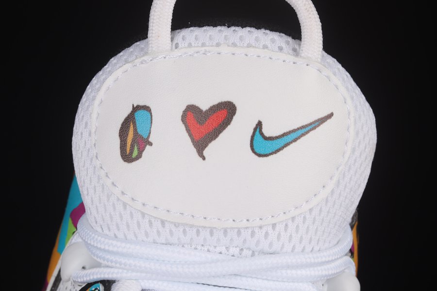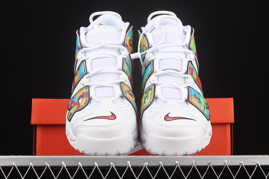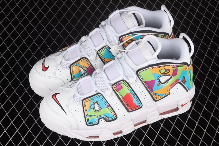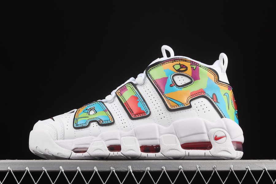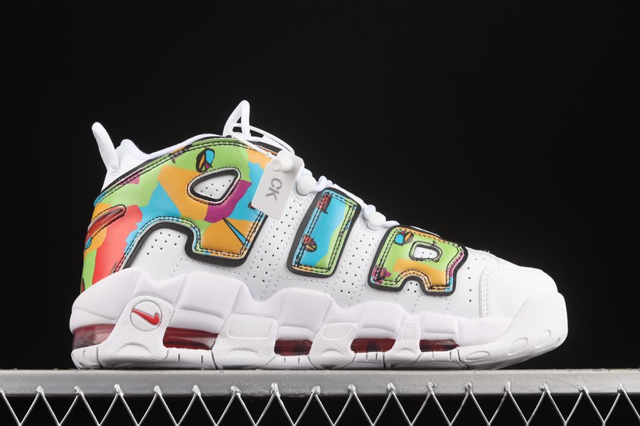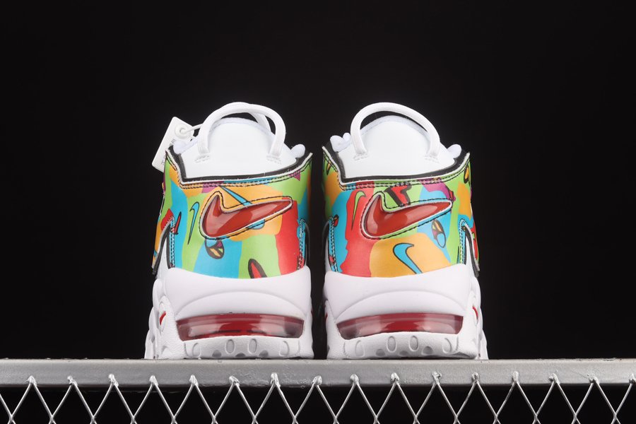 This edition of the Nike Air More Uptempo features classic white perforated leather uppers with the signature “AIR” overlay dressed in vibrant graphics from the collection. The “Peace, Love, Swoosh” logos are also displayed on the tongues and insoles. Additional Swoosh logos are shown on the toebox, counters, and soles.