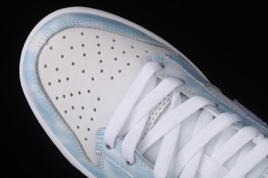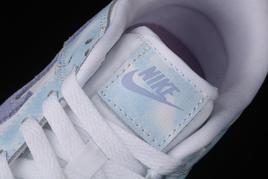 Working on a low-cut silhouette, the base works on pristine white tumbled leather overlays, mainly speaking of the perforated toe box, midfoot panels and heels. The counterparts, which are the mudguards, eyestays, rear panel, laces, heel tab, sock liner and most importantly the profile Swooshes across the sides, indulge in a washed purple tone that is very similar to the Nike Air Jordan 1 Hyper Royal.