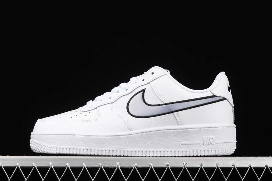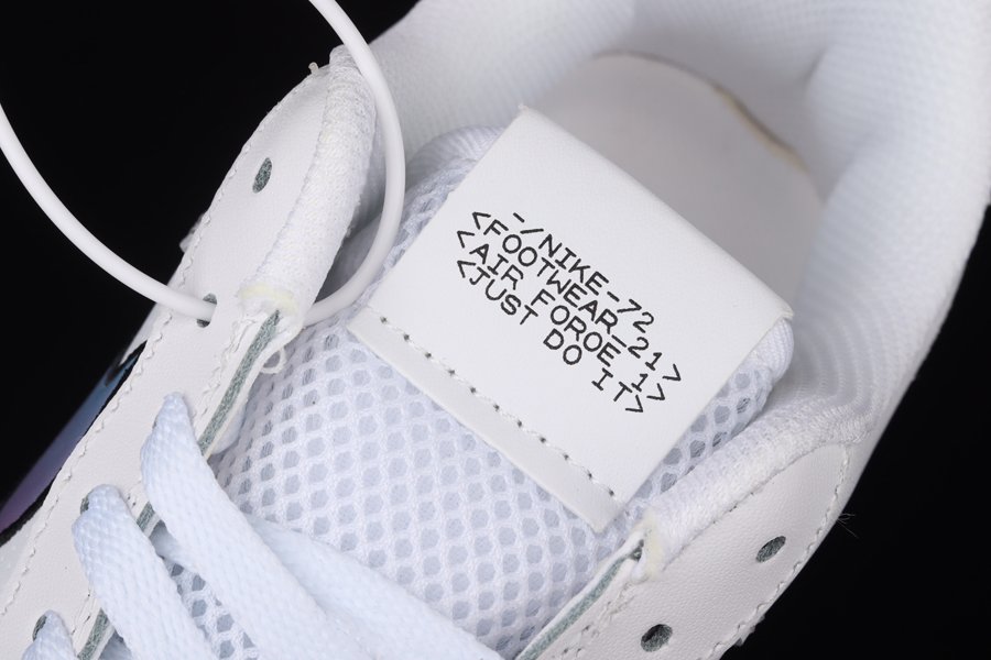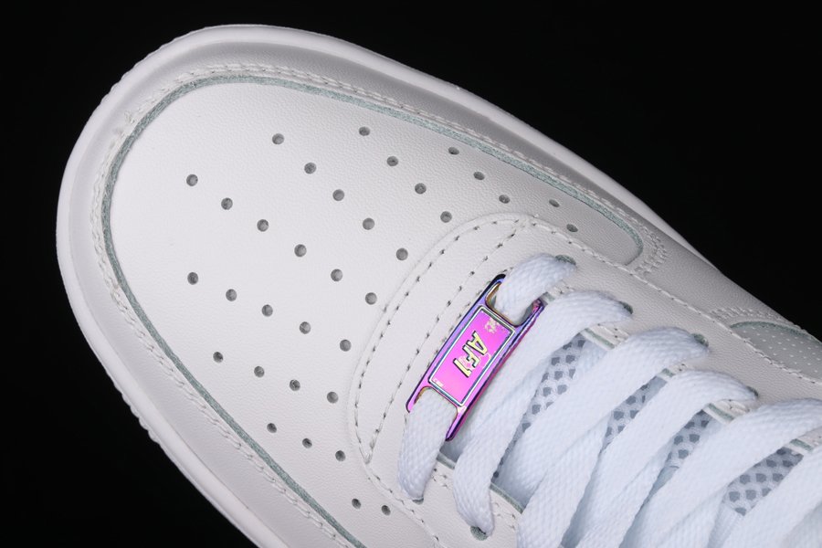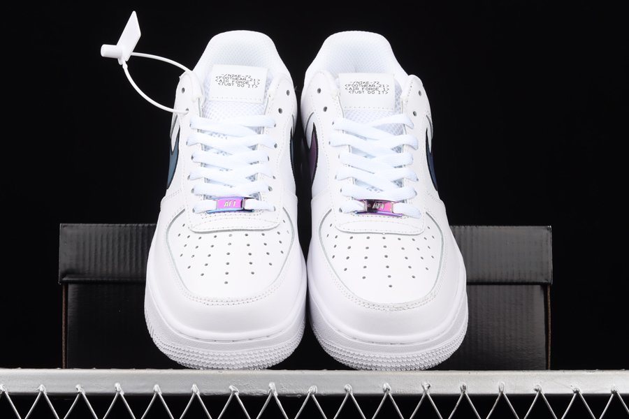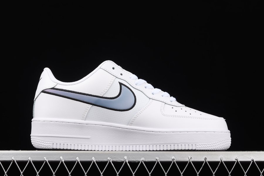 Taking the classic White leather Air Force 1 and giving the fan-favorite an updated look, Nike has added Iridescent detailing and a material change to the silhouette. Adding onto the classic White leather design, soft suede is used on the sides while iridescent Nike Swooshes grace the sides which are outlined in black to allow maximum eye exposure. Along with a white tongue, laces, and sockliner an iridescent lace dubrae shines on the forefoot while a black Nike Swoosh logo graces the heels.