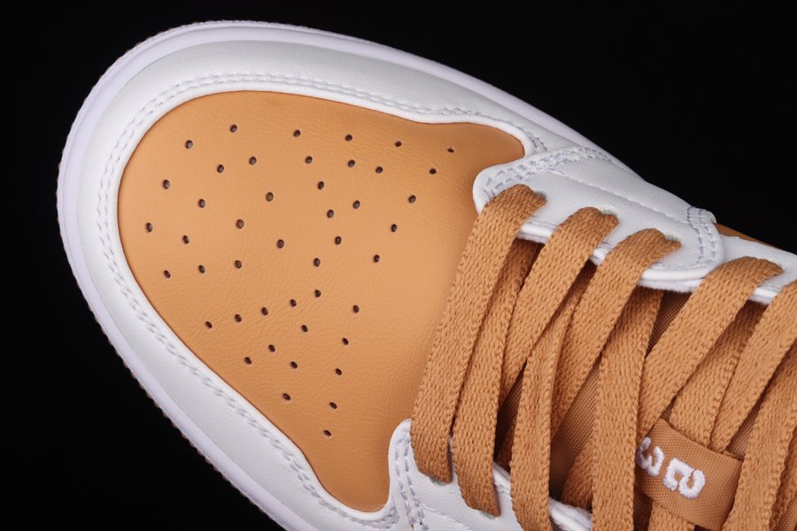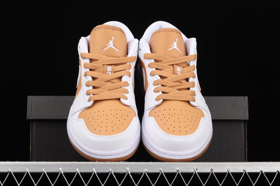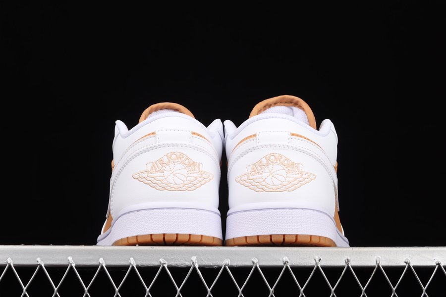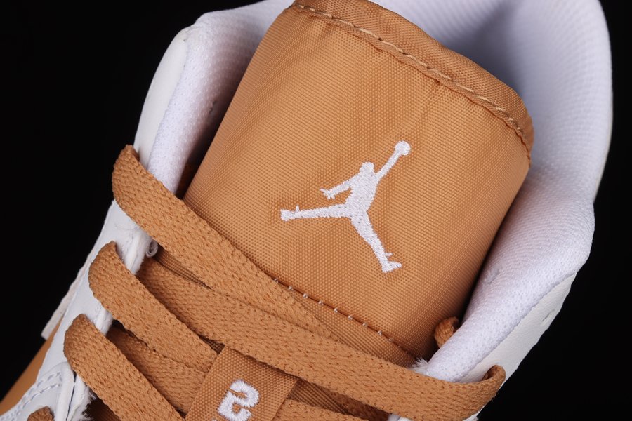 This low-top Air Jordan 1 comes with Tan leather on the toe box and panels. Next, the same shade hits the nylon tongue, laces, and Wings logo on the heel. Furthermore, White appears on the overlays, Swoosh logos, liner, and midsole. Lastly, a Gum outsole finishes the look.