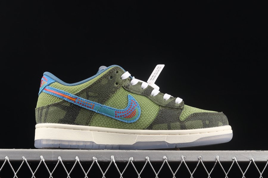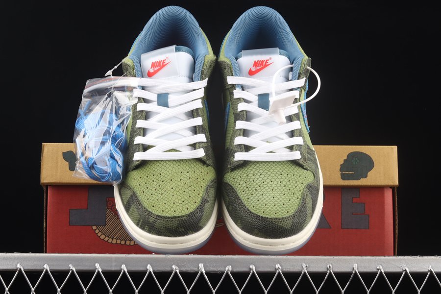 Sporting a vibrant, yet stylish aesthetic, the low-top silhouette dons a reptilian-inspired finish via a Green faux lizard skin upper alongside Black faux snakeskin overlays.