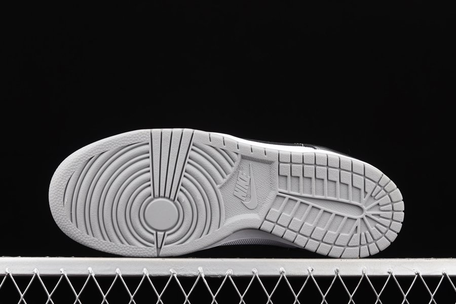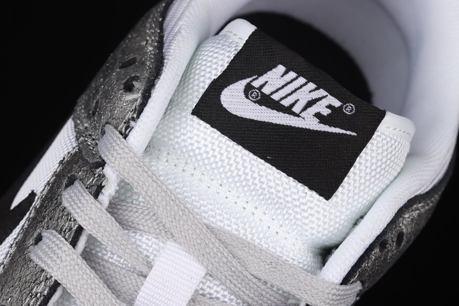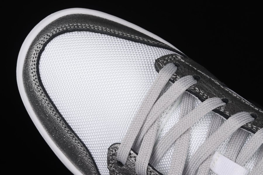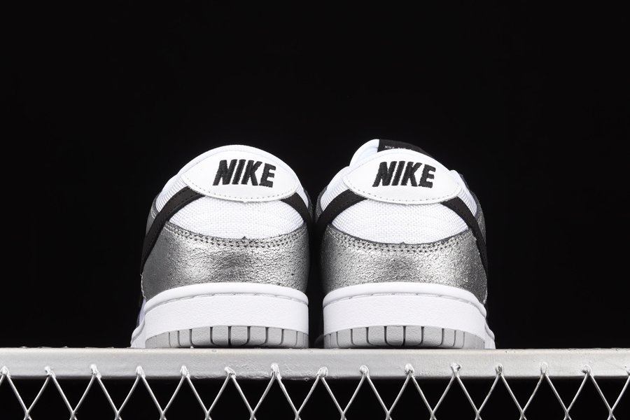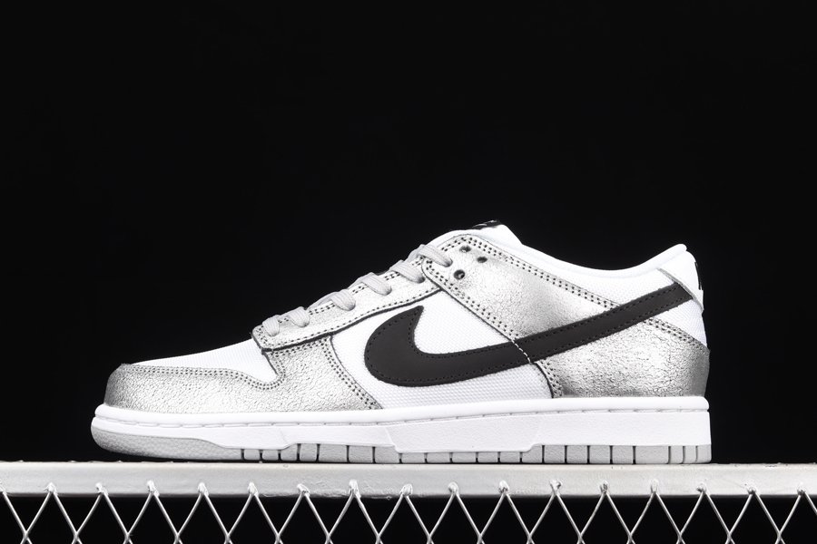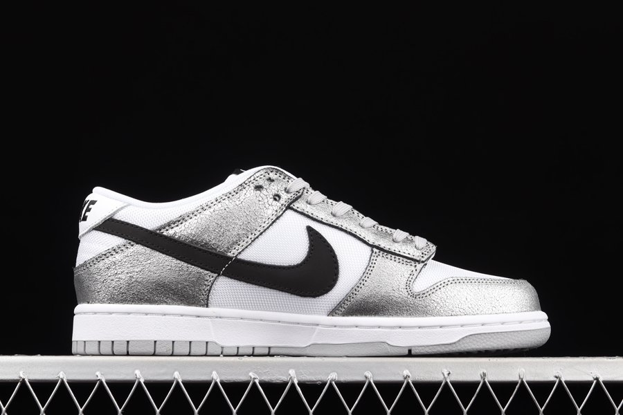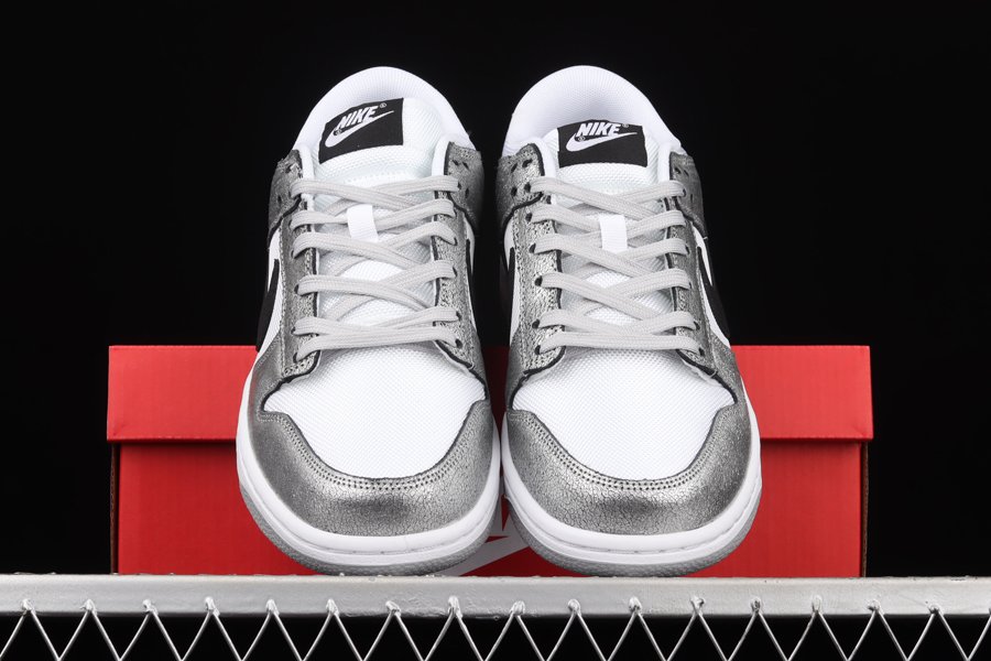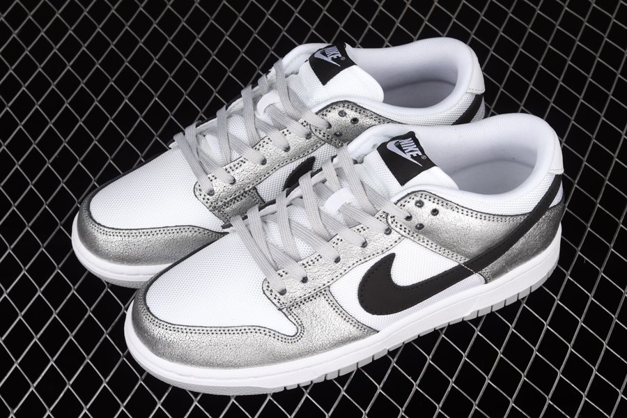 The Nike Dunk Low features White mesh across the uppers while Metallic Silver cracked leather adorns the overlays. Next, Black covers the Swoosh logos, tongue, and heel branding as well as the insole. Lastly, we have Grey laces and outsole while a White midsole finishes the look.