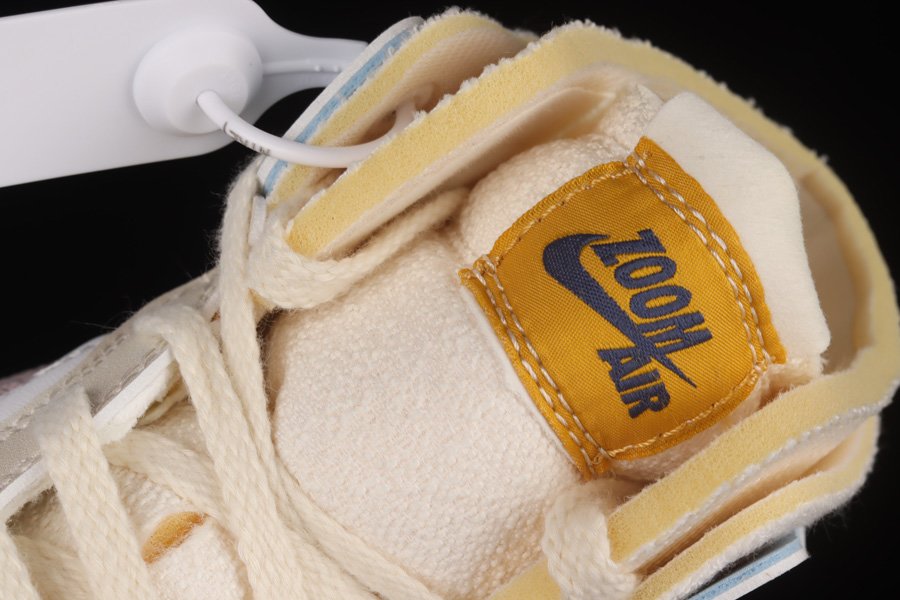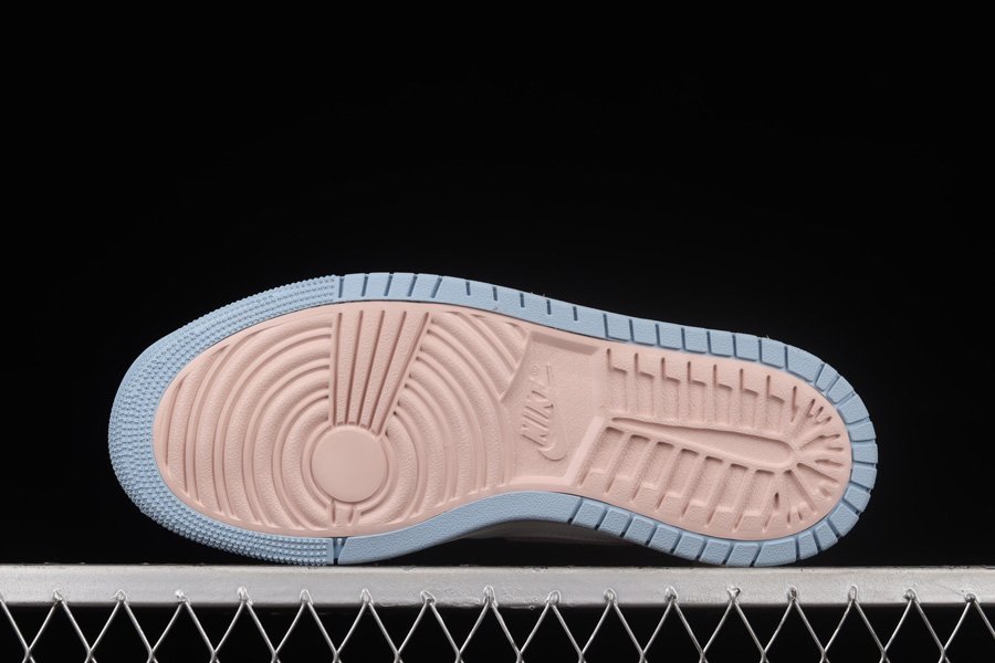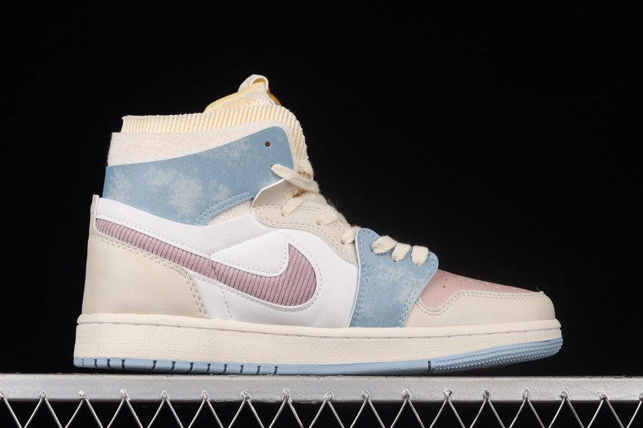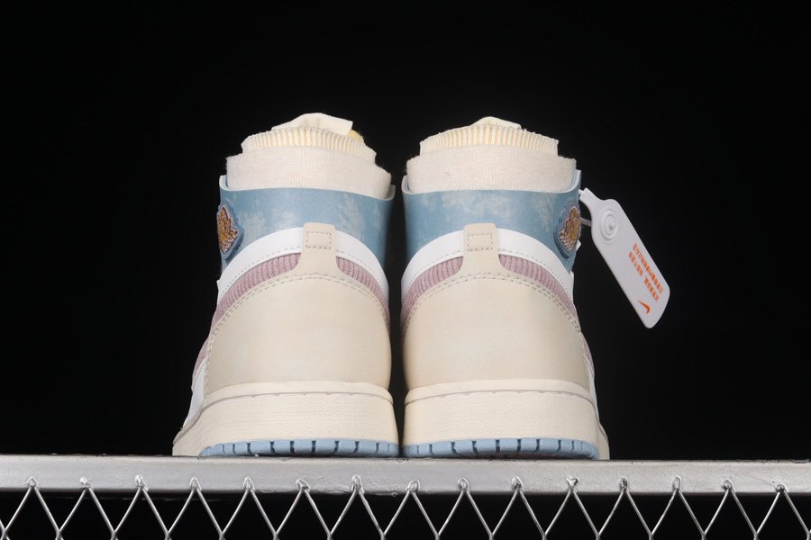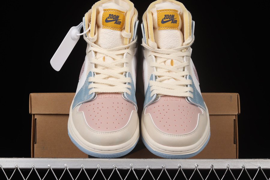 The Air Jordan 1 Zoom CMFT uses a mix of sail and light tan on the uppers in leather and nubuck with pastel pinks and blues used on the overlays. The Swoosh is seen in pastel pink using corduroy, with the Wings logo used in a badge for on the ankle flap. The toebox is seen in a blush pink with the Zoom Air branded tongue tag in canyon gold and navy on the deconstructed tongue. Zoom Air is featured in the insole for cushioning with Sail seen on the midsole and pastel blue and pink finish off the sneaker on the outsole.